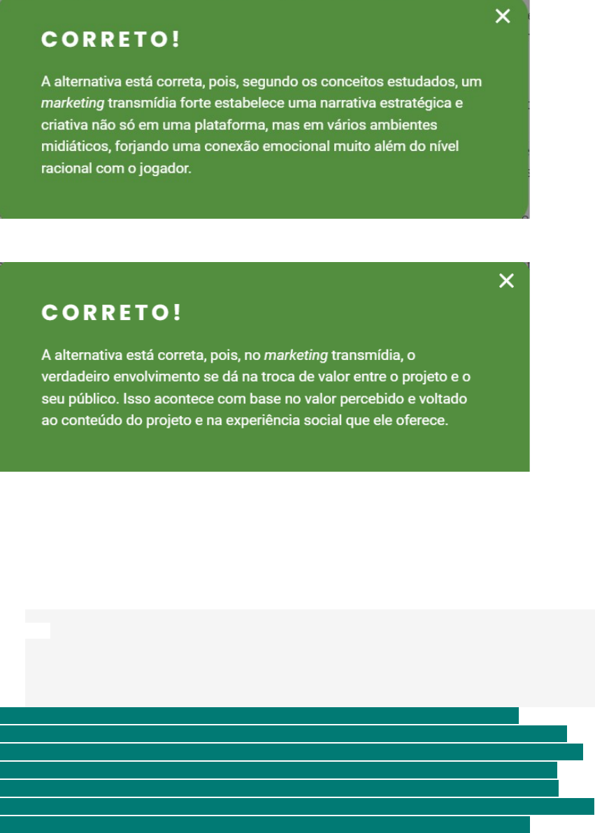 Atividade 1, alternativa D: Atividade 2, alternativa C: 1- O storytelling (ou contação de estórias) pode ser usado como recurso de marketing para conectar consumidores a uma marca, produto ou serviço, num processo que pode ter seu resultado de engajamento ainda mais intensificado com o apelo da interação transmidiática, ou seja, pelo uso de diferentes plataformas e mídias. Sabendo disso, podemos afirmar que o storytelling transmídia é: · Resposta correta diretamente ligado à integração de elementos narrativos em múltiplas mídias. · utilizado como recurso essencial de marketing desde antes da globalização. · recurso a ser explorado por todos os membros da equipe de desenvolvimento. · a arrecadação e o reinvestimento em um produto pelo fortalecimento da marca. · uma idealização de seu produto ou jogo a partir de seus elementos narrativos. Resposta correta. A alternativa está correta, pois podemos afirmar que o storytelling transmídia está, de fato, relacionado diretamente à contação de estórias, uma vez que permite integrar os elementos narrativos de uma ficção à sua dispersão estratégica em diferentes canais - de onde vem o conceito de transmídia, intensificando, com isso, a experiência do usuário. É importante lembrar que esses elementos narrativos, estando espalhados, deverão contribuir para a narrativa da qual foram originados, enriquecendo o seu universo. 2- Com a participação cada vez mais ativa dos usuários na produção e compartilhamento de conteúdo em diferentes canais e plataformas, houve mudança nos perfis desses usuários como consumidores, de modo que a tecnologia contribuiu com a democratização dessa relação entre as marcas/ produtos e seus consumidores. Sabendo disso, avalie as afirmações a seguir sobre marketing e engajamento com o público e assinale V para a(s) verdadeira(s) e F para a(s) falsa(s). I. ( ) Diante de uma conversão, a marca tende a ganhar um "fã" ao invés de um "consumidor" . II. ( ) As novas relações de marketing abusam do conceito de comunicação baseada em demografia. III. ( ) O público, para ser entretido, exige cada vez mais conteúdos produzidos com qualidade. IV. ( ) A estratégia de segmentação será especialmente importante para alcançar um público-alvo. Assinale a alternativa que apresenta a sequência correta. · V, F, V, V. · V, F, V, F. · V, V, F, F. · F, F, V, F. · F, V, F, V. Resposta correta. A sequência está correta, pois com a evolução do marketing e uso de estratégias como o storytelling transmídia, evoluiu-se do conceito de brand content e da relação passiva com o consumidor para uma aproximação mais humanizada, que tende a gerar clientes mais engajados e até fãs de uma marca. Para tanto, esses consumidores exigem cada vez mais conteúdos de boa qualidade com o qual possam interagir, sendo importante conhecer bem a segmentação do seu público, de modo a produzir conteúdos mais adequados. 3- Uma das maiores dificuldades do profissional de games, ao se formar, é descobrir por onde começar. Afinal, o desenvolvimento de um jogo é complexo, envolvendo artes visuais e sonoras, programação, enredo, gestão de projetos e marketing. Contudo, há algumas práticas da indústria que podem contribuir para que pequenos estúdios e desenvolvedores indie lancem e promovam seu jogo. Sobre as possíveis práticas de marketing para favorecer o lançamento de um jogo, avalie os itens a seguir. I. Criar parceria com canais de cobertura de jogos em diferentes mídias; II. Investir em gráficos 3D realistas para chamar a atenção do público; III. Produzir um jogo para diferentes plataformas, como PC (desktop) e mobile; IV. Apelar para um financiamento coletivo incluindo material de divulgação. Está correto o que se afirma em: · Resposta correta I e IV, apenas. · I e II, apenas. · II e III, apenas. · I, III e IV, apenas. · II, III e IV, apenas. Resposta correta. A alternativa está correta, pois, após o desenvolvimento de um jogo, é necessário verificar e validar se o que foi produzido está de acordo com o planejado e, em sequência, avançar com o plano de marketing, que pode incluir o desenvolvimento de um kit imprensa e material de divulgação (incluindo videoclipes, cartazes, histórias derivadas e outros elementos que expandem o universo do jogo). Esse material pode ser utilizado em eventos e ações promocionais, como as de financiamento coletivo, ou mesmo como chamariz junto à divulgação do jogo em diferentes canais de cobertura (mídias sociais, portais de notícia etc.). Estão corretas, portanto, as afirmativas I e IV. 4- Antes da proposta de desenvolvimento de um jogo, é necessário pensar nas estratégias e no material que serão mais adequados para a divulgação de seu lançamento. Um dos possíveis materiais envolve a elaboração de uma demo (demonstração), que pode ser interativa (jogável) ou não interativa. Sobre a apresentação de um jogo por meio de uma demo ou de um pitch, avalie as afirmações a seguir. I. Tanto a elaboração da demo quanto do pitch deverão filtrar bem os elementos do jogo que serão apresentados. PORQUE II. Possuem o mesmo propósito diante do acesso prévio, mas limitado, ao conteúdo do jogo: prender a atenção do público. Assinale a alternativa correta. · Resposta correta A asserção I é uma proposição verdadeira, e a asserção II é uma proposição falsa. · As asserções I e II são proposições verdadeiras, e a II é uma justificativa correta da I. · As asserções I e II são proposições falsas. · Sua resposta (incorreta) As asserções I e II são proposições verdadeiras, mas a II não é uma justificativa correta da I. · A asserção I é uma proposição falsa, e a II é uma proposição verdadeira. Sua resposta está incorreta. A alternativa está incorreta, pois a asserção I é uma proposição verdadeira, e a II é falsa, uma vez que, embora o tempo limitado para a apresenta