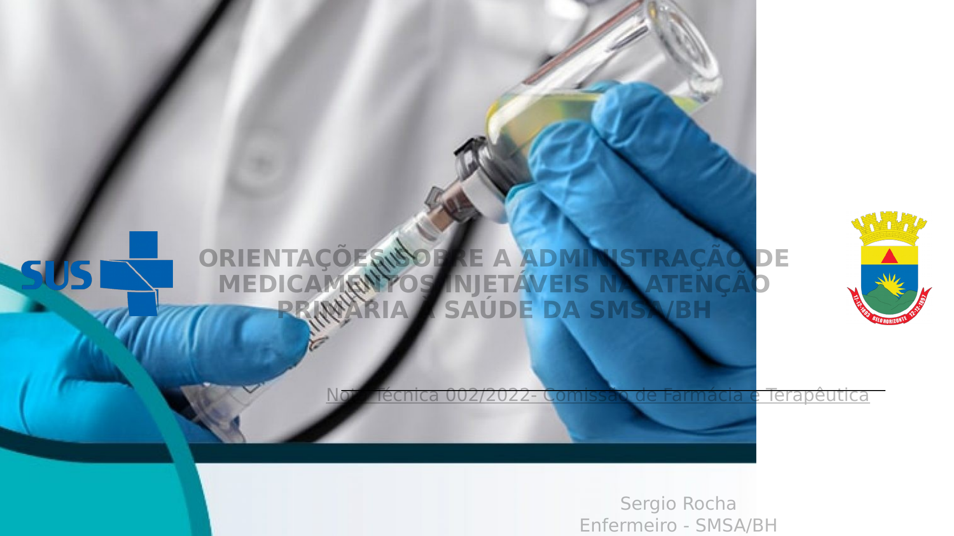 ORIENTAÇÕES SOBRE A ADMINISTRAÇÃO DE MEDICAMENTOS INJETÁVEIS NA ATENÇÃO PRIMÁRIA À SAÚDE DA SMSA/BH Nota Técnica 002/2022- Comissão de Farmácia e Terapêutica Sergio Rocha Enfermeiro - SMSA/BH Objetivo Orientar sobre a administração dos principais medicamentos injetáveis que constem ou não na Relação Municipal de Medicamentos Essenciais da SMSA-PBH na Atenção Primária à Saúde da SMSA/PBH. Relaciona-se também ao atendimento das receitas externas que demandam a administração em nossas unidades. QUADRO 1 - Orientações para administração de medicamentos PADRONIZADOS: Medicamento Padronizado Via de Administração Considerações/Fluxos Reações Adversas Benzipenicilina Benzatina 1.200.000 UI Benzipenicilina Procaina 300.000 UI + Benzipelinicila Potássica 100.000 UI Administrada no Centro de Saúde Rash cutâneo, urticária, prurido, edema de laringe, reações semelhantes à doença do soro (febre, calafrios, artralgia e prostração), inclusive possíveis reações anafiláticas. Cuidados na Administração Reconstituição: - 4 ml de água para injetáveis -2 ml de água para injetáveis. Aplicar e administrar de forma lenta e contínua para que a dor não seja insuportável nem haja entupimento da agulha. Não aplicar no músculo deltóide. Pode ser aplicada na região ventroglútea, dorsoglútea e vasto lateral da coxa. No casos em que houver a presença de silicone na região dorsoglútea, realizar administração em outros sítios de aplicação. Observações A alergia à penicilina na população em geral e nas gestantes é um evento muito raro. A possibilidade de reação anafilática à administração de Penicilina benzatina é de 0,002%, segundo o levantamento das evidências científicas constantes no relatório de recomendação da incorporação da penicilina para a prevenção da sífilis congênita, elaborada pela CONITEC . Por precaução, todos os pacientes deverão aguardar no local por 30 minutos após a aplicação. Medicamento Padronizado Via de Administração Considerações/Fluxos Reações Adversas Ceftriaxona 1g Administrada no Centro de Saúde Náuseas, vômitos, diarreia, desconforto abdominal, colite. Hepatoxicidade transitória. Reações alérgicas. Eritema multiforme. QUADRO 1 - Orientações para administração de medicamentos PADRONIZADOS: Cuidados na Administração EV: Reconstituição: 10 ml de água para injetáveis (concentração final: 100 mg/mL). EV direta: Reconstituir ceftriaxona 1 g em 10 ml de água para injetáveis e administrar lentamente por via endovenosa direta, velocidade de 1 ml/min de 3 a 5 minutos. Não deve ser misturada com outros antibióticos e soluções para evitar possíveis incompatibilidades, em especial soluções contendo cálcio Diluição: 40 ml de SF 0,9%, SG 5%. Administrar acima de 30 minutos em crianças e adultos. Em neonatos administrar acima de 60 minutos para diminuir o risco de encefalopatia por bilirrubinas (Kernicterus) Observações OBS1: A apresentação padronizada pela SMSA-PBH é a de 1000 mg uso endovenoso. Na SMSA-BH não é disponibilizada a lidocaína 1% sem vaso, diluente recomendado pelo fabricante para administração intramuscular. Portanto, a via de administração do medicamento nas unidades da SMSA-BH é EXCLUSIVAMENTE endovenosa OBS2: Nos casos em que o usuário for encaminhado para a UPA de referência, o medicamento será fornecido pela unidade onde será feita a administração (Vide ANEXO 1). Medicamento Padronizado Via de Administração Considerações/Fluxos Reações Adversas Ganciclovir 1mg/ml NÃO poderá ser administrado no Centro de Saúde. Para usuários com HIV/AIDS: deve ser administrado no Hospital-dia do Centro de Treinamento e Referência em Doenças Infecciosas e Parasitárias (CTR DIP-Orestes Diniz) ou no Hospital Eduardo de Menezes. Em caso de administração nos feriados, o Hospital-dia deve seguir o fluxo de encaminhamento às UPAs pré-estabelecidas, segundo informe técnico específico. QUADRO 1 - Orientações para administração de medicamentos PADRONIZADOS: Medicamento Padronizado Via de Administração Considerações/Fluxos Reações Adversas Gentamicina 40 mg/ml Administrada no Centro de Saúde - Cardiovascular: edema, hiper/hipotensão. - Sistema nervoso central: ataxia, confusão, depressão, convulsões, vertigens e outros. - Neuromusculares e esqueléticas: artralgia, instabilidade da marcha, espasmos musculares e outros. - Ocular: distúrbios visuais. - Auditiva: deficiência/perda auditiva - Respiratório: dispnéia, edema de laringe, fibrose pulmonar, depressão respiratória. QUADRO 1 - Orientações para administração de medicamentos PADRONIZADOS: Cuidados na Administração IM profunda: não diluir. EV: Diluir em 50-200 ml de SF 0,9%, SG 5% ou Ringer Lactato. Infundir em 30 a 120 minutos. Concentração máxima: em situações de restrição hídrica, a gentamicina pode ser administrada diretamente sem diluição em período de 2-3 minutos Medicamento Padronizado Via de Administração Considerações/Fluxos Reações Adversas Meglumina, antimoniato 1,5g (81 mg de antimônio/ml 300mg de meglumina/ml Poderá ser administrada no Centro de Saúde. Nos finais de semana e feriados o paciente deve ser encaminhado para administração na UPA. Deve-se articular com a Farmácia Regional de Referência para envio prévio das ampolas à UPA para uso nos finais-de-semana e feriados. Caso o medicamento não seja utilizado, a farmácia da UPA deve comunicar à Farmácia Regional de Referência Cardiovasculares: bradicardia (raro), parada cardíaca (raro), hipotensão, síncope, arritmias, anormalidades no ECG. - SNC: calafrios, tonturas, febre. - Gastrointestinal: dores abdominais, náuseas, vômitos. - Reações anafiláticas, reações de hipersensibilidade (ex:sudorese, rubor, prurido, urticária, erupção cutânea, artralgia, desconforto respiratório e colapso circulatório). QUADRO 1 - Orientações para administração de me