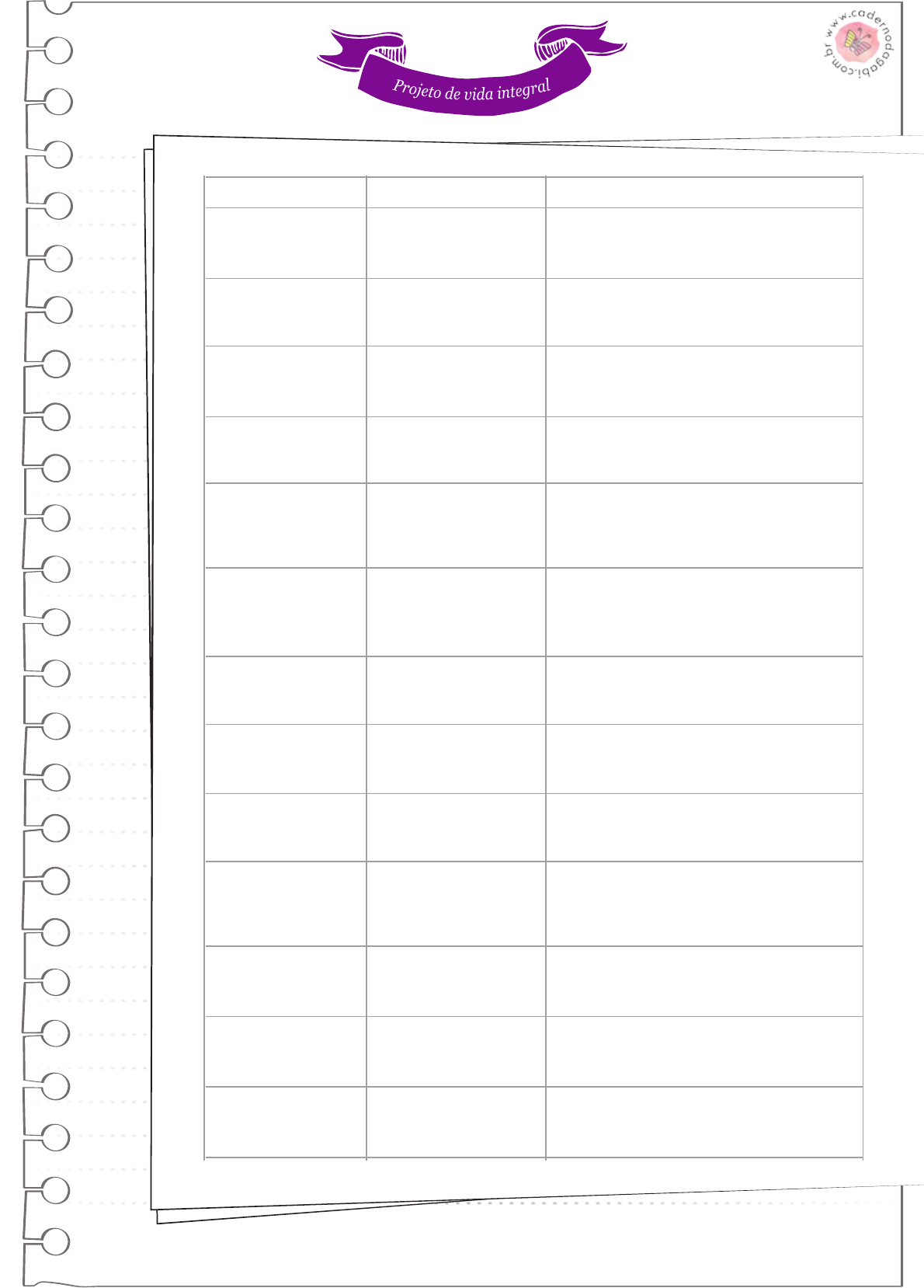 x 60 x Caderno do Eu Exercício 26 O que você pode fazer para ter um corpo saudável? Ex. sono, alimentação, exercícios físicos... O que deseja aprender? Que livros, cursos? Ir ao teatro, museu, cinema? Como quer lidar com as emoções? Quais sentimen- tos você quer nutrir na sua vida? De que forma pretende viver e expressar a sua espiritualidade? O que quer melhorar? Como entrar em contato com sua essência? Como investir no autoconhecimento e na autoestima? Como deseja se relacionar com as pessoas? De que modo se comunica e interage com a sociedade e a comunidade, em geral? Como quer se relacionar com a mãe, pai, avós, irmãos, tios, primos... Como cultivar as amizades e conquistar novas? O que espera dos amigos? O que tem para oferecer a eles? O que pretende viver na área amorosa, íntima e afetiva? Metas para crescer na carreira? Qual sua motivação, sonhos, objeti- vos? Está na área que realmente gosta? Como estão seus recursos materiais? Como estão os gastos e lucros? Como quer investir o dinheiro? Qual é seu hobby? Que atividades trazem bem-es- tar? Quais seus momentos de lazer? Como é a sua relação com o mundo natural? Como contribuir com o meio ambiente? ÁREA DA VIDA SAÚDE FÍSICA SAÚDE INTELECTUAL SAÚDE EMOCIONAL SAÚDE ESPIRITUAL EU - RELACIONAMENTO COM SI MESMO RELACIONAMENTO COM OS OUTROS FAMÍLIA AMIZADES RELACIONAMENTO AMOROSO TRABALHO/PROFISSÃO FINANCEIRO LAZER NATUREZA EXPLICAÇÃO OBJETIVOS