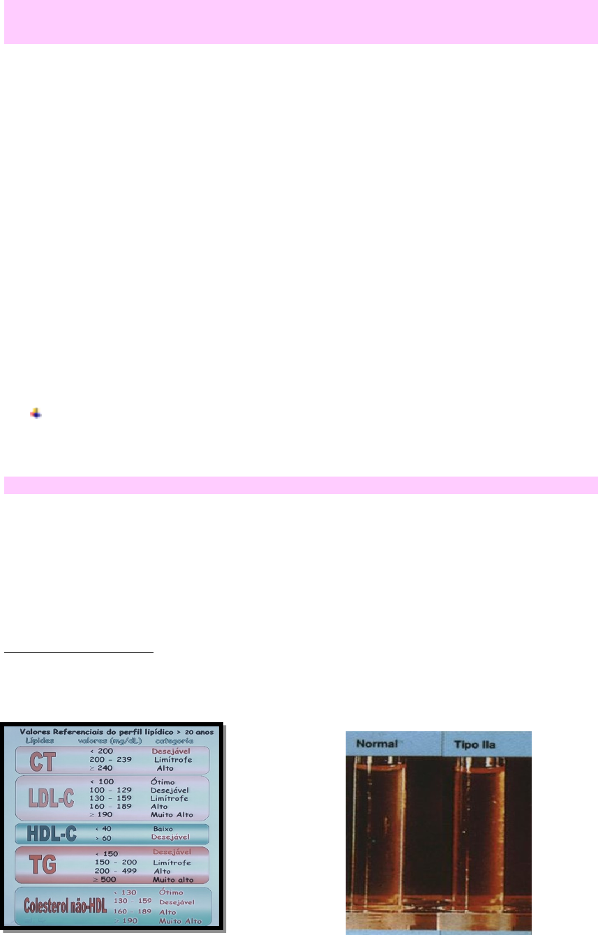 DISLIPIDEMIAS Diretrizes, Aspectos Clínicos e Laboratoriais DISLIPIDEMIAS ALTERAÇÕES DO METABOLISMO LIPÍDIOS Quais lipídeos? Funções? · Colesterol (membranas cels, hormônios, sais biliares, vit D) · Triglicerídeos (reserva energética) Importância clínica? · Colesterol deposito na parede arterial – Aterosclerose- Doença cardiovascular (DCV) · Triglicerídeos deposito nos tecidos- obesidade, esteatose e pancreatite · Elevação de colesterol e triglicerídeos no plasma ou diminuição dos níveis de HDL que contribuem para a aterosclerose · As causas podem ser primárias (genéticas) ou secundárias · O diagnóstico é realizado pela medida das concentrações totais de colesterol, triglicerídeos e lipoproteínas individuais · O tratamento envolve alterações alimentares, atividade física e fármacos hipolipemiantes · CLASSIFICAÇÃO DAS DISLIPIDEMIAS ETIOLÓGICA · Dislipidemia primária causas genéticas · Dislipidemia secundária doenças, medicamentos, meio ambiente DISLIPIDEMIA FENOTIPICA OU PRIMÁRIA: 1. Hipercolesterolemia isolada: LDL – C (> 160 mg/Dl) 2. Hipertrigliceridemia isolada: TG (> 150 mg/Dl) 3. Hiperlipidemia mista: LDL – C (> 160 mg/Dl) e TG (> 150 mg/Dl) 4. HDL-C baixo: F < 50mg/dL e M < 40 mg/dL 1. HIPERCOLESTEROLEMIA ISOLADA/FAMILIAR Hipercolesterolemia familiar (herança autossômica dominante) Diagnóstico Laboratorial: Colesterol Total > 250 mg/dL (alto) LDL > 160 mg/dL (alto) TG normal Soro é límpido (jejum) CAUSAS: - Interação defeituosa entre o LDL e o receptor LDL - Mutações no gene da ApoB100 do LDL que reduz afinidade pelo receptor LDL - Defeitos no gene LDLR, que codifica o receptor de LDL SINAIS E SINTOMAS: -Deposição de colesterol em nível de córnea -Xantelasma – deposição de colesterol em nível de pálpebra -Xantoma tendinoso 2. HIPERTRIGLIERIDEMIA ISOLADA Diagnóstico Laboratorial · LDL- colesterol normal ligeiramente baixos · VLDL : ALTERADO · TG – 500-10.000 mg/dL · Soro com aspecto lipêmico TESTE DO QUILOMICRON Consiste em deixar o soro lipêmico por 12 horas em repouso a 4°C. Se os quilomícrons estiverem presentes, uma camada de creme se formará; o soro restante pode ser claro ou turvo indicando um excesso de VLDL. **Quilomicrons aparecem no plasma de 2 a 10 horas após alimentação (por isso a importância do jejum de 12 horas). CAUSAS: - Mutações no gene da LPL - Deficiência de Apo CII Doença autossômica recessiva (rara) SINAIS E SINTOMAS · XANTOMAS ERUPTIVOS – TG >1.500mg/dL 3. HIPERLIPIDEMIA MISTA Diagnóstico Laboratorial Aumento de Colesterol total Aumento do LDL e VLDL – C Produção aumentada de APOB100 CAUSAS DO AUMENTO DO VLDL - Defeito na APO E que não se liga de maneira eficiente aos receptores hepáticos, levando o acúmulo de partículas remanescente. - Defeito genético na remoção de VLDL remanescente 4. HIPOALFALIPOPROTEINA (HDL-C BAIXO) Soro com aspecto límpido apresentando: · COLESTEROL NORMAL; · TG NORMAL ; · HDL BAIXO ( <30 mg/dL) CAUSAS PRIMÁRIAS DE DIMINUIÇÃO DO HDL-colesterol · DEFICIÊNCIA DE LCAT (COMPLETA OU PARCIAL) A LCAT (lecitina-colesterol aciltransferase) esterifica o colesterol no HDL, esse processo é importante no transporte reverso, pois os ésteres de colesteril são mais hidrofóbicos que o colesterol e continuam presos no núcleo do HDL até que sejam removidos pelo fígado. · DEFICIÊNCIA COMPLETA DE APO A1/ MUTAÇÃO NA APO A1 DISLIPIDEMIA SECUNDÁRIA: AUMENTO DE TG AUMENTO DE LDL-C DIMINUIÇÃO DO HDL-C · Síndrome Metabólica · Excesso de álcool · Obesidade · Gravidez · Hipotiroidismo · Insuficiência renal · Diuréticos · Betabloqueadores · Estrógenos · Anticoncepcionais orais · Síndrome de Cushing · Diabetes mellitus · Síndrome da Imunodefie. Adquirida · Hipotiroidismo · Sindrome Nefrótica · Hepatopatia · Colestase · Anorexia nervosa · Deficiência de M. Crescimento · Porfiria aguda · Síndrome metabóliea · Sedentarismo · Tabagismo. · Diabetes mellitus · Obesidade: · Hipertrigliceridemia Unificar os valores e referência. Alterações em termos ‘’desejável’’ ao invés de ‘’ótimo’’ deixar o paciente mais atento Alertar INDICATIVO no laudo do paciente o diagnóstico de Hipercolesterolemia familiar resultado com alteração – recebe alerta para a pesquisa de HF O tempo de jejum deve ser de acordo com o parâmetro: 12horas para TG e LDL-C Sem jejum prévio quando solicitado isoladamente CT, APO B, APO A-I e HDL –C O LDL-C pode ser calculado com TG até 400mg/dl ou dosado por metodologia direta Evitar a ingestão de álcool (72h) e atividade física (24h) CÁLCULOS: · Colesterol total (CT) = LDL-c + HDL-c + VLDL-c · Colesterol não-HDL = CT - HDL-c · TG: TG= LDL – CT – HDL (TG/5) TG= ( ) X (TG/ 5) TG= ( ) · LDL-C EQUAÇÃO DE FRIEDWALD LDL-c = CT – ( HDL-c + VLDL-c) *Formula não é utilizada quando dosagem de TG e maior ou igual a 400mg/dL COLESTEROL NÃO-HDL Coleta em jejum 12h Representa o número total de partículas aterogênicas (Níveis de Apo B) Melhor estimativa de risco em comparação com LDL-c. Quando TG elevado · No laboratório, TG elevado interfere muito nas dosagens (atrapalha precipitação HDL, soro lipemico, na leitura etc...) · Colesterol não-HDL não depende do TG, apenas do CT e HDL-c . DISLIPIDEMIAS: EXAMES BIOQUÍMICOS Segundo a V Diretriz Brasileira de Dislipidemias e Prevenção da Aterosclerose: · A fração colesterol não-HDL é usada como estimativa do número total de partículas aterogênicas no plasma (VLDL + IDL + LDL) e refere-se também a níveis de apo B. · O colesterol não-HDL é calculado facilmente pela subtração do HDL-colesterol do colesterol total: Colesterol não-HDL = Colesterol total – HDL-colesterol. · O colesterol não-HDL pode fornecer melhor estimativa do risco em comparação com o LDL-C, principalmente nos casos de hipertrigliceridemia associada ao diabetes, à síndrome metabólica ou à doença renal." COL