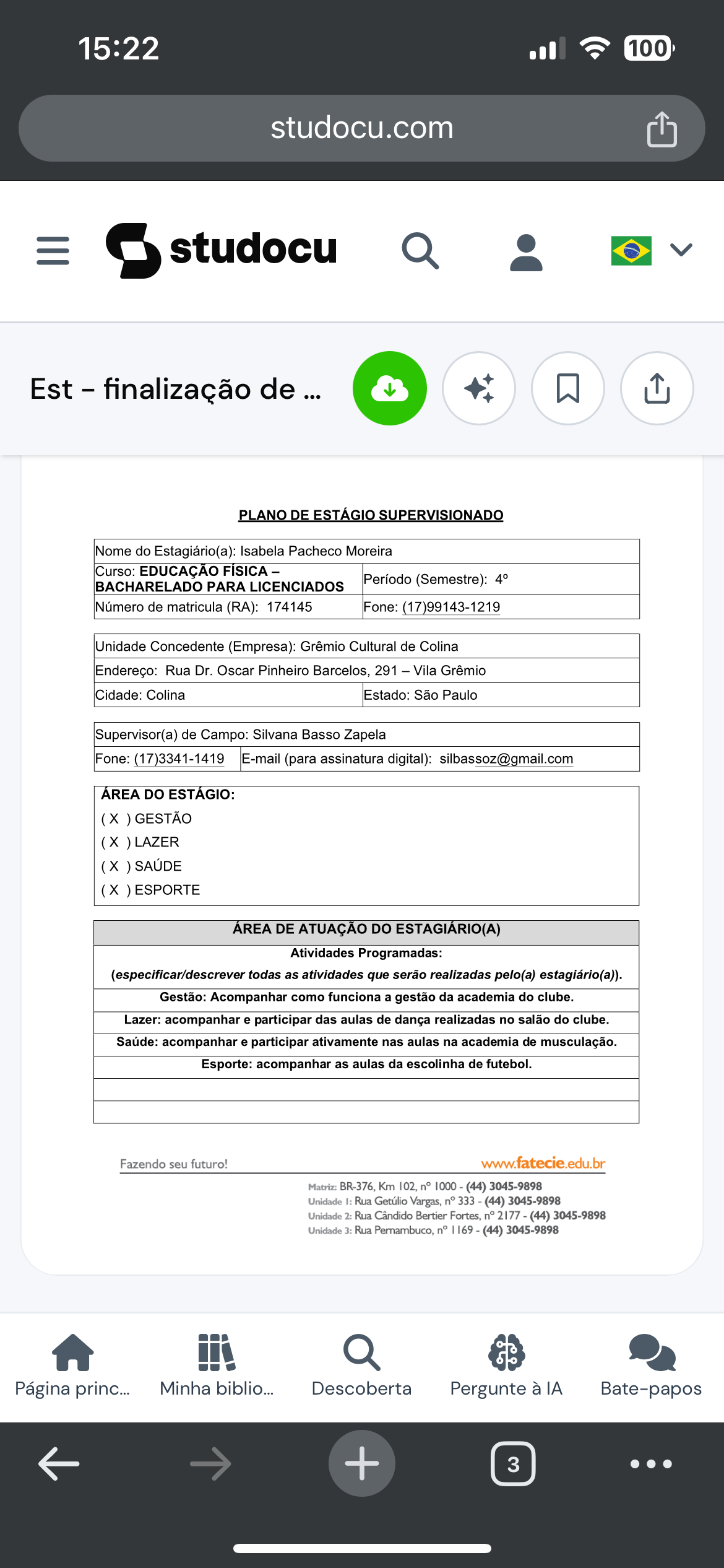 15:22 100 studocu.com studocu Est - finalização de ... PLANO DE ESTÁGIO SUPERVISIONADO Nome do Estagiário(a): Isabela Pacheco Moreira Curso: EDUCAÇÃO FÍSICA - BACHARELADO PARA LICENCIADOS Período (Semestre): Número de matricula (RA): 174145 Fone: (17)99143-1219 Unidade Concedente (Empresa): Grêmio Cultural de Colina Endereço: Rua Dr. Oscar Pinheiro Barcelos, 291 - Vila Grêmio Cidade: Colina Estado: São Paulo Supervisor(a) de Campo: Silvana Basso Zapela Fone: (17)3341-1419 E-mail (para assinatura digital): silbassoz@gmail.com ÁREA DO ESTÁGIO: ( X ) GESTÃO ( X ) LAZER ( X ) SAÚDE ( X ) ESPORTE ÁREA DE ATUAÇÃO DO ESTAGIÁRIO(A) Atividades Programadas: (especificar/descrever todas as atividades que serão realizadas pelo(a) estagiário(a)). Gestão: Acompanhar como funciona a gestão da academia do clube. Lazer: acompanhar e participar das aulas de dança realizadas no salão do clube. Saúde: acompanhar e participar ativamente nas aulas na academia de musculação. Esporte: acompanhar as aulas da escolinha de futebol. Fazendo seu futuro! www.fatecie.edu.br Matriz: BR-376, Km 102, 1000 - (44) 3045-9898 Unidade Rua Getúlio Vargas, 333 Unidade 2: Rua Cândido Bertier Fortes, 2177 (44) 3045-9898 Unidade 3: Rua Pernambuco, Página princ... Minha biblio... Descoberta Pergunte à IA Bate-papos + 3