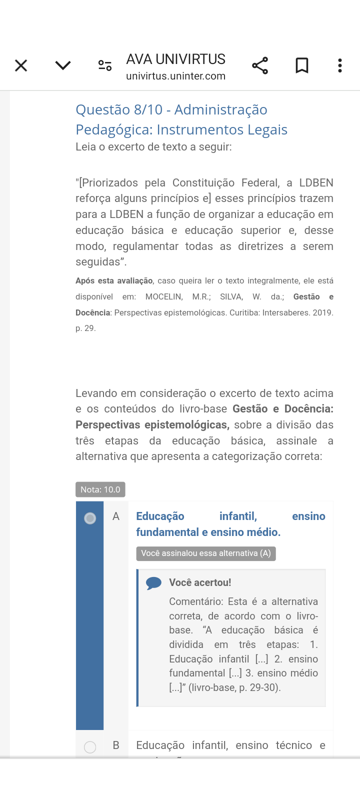 AVA UNIVIRTUS X univirtus.uninter.com Questão 8/10 - Administração Pedagógica: Instrumentos Legais Leia o excerto de texto a seguir: "[Priorizados pela Constituição Federal, a LDBEN reforça alguns princípios e] esses princípios trazem para a LDBEN a função de organizar a educação em educação básica e educação superior e, desse modo, regulamentar todas as diretrizes a serem seguidas". Após esta avaliação, caso queira ler o texto integralmente, ele está disponível em: M.R.; SILVA, W. da.; Gestão e Docência: Perspectivas epistemológicas. Curitiba: 2019. Levando em consideração o excerto de texto acima e os conteúdos do livro-base Gestão e Docência: Perspectivas epistemológicas, sobre a divisão das três etapas da educação básica, assinale a alternativa que apresenta a categorização correta: Nota: 10.0 A Educação infantil, ensino fundamental e ensino médio. Você assinalou essa alternativa (A) Você acertou! Comentário: Esta é a alternativa correta, de acordo com o livro- base. "A educação básica é dividida em três etapas: 1. Educação infantil [...] 2. ensino fundamental [...] 3. ensino médio [...]" (livro-base, p. 29-30). Educação infantil, ensino técnico e