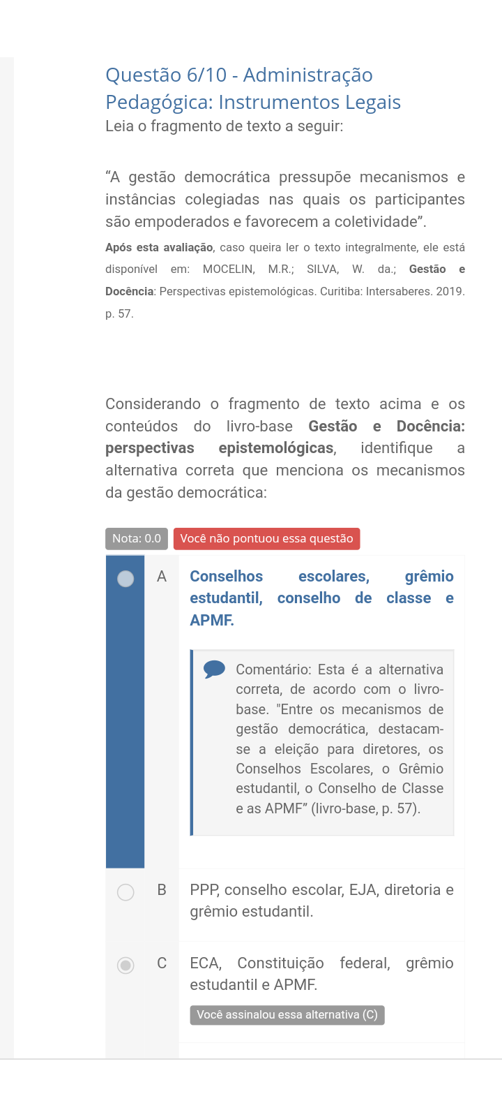 Questão 6/10 - Administração Pedagógica: Instrumentos Legais Leia o fragmento de texto a seguir: "A gestão democrática pressupõe mecanismos e instâncias colegiadas nas quais os participantes são empoderados e favorecem a coletividade". Após esta avaliação, caso queira ler O texto integralmente, ele está disponível em: MOCELIN, M.R.; SILVA, W. da.; Gestão e Docência: Perspectivas epistemológicas. Curitiba: 2019. Considerando o fragmento de texto acima e os conteúdos do livro-base Gestão e Docência: perspectivas epistemológicas, identifique a alternativa correta que menciona os mecanismos da gestão democrática: Nota: 0.0 Você não pontuou essa questão A Conselhos escolares, grêmio estudantil, conselho de classe e APMF. Comentário: Esta é a alternativa correta, de acordo com livro- base. "Entre os mecanismos de gestão democrática, destacam- se a eleição para diretores, os Conselhos Escolares, o Grêmio estudantil, o Conselho de Classe e as APMF" (livro-base, p. 57). B PPP, conselho escolar, EJA, diretoria e grêmio estudantil. C ECA, Constituição federal, grêmio estudantil e APMF. Você assinalou essa alternativa (C)