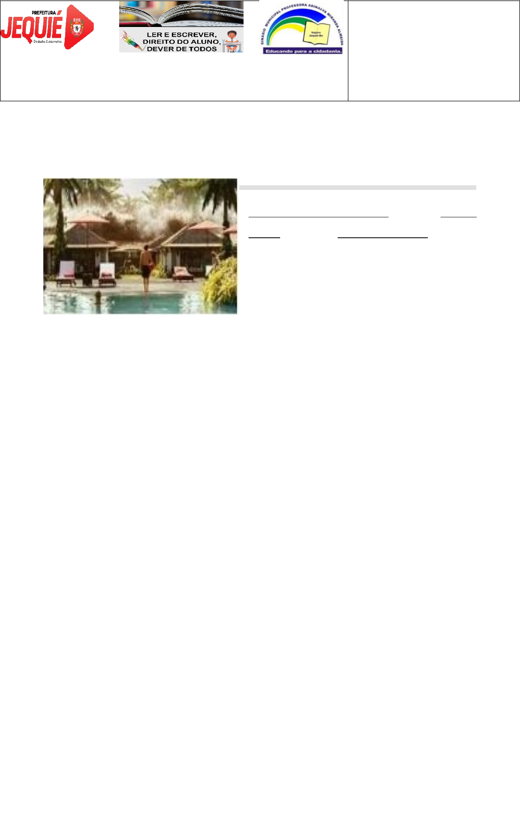 GINÁSIO MUNICIPAL PROFª. ADINALVA MIRANDA ALMEIDA ESTUDANTE: _______________________________________ COMPONENTE CURRICULAR: CIÊNCIAS DATA: _____/_____/_____ PROFº : CRISTIANE TURMA: 7º ano FILME: “O Impossível” Baseado em fatos reais, Maria (Naomi Watts), Henry (Ewan McGregor) e seus três filhos estão aproveitando suas férias de inverno na Tailândia. Mas na manhã do dia 26 de dezembro de 2004, enquanto todos relaxam na piscina do hotel após as festividades de Natal, um tsunami de proporções devastadoras atinge a costa. A família terá de lutar, ao lado de dezenas de milhares de estranhos, para se manter unida. Diante de uma das maiores tragédias de todos os tempos, sentimentos como compaixão, bondade e coragem irão aflorar e dar forças para enfrentar uma situação tão adversa. 1 – Qual o tema do filme? O que os realizadores do filme tentaram nos contar? Eles conseguiram passar sua mensagem? Justifique sua resposta. 2 – Você assimilou/aprendeu alguma coisa com este filme? O que? 3 – O que retrata o filme O Impossível? 4 – Do que você mais gostou neste filme? Por quê? 5 -Qual é a mensagem que o filme O Impossível? 6 – Qual o seu personagem favorito no filme? Por quê? 7 – Qual é o personagem de que você menos gostou? Por quê? 8 – O que Maria vomita no filme O Impossível? 9 – O que aconteceu com a família de O Impossível? 10 – Todos os eventos retratados no filme são verdadeiros? Descreva as cenas que você achou especialmente bem coerentes e fiéis à realidade. Quais sequências que parecem menos realistas? Por quê 11 – Qual a síntese da história contada pelo filme abordando as dificuldades de sobreviver em meio a tamanho acidente natural; image4.jpeg image1.png image2.png image3.png