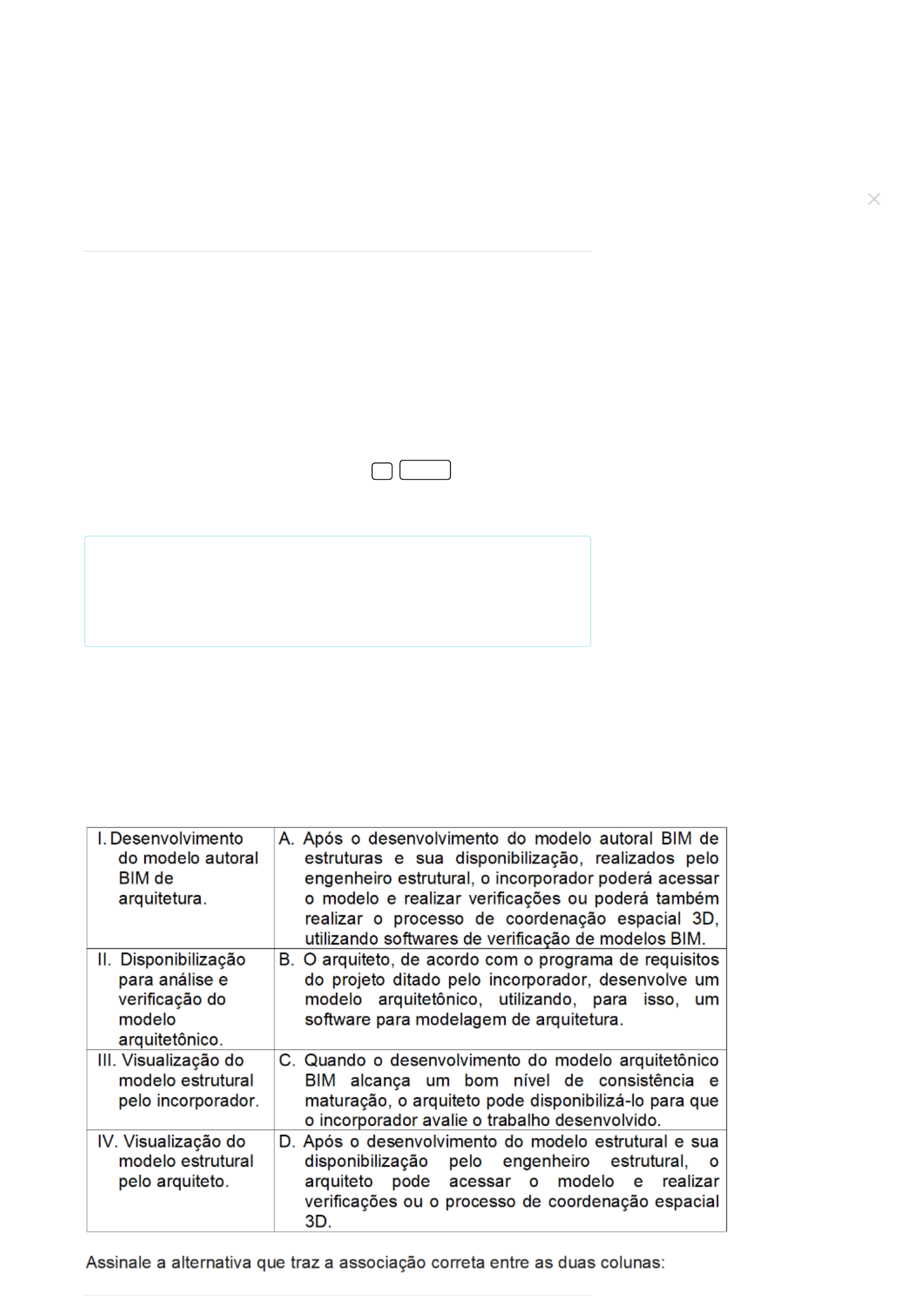 11/07/2024 21:31 Cosmos · Cosmos https://kroton.platosedu.io/lms/m/aluno/disciplina/index/3282271/10645674 1/7 Desenvolvimento de projetos estruturais: modelagem e aplicações BIM Professor(a): Maurício Thomas (Mestrado acadêmico) 1) 2) Prepare-se! Chegou a hora de você testar o conhecimento adquirido nesta disciplina. A Avaliação Virtual (AV) é composta por questões objetivas e corresponde a 100% da média final. Você tem até cinco tentativas para “Enviar” as questões, que são automaticamente corrigidas. Você pode responder as questões consultando o material de estudos, mas lembre-se de cumprir o prazo estabelecido. Boa prova! Sobre o Building Information Modeling (BIM), ou Modelagem da Informação na Construção, assinale a alternativa correta: Alternativas: BIM é um software aplicado exclusivamente às instalações hidráulicas. O BIM pode ser aplicado apenas à construção civil, não sendo possível sua utilização em outros segmentos da indústria. A tecnologia BIM se aplica aos anos iniciais de um empreendimento, considerando uma ideia de edificação ou instalação, projeto e construção. Entretanto, é uma ferramenta que não contempla o pós-obra. O BIM é um conjunto de políticas, processos e tecnologias, que permitem gerenciar o processo de edificações e instalações, considerando seu desempenho, suas informações e dados, utilizando softwares em todas as etapas. CORRETO BIM é um processo que não permite a modelagem, porém, facilita a troca de informações sobre as construções. Código da questão: 70953 A especificação da infraestrutura e da tecnologia necessária para a realização dos processos BIM, só poderá ser feita após a identificação dos casos de uso que serão desenvolvidos, com seus correspondentes entregáveis. Relacione alguns aspectos importantes com relação ao tema exposto. Resolução comentada: O BIM é um conjunto de políticas, processos e tecnologias que permitem gerenciar o processo de edificações e instalações, considerando seu desempenho, suas informações e dados, utilizando softwares em todas as etapas. Avaliação enviada com sucesso 11/07/2024 21:31 Cosmos · Cosmos https://kroton.platosedu.io/lms/m/aluno/disciplina/index/3282271/10645674 2/7 3) Alternativas: I-A; II-B, III-C; IV-D. I-B; II-D, III-C; IV-A. I-C; II-A, III-D; IV-B. I-B; II-C, III-A; IV-D. CORRETO I-D; II-B, III-C; IV-A. Código da questão: 70961 Nem todos os softwares do mercado que se autointitulam BIM, realmente são. Com relação a ao enunciado, analise as afirmativas a seguir e assinale-as com V (verdadeiro) ou F (falso): ( ) Nem tudo que é 3D é BIM, mas, se for BIM, será 3D. Isso significa que existem visualizações 3D que possuem informações de geometria apenas. ( ) Considerando que softwares BIM são gestores de bancos de dados integrados, sempre que acontecerem modificações, todas as entradas de dados devem ser atualizadas de forma automática. ( ) Softwares e soluções 3D que não atuam como gestores de bancos de dados integrados podem, sem maiores problemas, serem considerados BIM. ( ) Soluções que, utilizando múltiplas referências 2D (desenhos ou documentos), emulam modelos tridimensionais, não fazem parte do BIM. Assinale a alternativa que contenha a sequência correta de V e F: Alternativas: V – F – V – F. V – V – F – F. V – V – V – V. V – V – F – V. CORRETO F – V – F – V. Código da questão: 70955 Resolução comentada: A correta avaliação de colunas deve ser dada como: I-B; II-C, III-A; IV-D. I-B: Um software de modelagem de arquitetura permite ao arquiteto o desenvolvimento de um modelo autoral, de acordo com especificações de um incorporador. II-C: Um modelo arquitetônico em BIM permite que o incorporador e demais participantes do projeto avaliem o modelo gerado pelo arquiteto. III-A: O incorporador consegue visualizar o modelo estrutural e verificar eventuais pendências e/ou modificações dentro deste próprio modelo. IV-D: O arquiteto também consegue visualizar o que foi projetado pelo responsável do modelo estrutural. Dessa forma, consegue realizar uma verificação com seu modelo arquitetônico e constatar eventuais inconsistências dentro do projeto. Resolução comentada: A primeira, a segunda e a quarta são afirmativas verdadeiras. Veja a forma correta das afirmativas falsas: Terceira alternativa – Softwares e soluções 3D que não atuam como gestores de bancos de dados integrados não podem, de forma alguma, serem considerados BIM.. Avaliação enviada com sucesso 11/07/2024 21:31 Cosmos · Cosmos https://kroton.platosedu.io/lms/m/aluno/disciplina/index/3282271/10645674 3/7 4) 5) O IFC é baseado em uma arquitetura que relaciona suas entidades e inclui cerca de centenas dessas entidades, que possuem uma organização de maneira hierárquica de seus objetos. Com relação ao IFC e seus elementos que o compõe, analise as afirmativas a seguir e assinale-as com V (verdadeiro) ou F (falso): ( ) As entidades básicas, ou entidades de base, ou ainda o que podemos chamar de recursos reutilizáveis, são compostas pelas geometrias, topologias, materiais, medidas, objetos participantes e demais propriedades. ( ) Como o IFC é um modelo de dados extensível e orientado especificamente a objetos, as unidades básicas podem ser especificadas, gerando subtipos e criando um número ilimitado de subentidades. ( ) Uma parede, que é considerada um elemento de uma edificação, pode ser renomeada como IfcWall. ( ) O IFC proporciona a identificação explícita de diversas versões de um projeto que esteja em pleno desenvolvimento. Assinale a alternativa que contenha a sequência correta de V e F: Alternativas: V – F – V – V V – F – V – F. V – V – F – F V – V – V – V CORRETO F – V – F – V. Código da questão: 70965 Tudo que deve ser entregue, documentado e registrado, para abranger todas as fases do ciclo de vida do empreendimento, este