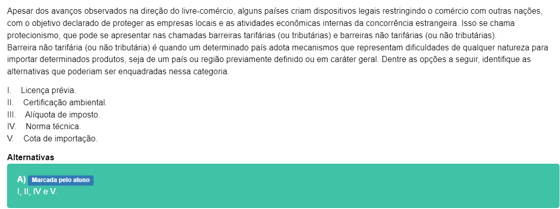 Apesar dos avanços observados na direção do livre-comércio, alguns países criam dispositivos legais restringindo comércio com outras nações, com objetivo declarado de proteger as empresas locais e as atividades econômicas internas da concorrência estrangeira. Isso se chama protecionismo, que pode se apresentar nas chamadas barreiras tarifárias (ou tributárias) e barreiras não tarifárias (ou não tributárias). Barreira não tarifária (ou não tributária) é quando um determinado país adota mecanismos que representam dificuldades de qualquer natureza para importar determinados produtos, seja de um país ou região previamente definido ou em caráter geral. Dentre as opções a seguir, identifique as alternativas que poderiam ser enquadradas nessa I. Licença prévia. II. Certificação III. Alíquota de imposto. IV. Norma técnica. V. Cota de importação. Alternativas A) Marcada pelo aluno I, II, IV e V.