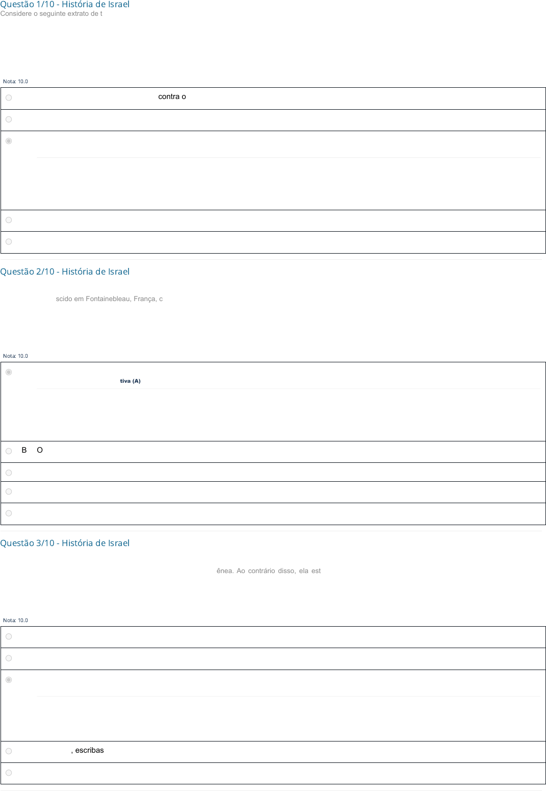 Questão 1/10 - História de Israel Considere o seguinte extrato de texto: “O livro do Gênesis relata que Abraão foi chamado de Ur dos Caldeus para Canaã, para formar um povo com a crença no Deus Único. Quando a terra de Canaã foi assolada pela fome, Jacó (Israel), seus 12 filhos e suas famílias foram para o Egito, onde seus descendentes foram escravizados”. Considerando o fragmento e o livro-base História das religiões, Apocalipse e história de Israel, qual a razão pela qual o faraó decide tomar os hebreus como escravos e inclusive matar os meninos recém-nascidos? Nota: 10.0 A Os hebreus estavam se revoltando contra o faraó. B O povo egípcio estava sendo oprimido pelos hebreus, que estavam dominando a economia local. C O povo hebreu estava aumentando consideravelmente, o que inquietou o faraó, devido ao poder que poderiam vir a ter. Você assinalou essa alternativa (C) D Houve uma grande seca no Egito e o faraó necessitava de mão de obra urgente para trabalhar nas plantações. E Houve um clamor do povo egípcio, que estava descontente com o comportamento religioso dos hebreus. Questão 2/10 - História de Israel Leia o fragmento de texto: “Rei da França nascido em Fontainebleau, França, chamado de o moedeiro falso e cuja prolongada disputa com o papado terminou com a transferência da cúria para Avignon. Filho de Felipe III, o Ousado, e Isabel de Aragão, foi um político realista e cuidadoso, conduzindo seu reinado com mão de ferro, cercando-se de legisladores que extraíram do direito romano a ideia da onipotência real, lançou impostos sobre os bens eclesiásticos e impediu a saída de recursos destinados à Santa Sé para fora da França”. De acordo com o fragmento e o livro-base História das religiões, Apocalipse e história de Israel, diante da intolerância ocidental para com os judeus, qual foi a ação do rei francês Felipe, o Belo? Nota: 10.0 A O rei francês prendeu os judeus e os extraditou. Você assinalou essa alternativa (A) B O rei francês acolheu os judeus e os protegeu. C Felipe, o Belo, em decorrência da sua disputa com a Igreja Católica, não tomou nenhum partido com relação à intolerância para com os judeus. D Em decorrência de como os judeus estavam sendo tratados na Grã-Bretanha, a França declara guerra à Inglaterra. E Não havia judeus na França, dessa forma, não houve nenhuma reação por parte do Rei francês. Questão 3/10 - História de Israel Leia o extrato de texto: “No contexto do Novo Testamento, a nação judaica não era homogênea. Ao contrário disso, ela estava dividida em vários grupos e partidos com doutrinas, ideologias e tradições distintas, movidos ora por motivações políticas, ora religiosas”. De acordo com o trecho e os conteúdos do livro-base História das religiões, Apocalipse e história de Israel, os principais grupos religiosos que se formam no período pós- exílio em Israel são: Nota: 10.0 A Sacerdotes e fariseus. B Fariseus e jebuseus. C Escribas, fariseus e saduceus. Você assinalou essa alternativa (C) D Saduceus, escribas e herodianos. E Escribas e fariseus. Após esta avaliação, caso queira ler o texto integralmente, ele está disponível em: MINISTÉRIO DAS RELAÇÕES EXTERIORES DE ISRAEL. Fatos sobre Israel. <http://embassies.gov.il/brasilia/AboutTheEmbassy/Artigos_e_publicacoes/Documents/Fatos%20Sobre%20Israel.pdf>. Acesso em 24 jan. 2017. Você acertou! “Os hebreus viveram pacificamente no Egito por gerações, mas um faraó se inquietou devido ao aumento populacional, o que potencialmente colocaria em risco seu poder; decidiu, então, torná-los escravos e mandou matar todos os meninos recém-nascidos” (livro-base, p. 144). Após esta avaliação, caso queira ler o texto integralmente, ele está disponível em: DEC.UFCG. Biografia: Filipe IV, o Belo. <http://www.dec.ufcg.edu.br/biografias/RFFili04.html>. Acesso em 24 jan. 2017. Você acertou! “Os franceses seguiram o exemplo dos ingleses e Felipe, o Belo, em sua avidez, ocupou-se do grupo. Em 1306, todos os judeus da França foram presos e postos na fronteira e seus bens, confiscados. Permitiu que eles voltassem dez anos depois” (livro-base, p. 177). Após esta avaliação, caso queira ler o texto integralmente, ele está disponível em: ESTUDANTES DA BÍBLIA. Lições CPAD Jovens e Adultos. <http://www.estudantesdabiblia.com.br/licoes_cpad/2015/lbj-2015-02-03.htm> Acesso em 24 jan. 2017. Você acertou! “Além dos escribas, havia outros dois grupos influentes neste período: os fariseus e os saduceus” (livro-base, p. 160). Questão 4/10 - História de Israel Considere o seguinte extrato de texto: “A história de Israel começou ainda antes de 2000 a.C. Na verdade, a seleção de Israel como uma nação especial foi uma parte do plano de Deus desde o início dos tempos. A escolha de Deus da nação de Israel como o Seu ‘povo escolhido’ não foi devido a qualquer tamanho, natureza ou atração especiais. Na verdade, a nação de Israel foi a de menor número entre todas as outras nações [...]”. Mesmo os doze filhos Jacó, embora tenham se multiplicado, não passavam de um grupo a mais no emaranhado de povos que era a Palestina. Com base no texto e no livro- base História das religiões, Apocalipse e história de Israel, quando os descendentes de Abraão começam a se multiplicar? Nota: 10.0 A Os descendentes de Abraão somente começaram a se multiplicar de forma mais numerosa após a conquista da terra prometida. B O povo hebreu sempre foi muito numeroso e não houve um momento na história em que se possa afirmar que houve um aumento significativo de população. C O povo hebreu tem um grande aumento numérico de sua população quando se encontrava no Egito Você assinalou essa alternativa (C) D Durante a peregrinação de Abraão, os pastores e nômades da região por onde ele passava acabavam juntando-se a ele, o que aumentou de forma exponencial o povo hebreu. E Nunca houve um aumento s