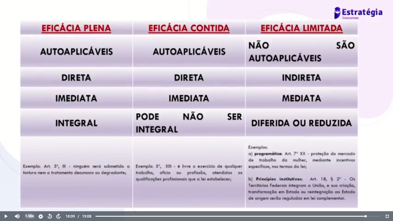 Estratégia Concursos EFICÁCIA PLENA EFICÁCIA CONTIDA EFICÁCIA LIMITADA NÃO SÃO AUTOAPLICÁVEIS AUTOAPLICÁVEIS AUTOAPLICÁVEIS DIRETA DIRETA INDIRETA IMEDIATA IMEDIATA MEDIATA PODE NÃO SER INTEGRAL DIFERIDA OU REDUZIDA INTEGRAL Exemplos: a) Art. XX proteção do mercado de trabalho da mulher, mediante incentivos Exemplo: Art. III ninguém submetido a Exemplo: XIII - é livre de qualquer nos termos lei; tortura nem a tratamento desumano ou degradante; trabalho, oficio ou profissão, atendidas as qualificações profissionais que lei estabelecer; b) Art. 18, § Os Territórios Federais integram a União, e sua criação, transformação em Estado ou reintegração ao Estado de origem serão reguladas em lei complementar. D 1.50x & 18:09 / 19:08