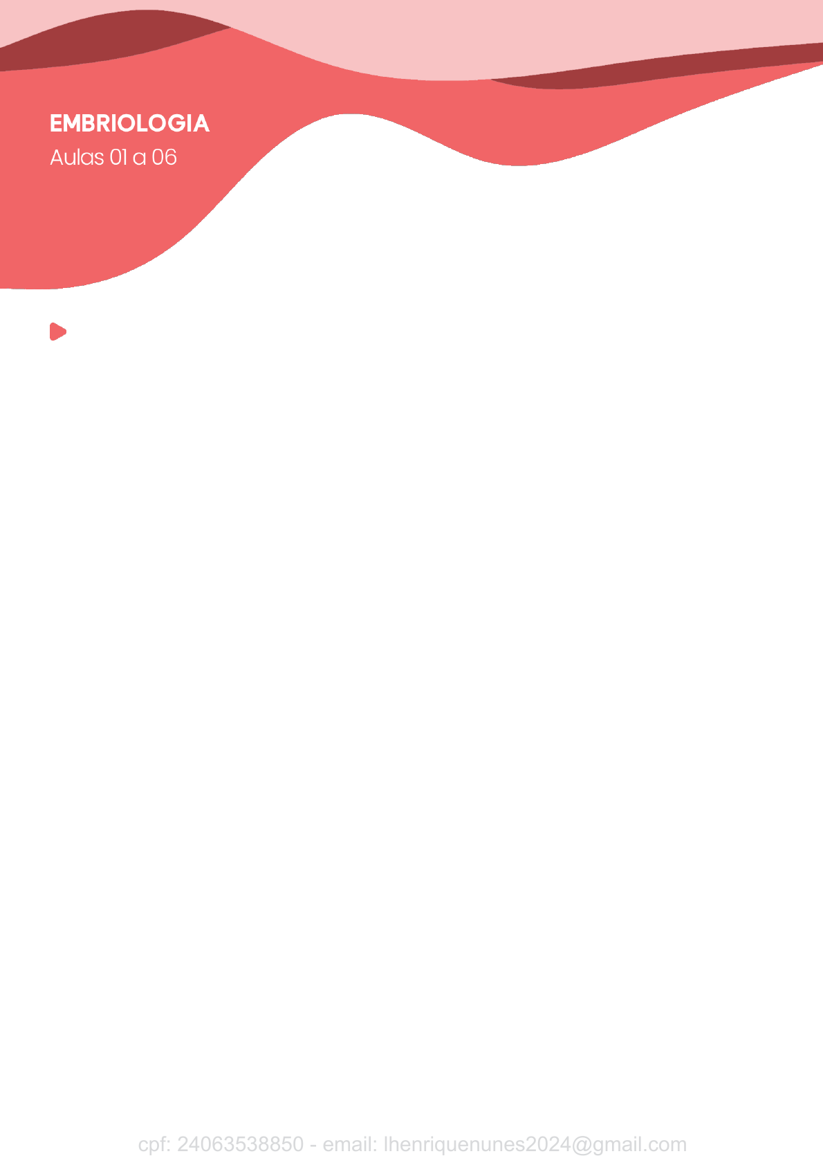 Embriologia Exercícios de fixação 1. Quais são as três etapas do desenvolvimento embrionário? 2. Cite exemplos de seres com ovos oligolécitos, heterolécitos, megalécitos e centrolécitos e seus respectivos tipos de segmentação. 3. O que são blastômeros? 4. Caracterize a mórula e a blástula. 5. O que são folhetos embrionários e em qual etapa do desenvolvimento embrionário eles são formados? 6. O que é o blastóporo e como podemos classificar os animais em relação ao destino do blastóporo? 7. Defina arquêntero. 8. O que é o celoma? A partir de qual folheto embrionário ele é formado? 9. A partir de qual folheto embrionário são formados o tubo neural e a notocorda? 10. Em relação à organogênese, quais são as estruturas corporais derivadas respectivamente da ecto, da meso e da endoderme? 11. Determine a função de cada uma dos 4 anexos embrionários. 12. Por que a placenta não pode ser considerada um anexo embrionário verdadeiro? cpf: 24063538850 - email: lhenriquenunes2024@gmail.com Retomando conceitos 1. (__) Ovos megalécitos possuem segmentação meroblástica superficial. 2. (__) Durante a segmentação o zigoto se divide por mitoses e não altera o seu volume até a fase de mórula. 3. (__) As células de mórula são completamente indiferenciadas. 4. (__) O blastocisto é a blástula dos animais vertebrados. 5. (__) Na gástrula se formam os folhetos embrionários. 6. (__) O celoma se forma a partir da ectoderme. 7. (__) Seres deuterostômios são aqueles em que o arquêntero dá origem ao ânus. 8. (__) Na fase de nêurula o tubo neural se forma a partir da mesoderme. 9. (__) A notocorda se transforma na coluna vertebral dos animais. 10. (__) A placenta é formada pelo cório e pelo endométrio uterino. 11. (__) O alantoide pode se anexar ao cório e com isso permite maior trocas gasosas. 12. (__) O sistema nervoso tem origem mesodérmica. 13. (__) A bolsa amniniótica nutre o embrião. Exercícios aplicados 1. (UFRGS) No bloco superior abaixo, estão denominados padrões de clivagem de ovos de diferentes espécies; no inferior, imagens de padrões de segmentação das células-ovo. Associe adequadamente o bloco inferior ao superior. 1. Clivagem completa 2. Clivagem incompleta 3. Clivagem superficial (__) Visão lateral (__) Secção lateral (__) Visão lateral (__) Visão de cima A sequência correta de preenchimento dos parênteses, de cima para baixo, é a) 3 – 2 – 1 – 2. b) 1 – 2 – 3 – 1. c) 2 – 3 – 1 – 1. d) 1 – 3 – 1 – 2. e) 2 – 3 – 2 – 1. cpf: 24063538850 - email: lhenriquenunes2024@gmail.com 2. (UFU) O esquema abaixo representa os diferentes estágios de desenvolvimento de um anfíbio. De acordo com esse esquema, os diferentes estágios de desenvolvimento se originaram a partir de um ovo a) centrolécito. b) oligolécito. c) mesolécito. d) megalécito. TEXTO PARA A PRÓXIMA QUESTÃO: Analise a figura a seguir e responda à(s) questão(ões). 3. (UEL) As células-ovo, ou zigoto, possuem substâncias nutritivas armazenadas no citoplasma, que constituem o vitelo. Assinale a alternativa que relaciona corretamente as células-ovo à quantidade e distribuição do vitelo, aos grupos animais que as apresentam e ao tipo de segmentação. a) Ovos isolécitos, que possuem pouco vitelo distribuído de maneira uniforme, estão presentes em mamíferos e apresentam segmentação holoblástica. b) Ovos heterolécitos, que possuem uma quantidade grande de vitelo restrita à região central, estão presentes nos moluscos e apresentam segmentação meroblástica. c) Ovos telolécitos, que possuem pouco vitelo distribuído de maneira uniforme, estão presentes em anelídeos e apresentam segmentação superficial. d) Ovos centrolécitos, que possuem uma quantidade moderada de vitelo distribuída de maneira uniforme, estão presentes nos anfíbios e apresentam segmentação holoblástica. e) Ovos mesolécitos, que possuem uma grande massa de vitelo na região central, estão presentes nos insetos e apresentam segmentação meroblástica. 4. (UECE) Em relação à embriogênese humana, é correto afirmar que a) a mórula é um conjunto de blastômeros, formado através da clivagem do zigoto, cujo nome remete à amora por representar um aglomerado de células. b) a gástrula é o estágio em que a mórula sofre mudanças, imediatamente após chegar no útero. c) o blastocisto é o estágio em que ocorre a formação de um disco embrionário trilamelar. d) no estágio de nêurula o embrião se desenvolve a partir da placa neural, o que ocorre durante a primeira semana. 5. (Unifor) Imagine que você é um cientista! Ao chegar a um laboratório de embriologia, verificou que havia um material a ser identificado no microscópio. O material tratava-se de um zigoto (ou ovo) e, com o passar dos dias, você foi observando as seguintes características: - pouco vitelo distribuído uniformemente nos polos vegetativo e animal; - clivagens do tipo holoblásticas iguais. De acordo com tais características, conclui-se que o ovo pode ser classificado como: a) Centrolécito. b) Telolécito. c) Mesolécito. d) Megalécito. e) Oligolécito. 6. (UERN) Durante a fase do desenvolvimento embrionário, a célula-ovo passa por varias divisões mitóticas, originando muitas células, que permanecem unidas. Nas primeiras divisões ocorre um aumento significativo do numero de células, porem, o tamanho total da célula-ovo praticamente não altera. Sobre o processo de desenvolvimento embrionário, analise. I. O processo em que o volume da célula-ovo não aumenta, caracteriza a segmentação. II. A organogênese e a fase seguinte a clivagem no desenvolvimento embrionário, onde ocorre a formação dos folhetos embrionários que darão origem a diversos tecidos do organismo. III. A meroblástica e um tipo de segmentação, e ocorre em todo o ovo, exceto na região que possui vitelo, chamada cicatrícula. IV. Na segmentação discoidal, as divisões ocorrem na 