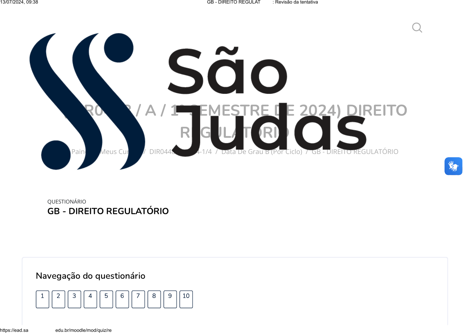 (DIR0448 / A / 1º SEMESTRE DE 2024) DIREITO REGULATÓRIO Painel / Meus Cursos / DIR0448/A/2024-1/4 / Data De Grau B (Por Ciclo) / GB - DIREITO REGULATÓRIO Navegação do questionário 1 2 3 4 5 6 7 8 9 10 QUESTIONÁRIO GB - DIREITO REGULATÓRIO 13/07/2024, 09:38 GB - DIREITO REGULATÓRIO: Revisão da tentativa https://ead.saojudastadeu.edu.br/moodle/mod/quiz/review.php?attempt=388&cmid=10979 1/23 https://ead.saojudastadeu.edu.br/moodle/my/ https://ead.saojudastadeu.edu.br/moodle/my/courses.php https://ead.saojudastadeu.edu.br/moodle/course/view.php?id=523 https://ead.saojudastadeu.edu.br/moodle/course/view.php?id=523#section-17 https://ead.saojudastadeu.edu.br/moodle/mod/quiz/view.php?id=10979 https://ead.saojudastadeu.edu.br/moodle Iniciado em quarta-feira, 19 jun 2024, 12:09 Estado Finalizada Concluída em quarta-feira, 19 jun 2024, 12:13 Tempo empregado 4 minutos 30 segundos Avaliar 9,00 de um máximo de 10,00(90%) Mostrar uma página por vez Terminar revisão 13/07/2024, 09:38 GB - DIREITO REGULATÓRIO: Revisão da tentativa https://ead.saojudastadeu.edu.br/moodle/mod/quiz/review.php?attempt=388&cmid=10979 2/23 https://ead.saojudastadeu.edu.br/moodle/mod/quiz/review.php?attempt=388&cmid=10979&showall=0 https://ead.saojudastadeu.edu.br/moodle/mod/quiz/view.php?id=10979 QUESTÃO Correto Atingiu 1,00 de 1,00 1 O posicionamento jurisprudencial e doutrinário que vem se cristalizando no ordenamento jurídico brasileiro acerca de novas formas de tratamento jurídico- administrativo de setores de atividades relevantes transparece especialização su�ciente para a cogitação de um ramo de estudos direcionado às especi�cidades da regulação, à semelhança do ocorrido, em outros tempos, com o direito do trabalho, o direito �nanceiro, o direito tributário, o direito do consumidor, o direito ambiental. Com base no texto, avalie as a�rmações a seguir: O ponto de partida do Direito regulatório é o de formulação de princípios intersetoriais comuns aptos a retratarem um ramo de conhecimento útil à compreensão e solução de questões alinhadas à regulação. No Brasil, a conformação regulatória predominante na segunda metade da década de 1990 até os dias de hoje revela a opção por uma forma de regulação com características especí�cas. O desenvolvimento do direito regulatório é completamente independente do arcabouço constitucional. É correto o que se a�rma em: a. I, II e III 13/07/2024, 09:38 GB - DIREITO REGULATÓRIO: Revisão da tentativa https://ead.saojudastadeu.edu.br/moodle/mod/quiz/review.php?attempt=388&cmid=10979 3/23 b. I e III c. III d. I e II. você acertou! Sua resposta está correta. A resposta correta é: I e II. 13/07/2024, 09:38 GB - DIREITO REGULATÓRIO: Revisão da tentativa https://ead.saojudastadeu.edu.br/moodle/mod/quiz/review.php?attempt=388&cmid=10979 4/23 QUESTÃO Correto Atingiu 1,00 de 1,00 2 Como diferencial dos dois modelos ideais de Estado liberal e de Estado social, encontra-se o chamado Estado regulador, que se de�ne pela proeminência não da interferência direta para promoção do desenvolvimento econômico social, nem mesmo da não-intervenção para dinamização do mercado, mas pelo papel de coordenação, de gerenciamento, de controle, de intervenção indireta495, ou sinteticamente, de regulação estatal, entendendo-se esta última como resultado da compreensão do Estado e do mercado não mais como entes estanques ou antípodas, mas como fenômenos interdependentes e essenciais à consolidação dos direitos fundamentais. Com relação ao Estado regulador, assinale a alternativa correta: a. o Estado regulador se consubstanciou em oposição somente a um Estado Social-Burocrático empregador de prestadores de serviços essenciais à sociedade. b. O Estado regulador não é nem puramente intervencionista, nem abstencionista. você acertou! 13/07/2024, 09:38 GB - DIREITO REGULATÓRIO: Revisão da tentativa https://ead.saojudastadeu.edu.br/moodle/mod/quiz/review.php?attempt=388&cmid=10979 5/23 c. O Estado regulador se desenvolve exclusivamente com base na noção de inexistência de interferência no âmbito econômico e social, ou seja, à crença no mercado autorregulado como excludente da atuação reguladora do Estado. d. A regulação é, em si mesma, uma característica diferencial do modelo atual de Estado regulador, pois a presença de competências regulatórias no Estado brasileiro é recente. Sua resposta está correta. A resposta correta é: O Estado regulador não é nem puramente intervencionista, nem abstencionista. 13/07/2024, 09:38 GB - DIREITO REGULATÓRIO: Revisão da tentativa https://ead.saojudastadeu.edu.br/moodle/mod/quiz/review.php?attempt=388&cmid=10979 6/23 QUESTÃO Correto Atingiu 1,00 de 1,00 3 O grau de centralização regulatória de serviços transparece a maior ou menor con�ança do Estado no alcance do interesse público, mediante outorga de sua prestação à iniciativa privada. Há dois conceitos que evidenciam como a regulação dos serviços públicos opera ao longo da história: controle pela descentralização e controle pela centralização. Com base no texto, avalie as a�rmações a seguir: I. Controle pela descentralização implica na falta de aceitação, pelo Estado, de que suas �nalidades possam ser plenamente alcançadas pela ação dos particulares II. Desregulamentação é sinônimo de controle pela descentralização. III. o controle pela centralização denota falta de con�ança na iniciativa privada para o alcance espontâneo dos �ns patrocinados pelo Estado. É correto o que se a�rma em: 13/07/2024, 09:38 GB - DIREITO REGULATÓRIO: Revisão da tentativa https://ead.saojudastadeu.edu.br/moodle/mod/quiz/review.php?attempt=388&cmid=10979 7/23 a. I e II. b. II e III. VOCÊ ACERTOU! c. I d. I, II e III. Sua resposta está correta. A resposta correta é: II e III. 13/07/2024, 09:38 GB - DIREITO REGULATÓRIO: Revisão da tentativa https://ead.saojudastadeu.e