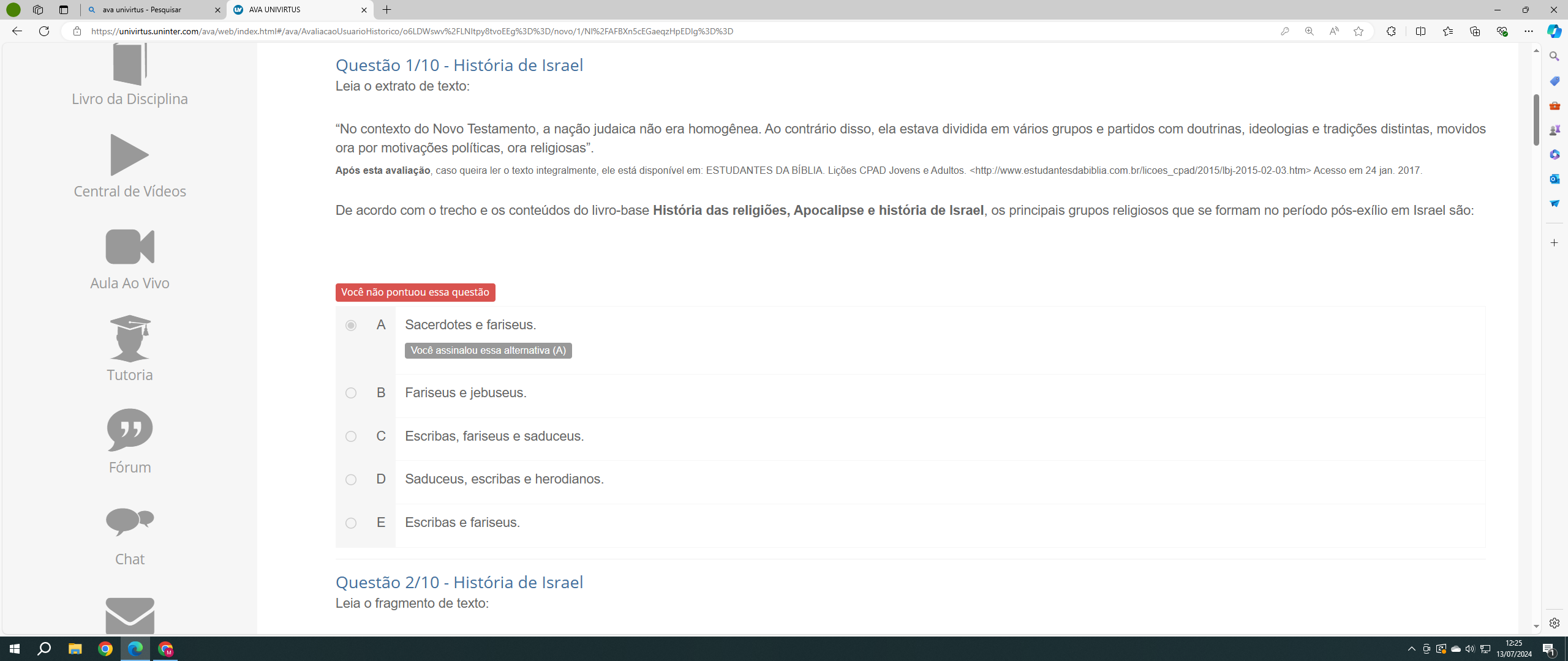 ava univirtus Pesquisar AVA UNIVIRTUS + - Q A" ... a Questão 1/10 - História de Israel o extrato de texto: Livro da Disciplina "No contexto do Novo Testamento, a nação judaica não era homogênea. Ao contrário disso, ela estava dividida em vários grupos e partidos com doutrinas, ideologias e tradições distintas, movidos ora por motivações políticas, ora religiosas". Após esta caso queira ler o texto integralmente, ele está disponível em: ESTUDANTES DA BÍBLIA. Lições CPAD e Acesso em 24 jan. 2017. Central de Vídeos De acordo com o trecho e os conteúdos do livro-base História das religiões, Apocalipse e história de Israel, os principais grupos religiosos que se formam no período pós-exílio em Israel são: K + Aula Ao Vivo Você não pontuou essa questão A Sacerdotes e fariseus. Você assinalou essa alternativa (A) Tutoria B Fariseus e jebuseus. " C Escribas, fariseus e saduceus. D Saduceus, escribas e herodianos. E Escribas e fariseus. Chat Questão 2/10 - História de Israel Leia o fragmento de texto: 12:25 ^ 13/07/2024