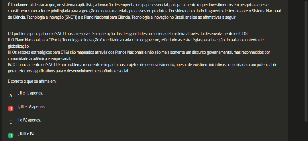 É fundamental destacar que, no sistema capitalista, a inovação desempenha um papel essencial, pois geralmente requer investimentos em pesquisas que se constituem como a fonte privilegiada para a geração de novos materiais, processos ou produtos. Considerando dado fragmento de texto sobre Sistema Nacional de Ciência, Tecnologia e Inovação (SNCTI) e Plano Nacional para Ciência, Tecnologia e Inovação no Brasil, analise as afirmativas a seguir: problema principal que SNCTI busca resolver é a superação das desigualdades na sociedade brasileira através do desenvolvimento de II. 0 Plano Nacional para Ciência, Tecnologia e Inovação é reeditado a cada ciclo de governo, refletindo as estratégias para inserção do país no contexto de globalização. III. Os setores estratégicos para CT&I são mapeados através dos Planos Nacionais e não são mais somente um discurso governamental, mas reconhecidos por comunidade acadêmica e empresarial. IV. 0 financiamento do SNCTI é um problema recorrente e impacta nos projetos de desenvolvimento, apesar de existirem iniciativas consolidadas com potencial de gerar retornos significativos para desenvolvimento econômico e social. É correto que se afirma em: e III, apenas A B II, III e IV, C e IV, apenas. D II, III e IV.