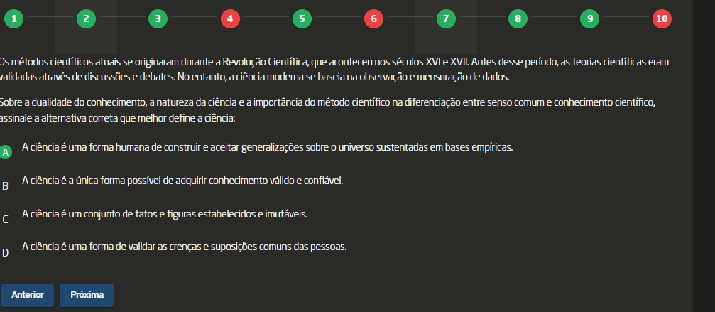 1 2 3 4 5 6 7 8 g 10 Os métodos científicos atuais se originaram durante a Revolução que aconteceu nos séculos XVI e XVII. Antes desse período, as teorias científicas eram validadas através de discussões e debates. No entanto, a ciência moderna se baseia na observação e mensuração de dados. Sobre a dualidade do conhecimento, a natureza da ciência e a importância do método científico na diferenciação entre senso comum e conhecimento assinale a alternativa correta que melhor define a ciência: A A ciência é uma forma humana de construir e aceitar generalizações sobre universo sustentadas em bases empíricas. B A ciência é a única forma possível de adquirir conhecimento válido e confiável. C A ciência é um conjunto de fatos e figuras estabelecidos e imutáveis. D A ciência é uma forma de validar as crenças e suposições comuns das pessoas. Anterior Próxima