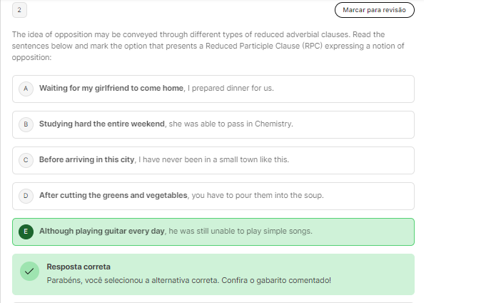 2 Marcar para revisão The idea of opposition may be conveyed through different types of reduced adverbial Read the sentences below and mark the option that presents a Reduced Participle Clause (RPC) expressing a notion of opposition: A Waiting for my girlfriend to come home, I prepared dinner for us. B Studying hard the entire weekend she was able to pass in Chemistry. Before arriving in this city, I have never been in a small town like this. D After cutting the greens and vegetables, you have to pour them into the soup. E Although playing guitar every day, he was still unable to play simple songs. Resposta correta você selecionou a alternativa correta. Confira gabarito comentado!