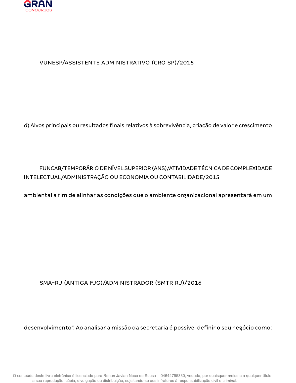 64 de 145gran.com.br ADMINISTRAÇÃO Planejamento Organizacional Adriel Sá QUESTÕES DE CONCURSO 001. ( ) Assinale a alternativa que representa, no âmbito do plano estratégico, a conceituação de Cenário. a) Processo que os planejadores utilizam para resumir os pontos relevantes dos planos estratégicos. b) Ações que os administradores pretendem utilizar para atingir as metas organizacionais. c) Narrativa que descreve um conjunto particular de condições econômicas, sociais e políticas, atuais e futuras, e que impactam no planejamento e execução da estratégia. da organização a longo prazo. e) Conjunto de procedimentos para a tomada de decisão sobre os objetivos e as estratégias de longo prazo. 002. ( ) Após a construção de cenários plausíveis, a próxima etapa do processo consiste na preparação da previsão certo tempo no futuro. Há uma abordagem de previsão ambiental que consiste em projetar para o futuro os dados atuais, utilizando-se de modelos determinísticos e quantitativos. Trata-se da seguinte abordagem de previsão: a) prospectiva. b) holística. c) histórica. d) projetiva. e) dinâmica. 003. ( ) A missão da Secretaria Municipal de Transportes (SMTR) é “transformar o sistema de transportes da cidade, de forma que ele passe a oferecer ao cidadão condições de se deslocar com segurança, rapidez e conforto, priorizando o transporte coletivo, preservando o meio ambiente e a qualidade de vida, em sintonia com o projeto de governo da Prefeitura Municipal e em prol do a) transportes b) ônibus c) desenvolvimento d) cidadão 65 de 145gran.com.br ADMINISTRAÇÃO Planejamento Organizacional Adriel Sá 004. ( ) Uma organização pública pretende implementar uma técnica de gestão de resultados, mas sabe que, para tal, é necessário um planejamento prévio. Essa organização apresenta como sua visando à paz social”. A declaração acima descreve, para a organização, como é operacionalizado o conceito de: a) missão; b) objetivo; c) princípio; d) valor; e) visão. 005. ( ) Uma empresa do ramo de trens urbanos, em seu processo de planejamento estratégico, formulou a seguinte declaração: “Tornar-se referência no planejamento, projeto, implantação e operação do transporte urbano de pessoas sobre trilhos, propiciando a ampliação da participação nas cidades e expansão da malha metroferroviária nacional”. A declaração refere-se, em planejamento estratégico, ao conceito de a) Meta b) Objetivo c) Tática d) Valor e) Visão 006. ( ) Para se adaptar a essa nova realidade de um ambiente cada vez mais dinâmico em função da globalização, instabilidade administração pública teve de desenvolver a capacidade de gestão estratégica. A Gestão Estratégica trata da formulação de estratégias que determinem rumos ou formas de atingir objetivos numa organização. Essas estratégias são geralmente reunidas e descritas em um plano estratégico. Analise os conceitos pertinentes a esse assunto. I – Missão II – Visão III – Valores 66 de 145gran.com.br ADMINISTRAÇÃO Planejamento Organizacional Adriel Sá Descrição do cenário ou do sonho da organização; está diretamente relacionado com a projeção de cenários futuros da organização. O que a organização acredita e pratica; está relacionado com atributos de grande estima que possam ser entendidos e vivenciados pela organização. Descrição de forma diferenciada do negócio ou atividade da organização; está Logo, assinale a ordem escolhida, lida de cima para baixo. a) I, II, III. b) III, I, II. c) III, II, I. d) II, III, I. 007. ( ) O planejamento tático é desenvolvido a níveis organizacionais ___________, tendo como objetivo principal A expressão que complete corretamente a lacuna do texto é: a) hierárquicos. b) mais baixos. c) médios. d) superiores. 008. ( ) O planejamento é a função de planos que integrem e coordenem suas atividades. Um dos elementos essenciais do processo de planejamento é o estabelecimento de objetivos que explicitem os resultados que se deseja alcançar, fornecendo senso de direção para as ações e esforços organizacionais. tais como: b) estarem de acordo com o ambiente externo; c) serem inovadores; d) serem abrangentes; e) estarem dentro do orçamento previsto. 67 de 145gran.com.br 009. ( de uma organização são etapas fundamentais para o processo de planejamento estratégico de uma organização. Corresponde a uma declaração de visão: a) “Oferecer lazer ao associado, visando sua satisfação e integração através de atividades esportivas, sociais e culturais, com qualidade e competência, em um ambiente saudável, seguro e amistoso“; e socialmente solidária”; c) “Viabilizar soluções de pesquisa, desenvolvimento e inovação para a sustentabilidade da agricultura, em benefício da sociedade brasileira”; d) “Contribuir decisivamente para o desenvolvimento socioeconômico e melhoria da qualidade de vida da sociedade brasileira, utilizando instrumentos da Metrologia e da Qualidade...”; e) “Promover o intercâmbio Cultural”. 010. ( ) Buscando formular uma estratégia, os administradores precisam analisar o ambiente externo da sua organização e conhecer as competências e recursos a sua disposição. Ao seu alcance existe uma ferramenta gerencial que busca estudar de forma integrada os pontos fortes da organização, seus pontos fracos, as oportunidades e as ameaças. Assinale a alternativa que indica corretamente o nome pelo qual esta ferramenta é conhecida. a) SWOT. b) Reengenharia. c) Benchmarking. d) Design thinking. e) CRM. 68 de 145gran.com.br 011. ( ) A análise SWOT, também chamada em português de análise FOFA, é uma das ferramentas mais difundidas nos processos de planejamento estratégico. A análise SWOT permite compreender a situação da organização em seu ambiente de atuação e subsidiar escolhas estratégicas população brasileira poderia abrir espaços para inovar e utilizar sua