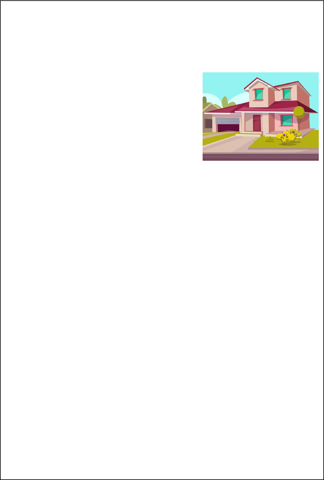 ATIVIDADE AVALIATIVA ALUNOª: ____________________________________________ TURMA: __________ PROFESSORA: ________________________________ VALOR: _______ ATIVIDADE AVALIATIVA Marque as respostas corretas para as perguntas, de acordo com o texto: A casa dos Taylor O Sr. e a Sra. Taylor têm dois filhos e uma filha. Os nomes dos filhos são Josh e Paul. O nome da filha é Rebeca. Os Taylor moram em uma casa. Têm uma sala de estar. Eles assistem TV na sala de estar. O pai cozinha comida na cozinha. Eles comem na sala de jantar. Há três quartos na casa. Dormem nos quartos. Eles guardam suas roupas no armário. Há uma casa de banho. Eles escovam os dentes no banheiro. A casa tem um jardim. Josh, Paul e Rebecca brincam no jardim. Eles têm um cachorro. Eles gostam de brincar com o cachorro. 1- Quantos filhos têm o Sr. e a Sra. Taylor? (a) One (b) Three (c) Two (d) Four 2- Quem cozinha na kitchen? (a) Josh (b) Rebecca (c) Mother (d) Father 3- Onde a família come? (a) kitchen (b) Bedroom (c) Dining room (d) Living room 4- Quantos bedrooms estão na casa? (a) Four (b) Three (c) One (d) Two QUESTÃO 2 Qual a sua parte da casa favorita? Por quê? Desenhe-a ___________________________________________________________________ image1.png