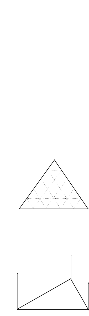 UNIVERSIDADE FEDERAL RURAL DO RIO DE JANEIRO FÍSICO-QUÍMICA DQF/IQ TERMODINÂMICA QUÍMICA IC681 PROF. SERGIO 14a AULA Data: 28/06/2024 TERMODINÂMICA DAS SOLUÇÕES EQUILÍBRIO DE FASES CONDENSADAS EM SISTEMAS COM TRÊS COMPONENTES Diagrama isobárico e isotérmico com componentes A, B e C. OBS: pela regra das fases V = c – φ + 2 e substituindo os dados resulta, V = 3 – 1 + 2 = 4, que implica em 4 variáveis independentes para descrever o sistema. Para plotar no diagrama este sistema (diagrama bidimensional) é preciso fixar 2 variáveis, deste modo o diagrama será isobárico e isotérmico. Sistema com 3 componentes. Diagrama isotérmico e isobárico. (Pode ser triângulo equilátero ou triângulo retângulo). OBS: o triângulo retângulo será utilizado quando for necessária uma descrição da composição utilizando as coordenadas cartesianas. Neste curso usaremos o diagrama triângulo equilátero Representação de três eutéticos binários (E1, E2 e E3). Representação de um eutético ternário (E4). E1 = ( xA = 0,3; xB = 0,7) E2 = ( xA = 0,3; xC = 0,7) E3 = ( xB = 0,4; xC = 0,6) E4 = ( xA = 0,2; xB = 0,4; xC = 0,4) O diagrama abaixo é uma representação tridimensional no plano do sistema ternário em função da temperatura. Representação possível das arestas do triângulo equilátero do diagrama ternário no plano T versus composição. 0,0 0,2 0,4 0,6 0,8 1,0 0,0 0,5 1,0 E 4 E 3 E 2 E 1 * * * * 0,8 0,6 0,4 0,2 0,80,60,40,2 x C x B x A 0,0 0,2 0,4 0,6 0,8 1,0 0,0 0,5 1,0 T T T x C x B x A Se pudéssemos abrir o diagrama acima no plano, (fica óbvio que iremos perder informação nesta descrição, não será possível representar aqui o eutético ternário): Diagrama Binário com os componentes A, B e C. Construção do diagrama politérmico Este diagrama é extremamente importante pois condensa toda informação do sistema ternário e traduz o comportamento do sistema em diversas temperatura podendo assim construir o perfil de cristalização para qualquer processo. Representação da isoterma T1 Análise do diagrama: a) Na T1 o componente A já está cristalizado. b) Curva vermelha – é a curva de solubilidade experimental do componente A na solução ternária. c) Na região entre o vértice A e a curva vermelho fica a solução saturada constituída por duas fases: solução saturada e excesso de A sólido. d) No vértice de A se encontra o componente A sólido. e) No restante do diagrama só existe líquido, inclusive os componentes B e C. 0,0 0,2 0,4 0,6 0,8 1,0 1,2 0,0 0,5 1,0 T 3 T 2 T 1 T E3 T E2 A(s) + C(s)B(s) + C(s) A(s) + B(s) x E3 x E2 x E1 T E1 T C T B T A T A x A x B TT T T x A x C 0,0 0,2 0,4 0,6 0,8 1,0 0,0 0,5 1,0 T 1- Curva de solubiidade de A E 4 E 3 E 2 E 1 * * * * 0,8 0,6 0,4 0,2 0,80,60,40,2 x C x B x A Representação das diversas isotermas no diagrama ternário Análise do diagrama: a) Curva verde T2 – nesta temperatura já cristalizaram os componentes B e C, surgindo assim suas respectivas curvas de solubilidade. b) As curvas de solubilidade caminham em direção ao eutético ternário à medida que a temperatura decresce. c) Curva azul T3 – nesta temperatura cristaliza o eutético E1. No interior do diagrama delimitado pela curva azul todo sistema está na fase líquida. Representação da isoterma TE3 Análise do diagrama: a) TE3 – nesta temperatura cristaliza o eutético EE3. No interior do diagrama delimitado pela curva magenta todo sistema está na fase líquida. b) Curva magenta representa a solubilidade experimental dos componentes A, B e C na solução ternária. c) As curvas de solubilidade caminham em direção ao eutético ternário à medida que a temperatura decresce. d) A composição dos eutéticos E1 e E2 caminham em direção à composição do eutético ternário TE4 surgindo uma região conectada por retas ligadas aos vértices do diagrama contendo uma mistura de sólidos: A(s) + B(s) + C(s). 0,0 0,2 0,4 0,6 0,8 1,0 0,0 0,5 1,0 T 3- T 2- T 1- Curva de solubiidade de A E 4 E 3 E 2 E 1 * * * * 0,8 0,6 0,4 0,2 0,80,60,40,2 x C x B x A 0,0 0,2 0,4 0,6 0,8 1,0 0,0 0,5 1,0 Curva se solubilidade Solução saturada em A Solução saturada em B Solução saturada em C T E2- A(s) + B(s) + C (s) A(s) + B(s) +C(s) T 3- T 2- T 1- E 4 E 3 E 2 E 1 * * * * 0,8 0,6 0,4 0,2 0,80,60,40,2 x C x B x A Análise do diagrama politérmico com uma solução que tem a composição representada no diagrama. OBS 1: A composição da solução se encontra na região de domínio do componente A, portanto este é o primeiro componente a cristalizar. OBS 2: Quando o componente A cristaliza a solução fica mais pobre em A mas mantendo constante a composição relativa de B e C. O processo caminha sobre a isopleta definida por uma reta que corta o vértice de A e ponto da composição global. a) No processo de resfriamento cristaliza A (puro) e a composição do magma caminha pela isopleta até cruzar a curva do Eutético 2. b) Daí cristaliza a mistura eutética 2 e a composição do magma caminha pela curva até atingir a composição do eutético ternário (E4). c) Desse ponto cristaliza o eutético ternário até todo sistema se solidificar. 0,0 0,2 0,4 0,6 0,8 1,0 0,0 0,5 1,0 * E 4 E 3 E 2 E 1 * * * * x C x B x A 0,0 0,2 0,4 0,6 0,8 1,0 0,0 0,5 1,0 Eutético E 2 Eutético ternário A puro sólido Perfil de cristalização