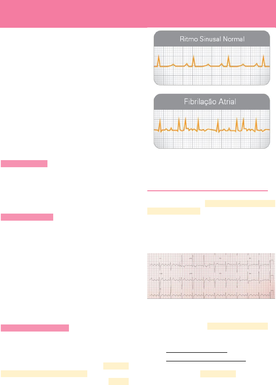 Stephanie Marie // 1 FIBRILAÇÃO ATRIAL Inicialmente: • arritmia sustentada mais comum • FA e flutter aumentam em 5x o risco de AVC isquêmico (aumenta a chance de eventos tromboembólicos) • 20% dos AVCs isquêmicos são associados a FA • aumenta a morbimortalidade, as hospitalizações e os eventos tromboembólicos • reduz a qualidade de vida, capacidade de exercício ! Se a FC não estiver controlada, o paciente pode evoluir com diminuição da FE (taquicardiomiopatia). FISIOPATOLOGIA: FA – circuito de microreentrada no átrio, principalmente AE (local mais comum: ao redor das veias pulmonares) Flutter – circuito de macroreentrada no istmo cavotricuspideo. FATORES DE RISCO: • sexo masculino • idade (quanto maior a idade, pior) • genética • obesidade • apneia do sono • consumo excessivo de álcool • sedentarismo / exercício excessivo • pós-operatório ! É necessário tratar FA e as comorbidades – se não forem tratadas, há chance de recorrer a arritmia. DIAGNÓSTICO E MANEJO: Mnemônico = CC2ABC C – confirmação do diagnóstico: ECG 12 derivações OU derivação única com pelo menos 30 segundos, documentando ausência de onda P com RR irregular. Muitas vezes também pode ser visualizada uma onda f (representa atividade elétrica atrial que não sinusal). DD: flutter atrial – o manejo dos pacientes com flutter é bem parecido com o manejo dos pacientes com FA. O que diferencia no ECG os dois ritmos? O flutter pode ter RR regular ou irregular. Visualizadas ondas F de flutter com padrão em dente de serra. Geralmente a frequência atrial gira em torno de 300bpm e a condução átrio-ventrículo é 2:1 (frequência ventricular 150bpm) – mas pode existir BAV variável (e nesse caso, RR será irregular). C – caracterizar a FA: 1) quanto ao risco de evento tromboembólico e AVC isquêmico: escore CHA2DS2-Vasc – indica necessidade de anticoagulação a longo prazo. quando anticoagular: ♀ ≥ 3 / ♂ ≥ 2 considerar anticoagulação: ♀ ≥ 2 / ♂ ≥ 1 2) quanto a intensidade dos sintomas relacionados a FA: escore EHRA. Stephanie Marie // 2 Escore CHA2DS2-Vasc: ! Quanto maior a pontuação do CHA2DS2-Vasc, maior a chance e o risco de um AVC isquêmico. Em alguns pacientes não é necessário esse escore para indicação de anticoagulação: estenose mitral moderada / grave; cardiomiopatia hipertrófica; miocárdio não compactado; hipertireoidismo. Escore EHRA: A indicação de anticoagulação só pode ser feita caso o paciente não apresente nenhuma contraindicação a anticoagulação. Sempre devemos aplicar o escore HAS-BLED. um HAS-BLED ≥ 3 significa maior risco de sangramento, mas NÃO contraindica anticoagulação – deve-se tentar modificar fatores do HAS-BLED para reduzir risco de sangramento com anticoagulação. Escore HAS-BLED: 3) quanto a severidade da carga de FA: • paroxística: < 7 dias • persistente: > 7 dias (de longa duração = > 1 ano) • permanente: paciente irá permanecer em FA e não será revertido para ritmo sinusal ! O fato de a FA ser paroxística, persistente ou permanente não muda a necessidade de anticoagulação. FA valvar: associada a estenose mitral moderada / grave ou prótese valvar metálica = só pode anticoagular com marevan, não pode anticoagular com novos anticoagulantes orais. • prótese mecânica mitral ou aórtica + FA – alvo de INR entre 2,5 – 3,5 4) quanto a severidade do substrato - se o paciente tem comorbidades, se tem cardiopatia estrutural (vale exame de imagem como ecoTT). PREVENÇÃO DE EVENTO TROMBOEMBÓLICO: • heparina não fracionada = EV em BIC (monitorizar com PTT 6/6h) • heparina de baixo peso molecular / enoxiheparina / clexane = SC, geralmente em ambiente hospitalar. ! Ideais para controle de FA a nível hospitalar, com meia-vida de aproximadamente 6h = comodidade em relação a realização de procedimentos ou exames que necessitem de suspensão prévia de anticoagulação • varfarina / marevan = oral, antagonista de vitamina K (controle com INR – sempre entre 2 e 3), interage com muitas medicações e alimentos • NOACs = maior comodidade de administração, são as medicações de escolha para tratamento de FA a nível ambulatorial ! Gestação: no primeiro e no terceiro trimestre só pode fazer clexane no segundo trimestre pode fazer marevan. Stephanie Marie // 3 NOACs: dabigatrana: dose padrão de 150mg 2x/dia se o paciente tem maior risco de sangramento (> 80 anos, sangramento TGI recente, uso de antiagregante associado, verapamil) ou ClCr 30 – 50 = ajustar dose para 110mg 2x/dia inibidor da trombina rivaroxabana: dose padrão de 20mg 1x/dia ClCr 30 (15) – 50 = 15mg 1x/dia ideal que seja administrado nas refeições inibidor de fator Xa apixabana: dose padrão de 5mg 2x/dia se (2 dos 3) > 80 anos; Cr > 1,5; < 60kg = 2,5mg 2x/dia inibidor de fator Xa edoxabana: dose padrão de 60mg 1x/dia se < 60kg, ClCr 15 – 50, uso de verapamil, ciclosporina, eritromicina = 30mg 1x/dia inibidor de fator Xa Dica: todos os NOAC que tem “x” no nome são inibidores do fator Xa. ! Paciente dialítico ou ClCr < 15 não se utiliza NOAC. MANEJO DA ANTICOAGULAÇÃO NA URGÊNCIA: 1) se instabilidade hemodinâmica (dor torácica, dispneia, síncope, rebaixamento de nível de consciência, hipotensão) = realizar cardioversão elétrica (choque + sync). ! Lembrar sempre de explicar ao paciente o que será feito, desligar fontes de oxigênio acopladas ao paciente, afastar equipe do paciente. 2) se estabilidade hemodinâmica = avaliar o tempo de FA < 48h de início: NOAC ou heparina antes da cardioversão (química ou elétrica) + seguir anticoagulação posterior CHA2DS2-Vasc > 48h de início ou Δt indeterminado: • anticoagular por 3 semanas, cardioverter e depois anticoagular por pelo menos 4 semanas, independentemente do CHA2DS2-Vasc • fazer ECOTE e se não houver trombo, cardioverter + manter anticoagulação por pelo menos 4 semanas, independentemente do CH