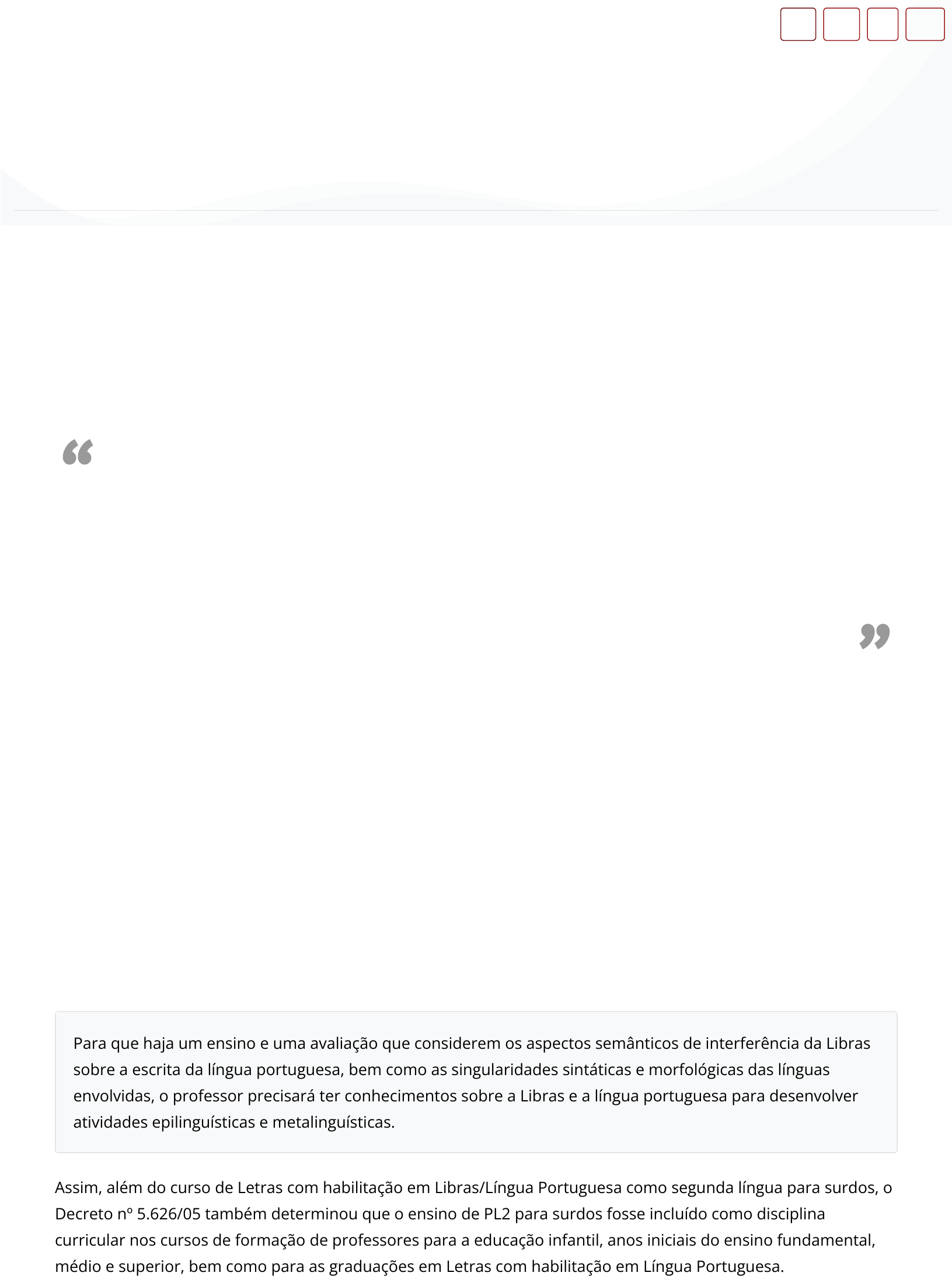 Fundamentação legal do ensino de língua portuguesa como segunda língua para surdos Para iniciarmos esta webaula, é preciso saber que o Decreto nº 5.626/05 determina que é direito do aluno surdo, desde a educação infantil, ter acesso ao ensino da língua portuguesa como segunda língua (PL2), e, para tanto, as instituições federais de ensino devem promover capacitações e/ou pro�ssionais capacitados para exercerem tal função. O reconhecimento da condição dos surdos como aprendizes de PL2 também é previsto na meta 4 do Plano Nacional de Educação (PNE), aprovado pela Lei nº 13.005/2014, na qual se estabelece como estratégia: garantir a oferta de educação bilíngue, em Língua Brasileira de Sinais – LIBRAS como primeira língua e na modalidade escrita da Língua Portuguesa como segunda língua, aos (às) alunos (as) surdos e com de�ciência auditiva de 0 (zero) a 17 (dezessete) anos, em escolas e classes bilíngues e em escolas inclusivas [...] — (BRASIL, 2014, grifo nosso). “ ”A modalidade escrita da língua portuguesa é visual e, portanto, acessível aos surdos, mas é preciso lembrar que os professores estão habituados a partirem dos conhecimentos do português oral para o ensino da escrita, e isso não será frutífero com os educandos surdos. Por essa razão, o ensino de língua portuguesa como segunda língua signi�ca, basicamente, partir da Libras como primeira língua (L1) para se chegar ao português, ou seja, a Libras substituirá o português oral nas relações que o professor estabelecer entre o discurso verbal e o escrito. A legislação prevê ainda que as instituições de ensino devem “adotar mecanismos de avaliação coerentes com aprendizado de segunda língua, na correção das provas escritas, valorizando o aspecto semântico e reconhecendo a singularidade linguística manifestada no aspecto formal da Língua Portuguesa” (BRASIL, 2005). O decreto ainda menciona que é possível desenvolver outras formas de avaliação para conhecimentos expressos em Libras, desde que registrados em vídeos ou outros meios eletrônicos e tecnológicos. Para que haja um ensino e uma avaliação que considerem os aspectos semânticos de interferência da Libras sobre a escrita da língua portuguesa, bem como as singularidades sintáticas e morfológicas das línguas envolvidas, o professor precisará ter conhecimentos sobre a Libras e a língua portuguesa para desenvolver atividades epilinguísticas e metalinguísticas. Assim, além do curso de Letras com habilitação em Libras/Língua Portuguesa como segunda língua para surdos, o Decreto nº 5.626/05 também determinou que o ensino de PL2 para surdos fosse incluído como disciplina curricular nos cursos de formação de professores para a educação infantil, anos iniciais do ensino fundamental, médio e superior, bem como para as graduações em Letras com habilitação em Língua Portuguesa. Libras – Língua Brasileira de Sinais A língua portuguesa como segunda língua para surdos Você sabia que seu material didático é interativo e multimídia? Isso signi�ca que você pode interagir com o conteúdo de diversas formas, a qualquer hora e lugar. Na versão impressa, porém, alguns conteúdos interativos �cam desabilitados. Por essa razão, �que atento: sempre que possível, opte pela versão digital. Bons estudos! A- A A+ No entanto, soma-se à necessidade de um professor capacitado, também, a exigência de um espaço diferenciado para esse trabalho, a�nal, enquanto o professor trabalha com o ensino de português como primeira língua (baseando-se, sobretudo, nas relações da escrita com a língua oral), será quase impossível que ele consiga, concomitantemente, atender aos alunos surdos (estabelecendo relações entre a língua escrita e a língua de sinais). Em geral, em virtude de situações como essa, é comum que, em classes regulares, com a presença de intérpretes de Libras, opte-se por retirar os alunos surdos da sala regular em dois momentos: 1. Para o ensino de Libras como primeira língua e 2. Para o ensino de língua portuguesa como segunda língua. Para tais atividades, os alunos surdos são acompanhados por professores diferentes daquele da sala regular e sob abordagens de ensino distintas daquelas adotadas com os alunos ouvintes. A escrita de alunos surdos O aprendizado da língua escrita por alunos surdos se difere dos ouvintes, pois é in�uenciado pelos aspectos linguísticos da Libras, o que, segundo Quadros e Schmiedt (2006), está relacionado ao sistema de interlíngua existente nesse contexto, ou seja, níveis de so�sticação apresentados durante a aquisição linguística com características especí�cas do percurso que o sujeito trilha ao partir da primeira para a segunda língua. Segundo as autoras, esse processo também é enfrentado por outros aprendizes de segunda língua ou de língua estrangeira. Fonte: iStock. Quadros e Schmiedt (2006) destacam que a interlíngua não ocorre de forma desorganizada. Há hipóteses e regras que são comuns entre os aprendizes surdos de PL2, que ilustram esse processo de construção de um sistema linguístico que já não é mais a primeira língua do aluno, mas também ainda não é a segunda língua. Baseado nos estudos de Brochado (2003 apud QUADROS; SCHMIEDT, 2006), as autoras destacam três estágios de interlíngua identi�cados em crianças surdas. Primeiro estágio: é marcado, por exemplo, por frases bastante sintéticas e a sintaxe ainda é majoritariamente organizada na estrutura da Libras (tópico comentário e não sujeito verbo objeto). Há ausência ou inadequação do uso de preposições, artigos, conjunção (elementos ausentes na Libras) e predominância de verbos no in�nitivo com pouca ocorrência ou uso inadequado de verbos de ligação, como, por exemplo, ser e estar (verbos dispensados em enunciados da Libras). Assim, além de erros ortográ�cos, as frases são curtas com inadequa