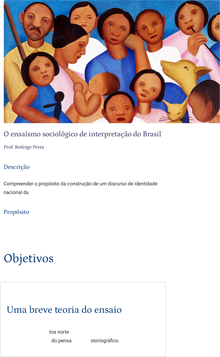 01/03/24, 06:14 O ensaísmo sociológico de interpretação do Brasil https://stecine.azureedge.net/repositorio/00212hu/04409/index.html# 1/46 O ensaísmo sociológico de interpretação do Brasil Prof. Rodrigo Perez Descrição Compreender o propósito da construção de um discurso de identidade nacional durante os primeiros anos da República. Propósito Estudar o regime historiográfico ensaísta no Brasil. Objetivos Módulo 1 Uma breve teoria do ensaio Examinar os conceitos norteadores que envolvem o ensaio como forma de expressão do pensamento historiográfico. 01/03/24, 06:14 O ensaísmo sociológico de interpretação do Brasil https://stecine.azureedge.net/repositorio/00212hu/04409/index.html# 2/46 Módulo 2 O regime historiográ�co ensaísta no Brasil Analisar o regime ensaísta na historiografia brasileira entre fins do século XIX e a década de 1950. Módulo 3 Os autores ensaístas e suas obras Examinar os autores reconhecidos como as três principais fontes do ensaísmo brasileiro: Gilberto Freyre, Caio Prado Júnior e Sérgio Buarque de Holanda. Introdução O final do século XIX foi marcado por transformações profundas na sociedade brasileira. A monarquia dava sinais de cansaço e as elites políticas tradicionais não mais conseguiam sustentar o regime. A fundação do Partido Republicano, em 1870, mostrou que a monarquia não era mais um consenso entre as classes dirigentes. Reforma do sistema educacional, abolição da escravidão, federalismo administrativo e a própria República eram demandas por mudanças na estrutura política, social e administrativa do país. As transformações se deram também na esfera intelectual. Uma nova geração de pensadores passou a questionar o establishment intelectual que havia fundado o Estado nacional brasileiro. Jovens como Silvio Romero, Joaquim Nabuco, Assis Brasil e outros tantos se notabilizaram por formarem aquilo que 01/03/24, 06:14 O ensaísmo sociológico de interpretação do Brasil https://stecine.azureedge.net/repositorio/00212hu/04409/index.html# 3/46 na época ficou conhecido como “geração de 1870”. O historiador cearense Capistrano de Abreu foi um dos representantes dessa atmosfera de renovação intelectual, especificamente no que se refere às suas críticas à historiografia oficial produzida pelo Instituto Histórico e Geográfico Brasileiro, o IHGB. Em 1878, na ocasião da morte de Francisco Adolfo de Varnhagen, Capistrano de Abreu publicou no Jornal do Comércio um obituário. Tratava-se de um dos maiores veículos da imprensa da época e o texto pode ser considerado a estreia do então jovem historiador na cena intelectual da Corte. No texto, que era para ser uma homenagem a Varnhagen, na época reconhecido como o grande “historiador da pátria”, Capistrano de Abreu fez uma crítica teórica e política ao IHGB e ao próprio Visconde de Porto Seguro. Essa historiografia oficial seria politicamente conservadora e hostil ao povo. Não estaria alinhada às novidades da sociologia moderna e ainda teria um estilo enfadonho, não sendo capaz de produzir uma síntese explicativa da história nacional que pudesse colaborar para a modernização do Brasil. Na prática, Capistrano de Abreu estava propondo uma agenda historiográfica que seria colocada em prática ao longo da primeira metade do século XX, e que podemos chamar de “ensaísmo de interpretação do Brasil”. É este o tema que estudaremos aqui. Establishment A elite estabelecida intelectual. 01/03/24, 06:14 O ensaísmo sociológico de interpretação do Brasil https://stecine.azureedge.net/repositorio/00212hu/04409/index.html# 4/46 1 - Uma breve teoria do ensaio Ao �nal deste módulo, você será capaz de examinar os conceitos norteadores que envolvem o ensaio como forma de expressão do pensamento historiográ�co. O ensaio como forma na teoria de Theodor Adorno Dizer que, entre o final do século XIX e meados do século XX, a historiografia brasileira foi caracterizada por um “regime ensaísta” pressupõe uma definição baseada na forma. Segundo essa definição, o ensaio foi a forma de expressão dominante entre os letrados que, no período, se dedicaram ao estudo da história nacional. Mas o que significa escrever um ensaio? Em que medida o ensaio se diferencia de outros estilos de escrita? Resposta É necessário definir ensaio neste contexto, esclarecendo suas principais características. É esse o nosso esforço nesse momento. Dialogaremos, a seguir, diretamente com as teorias do ensaio desenvolvidas por Theodor Adorno e Georg Lukács. Segundo Adorno, a forma ensaística precisa ser historicamente situada na modernidade, mais especificamente no século XVIII, quando surge como resposta ao cientificismo cartesiano. Segundo o autor, a revolução científica que aconteceu na Europa entre os séculos XVI e 01/03/24, 06:14 O ensaísmo sociológico de interpretação do Brasil https://stecine.azureedge.net/repositorio/00212hu/04409/index.html# 5/46 XVIII resultou no paradigma teorizado por René Descartes (1596-1650) no seu Discurso sobre o Método, publicado na década de 1680. Segundo esse paradigma, que viria a estruturar a ciência moderna, a linguagem tem dimensão de apenas apresentação, e sua função limitada a comunicar a operacionalidade do método. A autoridade do conhecimento pertenceria ao método, entendido como o procedimento executado pelo cientista, imune a qualquer subjetividade. O cientista cartesiano, portanto, é pretensamente universal, sem gênero, sem raça e sem nacionalidade. Tratado como operador do método, o conhecimento que produz e comunica por uma linguagem, pretensamente neutra, é também pretensamente, objetivo. Como podemos perceber, a ciência moderna é marcada pela pretensão. Pretensão à universalidade, à objetividade e à neutralidade. Para Adorno, o ensaio surge como questionamento a essas pretensões, como um ato de resistência da subjetividade sufocada pela cientificidade cartes