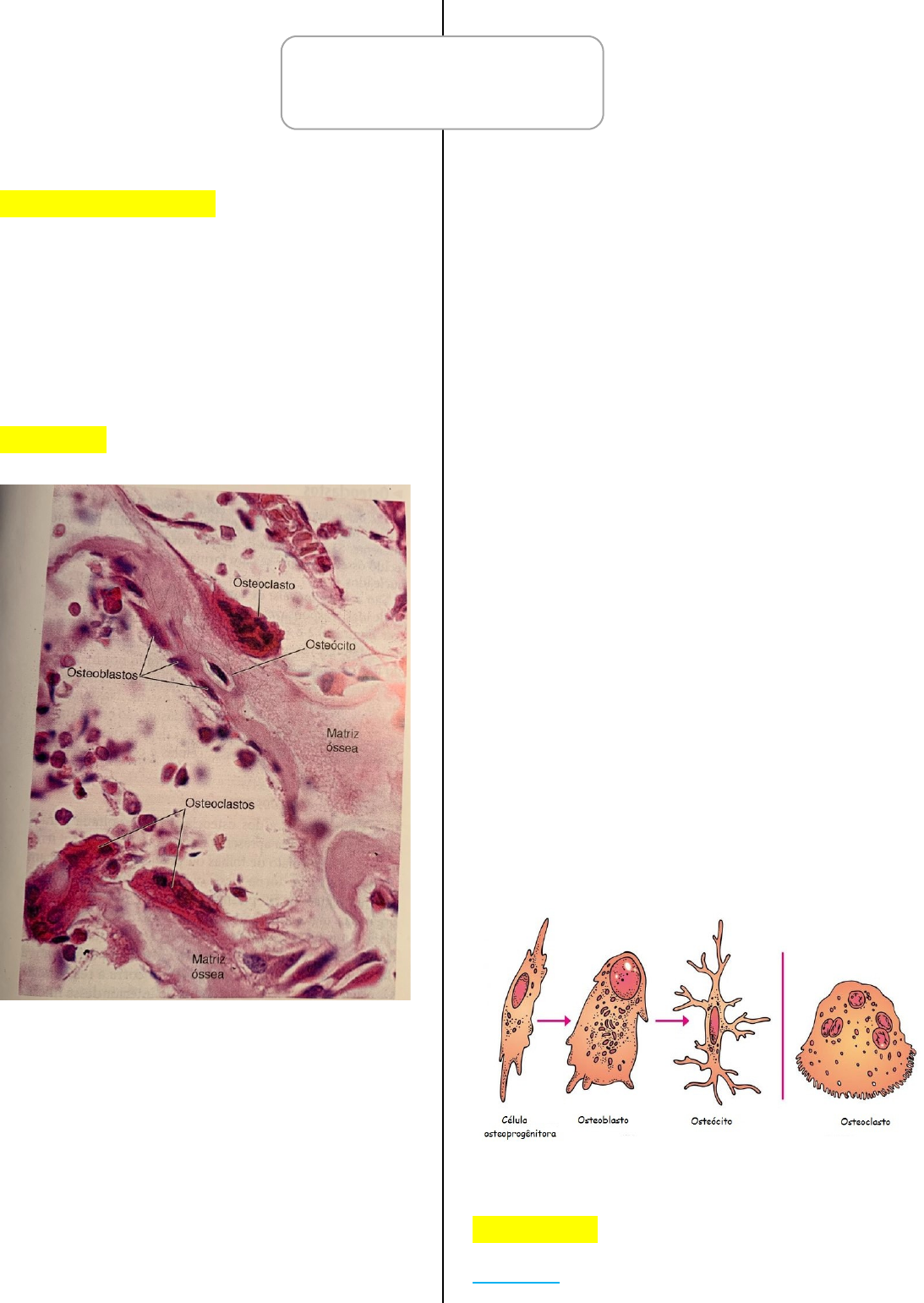 TECIDO ÓSSEO CARACTERÍSTICAS -faz parte do tecido conjuntivo -matriz extracelular mineralizada -suporte e proteção -depósito de cálcio e fosfato CÉLULAS Osteoprogenitoras -derivam das células tronco mesenquimais -originam osteoblastos Osteoblastos -sintetizam a parte orgânica da matriz -atividade sintética: intensa(cuboides) ou reduzida(achatadas) Osteócitos *encontrados no interior da matriz óssea e ocupam as lacunas. *canalículos :permite a nutrição (através da comunicação com outros osteóscito) Osteoclastos -células grandes -multinucleadas, ramificadas e móveis -reabsorvem o tecido ósseo(remodelação óssea) Matriz Óssea Orgânica: -colágeno tipo I -subst. Fundamental (proteoglicanos, glicoprotreínas) Inorgânica: -fosfato e cálcio REVESTIMENTO -derivadas dos osteoblasto -nutrição do tecido -fornece novos osteoblastos *Endósteo (interna) -células osteoprogenitoras *Periósteo (externa) -células osteoprogenitoras - Fibras de sharpey CLASSIFICAÇÃO *Estrutural 1)osso compacto 2)osso esponjoso *Formato 1)ossos longos 2)curtos 3)planos 4)ossos irregulares *Constituição Histológica 1)primário (não lamelar) -encontrado no desenvolvimento fetal -mais osteócitos -fibras desorganizadas - menos mineralizada 2)secundário (lamelar) - maior deposição mineral -fibras colágenas organizadas Lamelas organizadas formam o “canal de havers” (mais comum na periferia da diáfise de ossos longos) TIPOS DE OSSIFICAÇÃO 1)intramembranosa - centro de ossificação primário -produz matriz osteóide 2)endocondral -molde de cartilagem hialina -formação de ossos curtos e longos Obs: disco epifisário: Disco de cartilagem hialina que não foi penetrado por tecido ósseo durante a ossificação. -entre a diáfise e as epífises -crescimento longitudinal dos ossos ARTICULAÇÕES Pontos de união entre ossos 1)sinartroses -sinostoses :unidos por tecidos ósseos Ex: ossos do crânio -sincondroses :cartilagem hialina Ex: articulação da 1 costela -sindesmoses: tecido conjuntivo denso Ex: sínfise púbica 2)diartroses -união de ossos longos -cápsula articular -cavidade articular: líquido sinovial REMODELAÇÃO ÓSSEA image1.png image2.jpeg image3.jpeg image4.png
