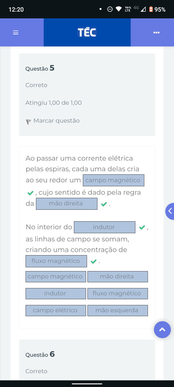 12:20 4G LTE + 95% Questão 5 Correto Atingiu 1,00 de 1,00 Marcar questão Ao passar uma corrente elétrica pelas espiras, cada uma delas cria ao seu redor um campo magnético , cujo sentido é dado pela regra da mão direita No interior do indutor , as linhas de campo se somam, criando uma concentração de fluxo magnético campo magnético mão direita indutor fluxo magnético campo elétrico mão esquerda Questão 6 Correto