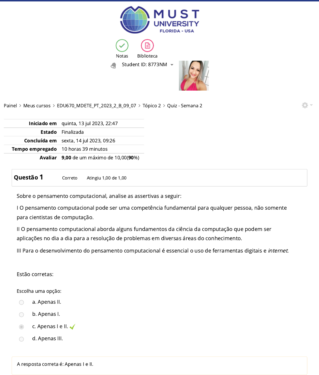 Painel Meus cursos EDU670_MDETE_PT_2023_2_B_09_07 Tópico 2 Quiz - Semana 2 Student ID: 8773NM Notas Biblioteca Iniciado em quinta, 13 jul 2023, 22:47 Estado Finalizada Concluída em sexta, 14 jul 2023, 09:26 Tempo empregado 10 horas 39 minutos Avaliar 9,00 de um máximo de 10,00(90%) Questão 1 Correto Atingiu 1,00 de 1,00 Sobre o pensamento computacional, analise as assertivas a seguir: I O pensamento computacional pode ser uma competência fundamental para qualquer pessoa, não somente para cientistas de computação. II O pensamento computacional aborda alguns fundamentos da ciência da computação que podem ser aplicações no dia a dia para a resolução de problemas em diversas áreas do conhecimento. III Para o desenvolvimento do pensamento computacional é essencial o uso de ferramentas digitais e internet. Estão corretas: Escolha uma opção: a. Apenas II. b. Apenas I. c. Apenas I e II. d. Apenas III. A resposta correta é: Apenas I e II. https://my.mustedu.com/my/ https://my.mustedu.com/course/view.php?id=860 https://my.mustedu.com/course/view.php?id=860#section-2 https://my.mustedu.com/mod/quiz/view.php?id=70794 https://my.mustedu.com/ https://my.mustedu.com/ https://my.mustedu.com/user/view.php?id=8560&course=860 https://my.mustedu.com/custom/minhas_notas.php Questão 2 Correto Atingiu 1,00 de 1,00 Quanto aos tipos de mídias identi�que a opção correta: Escolha uma opção: a. As variações de formatos de mídias digitais ocorrem apenas em áudios e vídeos. b. Quando se consideram os formatos de áudios, vídeos, imagens e textos, tem-se múltiplas possibilidades, cada um com as suas características e especi�cidades. c. As mídias sociais não permitem compartilhamento de conteúdo e interação via internet. d. Na educação, apenas alguns tipos de mídias digitais podem ser utilizados para apoio aos processo de ensino e aprendizagem. A resposta correta é: Quando se consideram os formatos de áudios, vídeos, imagens e textos, tem-se múltiplas possibilidades, cada um com as suas características e especi�cidades. Questão 3 Correto Atingiu 1,00 de 1,00 Quanto à arquitetura geral de organização dos sistemas de computadores está correto o que se a�rma em: Escolha uma opção: a. os componentes de um computador de modo geral são unidade central de controle e processamento; os periféricos de entrada e de saída e os dispositivos de armazenamento. b. a organização é feita por usuários, software e hardware. c. os componentes de um computador de modo geral são unidade de acesso à internet, tablets e smartphones. d. é composta de sistemas operacionais, softwares livres e impressoras. A resposta correta é: os componentes de um computador de modo geral são unidade central de controle e processamento; os periféricos de entrada e de saída e os dispositivos de armazenamento. Questão 4 Correto Atingiu 1,00 de 1,00 Sobre os algoritmos no contexto computacional, identi�que a a�rmativa verdadeira: Escolha uma opção: a. Os �uxogramas e os pseudocódigos são exemplos de formas de representar os algoritmos computacionais. b. Não há problemas que não possam ser resolvidos computacionalmente por algoritmos. c. A escrita de um algoritmo requer conhecimento em alguma linguagem de programação de computadores. d. Apenas cientistas da computação precisam conhecer o conceito de algoritmo. A resposta correta é: Os �uxogramas e os pseudocódigos são exemplos de formas de representar os algoritmos computacionais. Questão 5 Correto Atingiu 1,00 de 1,00 As características que fazem parte do pensamento computacional são: Escolha uma opção: a. literatura, artes e desenvolvimento motor. b. expressionismo, abstração e algoritmos. c. psicomotricidade, abstração e algoritmos. d. decomposição, reconhecimento de padrões, generalização e abstração e algoritmos. A resposta correta é: decomposição, reconhecimento de padrões, generalização e abstração e algoritmos. Questão 6 Incorreto Atingiu 0,00 de 1,00 Considerando os benefícios que os serviços e aplicativos on-line oferecem à educação, analise as a�rmativas a seguir: I Uma das maiores vantagens para a educação é fazer com que os estudantes façam silêncio na sala de aula. II Atividades de comunicação, uso de arquivos e colaboração para criação de conteúdos são algumas das vantagens para o processo de ensino e aprendizagem. III Para a gestão acadêmica também há inúmeras vantagens do uso de aplicativos e soluções on-line, como por exemplo a necessidade de menor investimento em infraestrutura física de computadores. Estão corretas as a�rmativas: Escolha uma opção: a. Apenas I. b. Apenas I e II. c. Apenas II e III d. Apenas II. A resposta correta é: Apenas II e III Questão 7 Correto Atingiu 1,00 de 1,00 As mídias podem favorecer o processo de ensino e aprendizagem. Nesse contexto, analise as a�rmativas a seguir: I Apenas as mídias digitais podem ser utilizadas na educação. II O uso das mídias digitais requer o uso de programas que reconheçam os formatos de gravação dos arquivos para a devida reprodução. III As mídias podem favorecer o processo de ensino e aprendizagem porque permitem trazer recursos do cotidiano para contextualizar, motivar e promover interações entre os estudantes e professores. Estão corretas: Escolha uma opção: a. Apenas I. b. Apenas II e III c. Apenas III. d. Apenas II. A resposta correta é: Apenas II e III Questão 8 Correto Atingiu 1,00 de 1,00 Sobre os sistemas operacionais, analise as a�rmativas a seguir: I É um software responsável pelo gerenciamento, funcionamento e execução dos programas em um computador ou dispositivo móvel. II É um software que não é necessário em dispositivos móveis como tablets e smartphones. III Trata-se sempre de um software livre, pois o sistema de computadores não funciona sem as suas funções. Está correto o que se a�rma em: Escolha uma opção: a. Apenas I e II b. Em