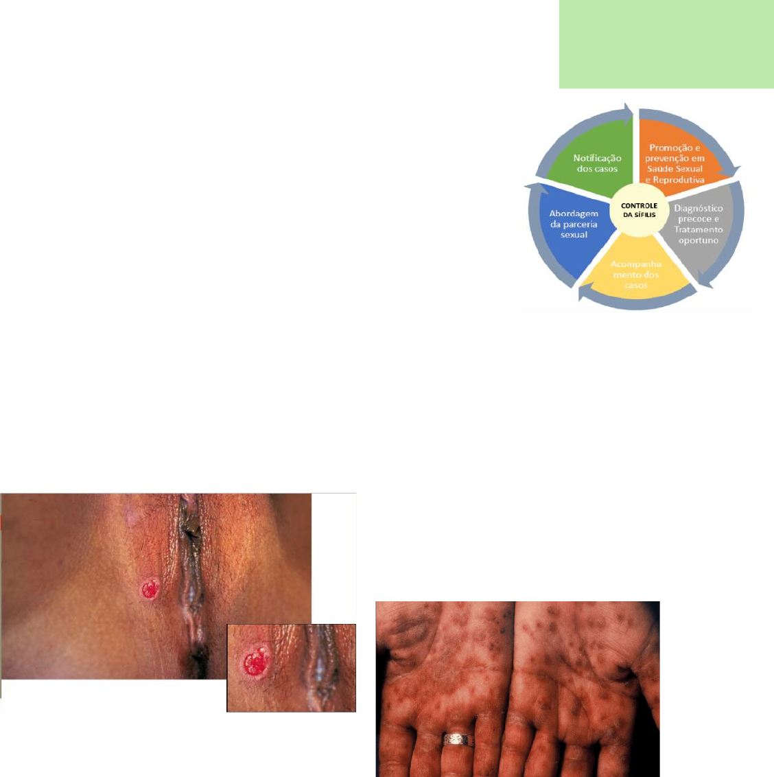 A sífilis é uma Infecção Sexualmente Transmissível (IST) curável, causada pela bactéria Treponema pallidum. Pode apresentar várias manifestações clínicas e diferentes estágios (sífilis primária, secundária, latente e terciária). Notificação obrigatória em sífilis adquirida, sífilis em gestante (pré-natal, parto e puerpério) e sífilis congênita. Abordagem integral na Atenção Primária Acelerar e concentrar esforços abrangentes de prevenção por meio da ampliação de abordagens comportamentais, biomédicas e estruturais combinadas baseadas em evidências; Facilitar o acesso das pessoas a informações sobre seu status de infecção sexualmente transmissível; Melhorar o acesso ao tratamento e cuidados abrangentes de longo prazo quando necessário; Desafiar a estigmatização e discriminação generalizadas. Transmissão A sífilis pode ser transmitida por relação sexual sem camisinha com uma pessoa infectada ou para a criança durante a gestação ou parto. Nos estágios primário e secundário da infecção, a possibilidade de transmissão é maior. Em gestantes não tratadas ou tratadas inadequadamente a taxa de transmissão é de 80% para o feto, nos estágios iniciais – primária, secundária e latente recente. SÍFILIS PRIMÁRIA Ferida, geralmente única, no local de entrada da bactéria (pênis, vulva, vagina, colo uterino, boca, ou outros locais da pele), que aparece entre 10 e 90 dias após o contágio. Essa lesão rica em treponemas é chamada de “cancro duro”: indolor, com base endurecida e fundo limpo, que normalmente não coça, não arde e não tem pus; Geralmente, é acompanhada de linfadenopatia inguinal; Esse estágio pode durar entre duas a seis semanas e desaparecer de forma espontânea, independentemente de tratamento. SÍFILIS SECUNDÁRIA Os sinais e sintomas aparecem entre seis semanas e seis meses do aparecimento e cicatrização da ferida inicial; As lesões secundárias são ricas em treponemas, podendo ocorrer: erupções cutâneas em forma de máculas (roséola) e/ou pápulas, principalmente no tronco; lesões eritemato-escamosas palmo-plantares (a localização sugere fortemente sífilis secundária); placas eritematosas branco-acinzentadas nas mucosas; lesões pápulo-hipertróficas nas mucosas ou pregas cutâneas (condiloma plano ou condiloma lata); Pode ocorrer alopecia em clareira e madarose (perda da sobrancelha, em especial do terço distal); Pode ocorrer febre, mal-estar, dor de cabeça, ínguas pelo corpo; As manchas desaparecem em algumas semanas, independentemente de tratamento, trazendo a falsa impressão de cura. SÍFILIS LATENTE – FASE ASSINTOMÁTICA Não aparecem sinais ou sintomas; É dividida em: latente recente (até um ano de infecção) e latente tardia (mais de um ano de infecção). A duração dessa fase é variável, podendo ser interrompida pelo surgimento de sinais e sintomas da forma secundária ou terciária. SÍFILIS TERCIÁRIA Cerca de 30% dos pacientes que não foram tratados após um longo período de latência – podendo surgir 2 a 40 anos após o início da infecção. Costuma apresentar sinais e sintomas, principalmente lesões cutâneas, ósseas, cardiovasculares e neurológicas, podendo levar à morte. Abordagem da SÍFILIS na APS Raphaela Faria – Medicina XXIX Considerada rara – a maioria da população recebe indiretamente, ao longo da vida, antibióticos com ação sobre o agente causador da doença Formação de gomas sifilíticas – tumorações com tendência à liquefação em pele, mucosas, osso ou qualquer tecido. SÍFILIS ADQUIRIDA Indivíduo assintomático com teste não treponêmico reagente com qualquer titulação e teste treponêmico reagente sem registro de tratamento prévio; Indivíduo sintomático para sífilis com pelo menos um teste reagente – treponêmico ou não treponêmico com qualquer titulação. SÍFILIS EM GESTANTE Mulher assintomática para sífilis, que durante o pré-natal, parto e/ou puerpério apresenta pelo menos um teste reagente – treponêmico e/ou não treponêmico com qualquer titulação – e sem registro de tratamento prévio; Mulher sintomática para sífilis, que durante o pré-natal, parto e/ou puerpério apresenta pelo menos um teste reagente – treponêmico e/ou não treponêmico com qualquer titulação; Mulher que durante o pré-natal, parto e/ou puerpério apresenta teste não treponêmico reagente, com qualquer titulação mais teste treponêmico reagente, independente de sintomatologia e de tratamento prévio. Testes imunológicos para o diagnóstico de sífilis • Exames diretos: a pesquisa direta de T. pallidum nas sífilis recente primária e secundária pode ser feita pela microscopia de campo escuro (sensibilidade de 74% a 86%). Quando isso não é possível, a pesquisa do treponema pode ser realizada por imunofluorescência direta e biópsias. • Testes imunológicos: são os mais utilizados na prática diária. Dividem-se em treponêmicos e não treponêmicos. TESTES TREPONÊMICOS Detectam anticorpos específicos produzidos contra os antígenos do T. pallidum. São os primeiros a se tornarem reagentes: importantes para diagnóstico. Testes rápidos – são práticos e de fácil execução, podendo ser realizados com amostras de sangue total colhidas por punção venosa ou por punção digital. • Testes de hemaglutinação e aglutinação passiva – TPHA • TESTE DE IMUNOFLUORESCÊNCIA INDIRETA – FTA – MAIS UTILIZADO • Quimioluminescência • Ensaio Imunoenzimático indireto ELISA Na maioria das vezes, mesmo após o tratamento, permanecem positivos; por isso, não são indicados para o monitoramento da resposta ao tratamento. TESTES NÃO TREPONÊMICOS Detectam anticorpos não específicos para os antígenos do T. pallidum. Tornam-se reagentes cerca de uma a três semanas após o aparecimento do cancro duro. São utilizados para auxiliar no diagnóstico (como primeiro teste ou teste complementar), para o mon