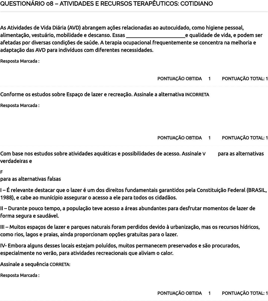 QUESTIONÁRIO 08 – ATIVIDADES E RECURSOS TERAPÊUTICOS: COTIDIANO PONTUAÇÃO TOTAL: 1PONTUAÇÃO OBTIDA 1 As Atividades de Vida Diária (AVD) abrangem ações relacionadas ao autocuidado, como higiene pessoal, alimentação, vestuário, mobilidade e descanso. Essas _______________________e qualidade de vida, e podem ser afetadas por diversas condições de saúde. A terapia ocupacional frequentemente se concentra na melhoria e adaptação das AVD para indivíduos com diferentes necessidades. Resposta Marcada : Atividades são cruciais para a independência PONTUAÇÃO TOTAL: 1PONTUAÇÃO OBTIDA 1 Conforme os estudos sobre Espaço de lazer e recreação. Assinale a alternativa INCORRETA Resposta Marcada : Espaços de lazer e recreação são áreas, estruturas construídas ou ambientes naturais projetados para serem utilizados pelas pessoas durante seu tempo de trabalho. Nesses locais, uma ampla gama de atividades, programas e eventos de lazer é desenvolvida e oferecida aos visitantes. PONTUAÇÃO TOTAL: 1PONTUAÇÃO OBTIDA 1 Com base nos estudos sobre atividades aquáticas e possibilidades de acesso. Assinale V para as alternativas verdadeiras e F para as alternativas falsas I – É relevante destacar que o lazer é um dos direitos fundamentais garantidos pela Constituição Federal (BRASIL, 1988), e cabe ao munícipio assegurar o acesso a ele para todos os cidadãos. II – Durante pouco tempo, a população teve acesso a áreas abundantes para desfrutar momentos de lazer de forma segura e saudável. III – Muitos espaços de lazer e parques naturais foram perdidos devido à urbanização, mas os recursos hídricos, como rios, lagos e praias, ainda proporcionam opções gratuitas para o lazer. IV- Embora alguns desses locais estejam poluídos, muitos permanecem preservados e são procurados, especialmente no verão, para atividades recreacionais que aliviam o calor. Assinale a sequência CORRETA: Resposta Marcada : F – F – V – V 15/07/24, 14:03 Course Status – AVA Saúde Unifaveni https://ava.saude.unifaveni.com.br/course-status/ 1/2 5 / 5 PONTUAÇÃO TOTAL: 1PONTUAÇÃO OBTIDA 1 Assinale a primeira coluna de acordo com a segunda: 1. Zonas litorâneas 2. Parques e praças 3. Ecoturismo ( ) O lazer em áreas com vegetação e fauna nativas foi explorado por muitos anos, causando sérios problemas aos ecossistemas locais. ( ) Oferecem vastas oportunidades para desfrutar de atividades de lazer. O espaço expansivo, a presença do oceano e, em alguns casos, as formações rochosas proporcionam uma variedade de atividades e esportes. ( ) Alguns desses locais não apenas oferecem a oportunidade de apreciar vegetações raras nas metrópoles, mas também permitem a contemplação de pequenos lagos, jardins botânicos e minizoológicos, proporcionando experiências de convívio com outras formas de vida do nosso planeta. Marque a sequência CORRETA da associação entre as colunas: Resposta Marcada : 3 – 1 – 2 PONTUAÇÃO TOTAL: 1PONTUAÇÃO OBTIDA 1 Conforme os estudos sobre escolas e educação ambiental. Analise a sequência abaixo: I – O interesse pela preservação ambiental tem crescido ao longo do tempo, também in�uenciando questões pedagógicas. II – Mesmo que muitas instituições educacionais tenham espaços limitados para atividades ao ar livre e, frequentemente, precisem recorrer a excursões em parques, praias e praças para desenvolver tais iniciativas, algumas escolas têm investido na criação de jardins sensoriais. III – As atividades de lazer em aquáticos naturais são variadas e podem atender a diferentes preferências, desde aqueles que buscam relaxamento até aqueles que buscam aventura e desa�os. IV – Embora haja muitas áreas disponíveis para o lazer, é fundamental que o Poder Público continue a desempenhar um papel importante na manutenção da democratização desses espaços, garantindo que o lazer seja um direito acessível a todos os cidadãos brasileiros. Assinale a alternativa que reúne as assertivas CORRETAS . Resposta Marcada : Apenas I, II e IV. Total de Pontos 15/07/24, 14:03 Course Status – AVA Saúde Unifaveni https://ava.saude.unifaveni.com.br/course-status/ 2/2