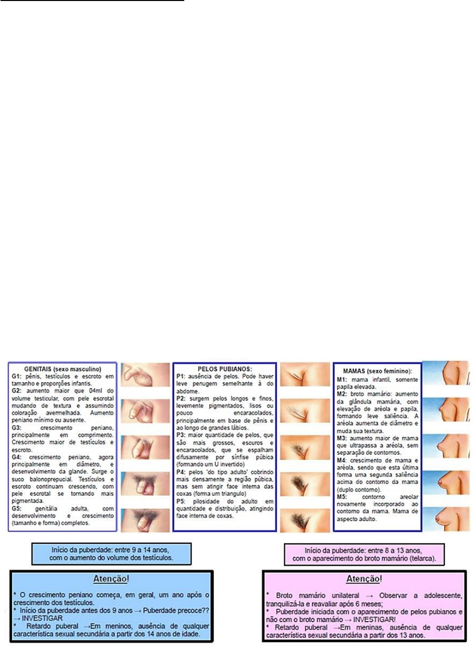 DESENVOLVIMENTO PUBERAL - Adolescência ≠ Puberdade - Adolescência é um período CRONOLÓGICO no qual o indivíduo irá passar por alterações biológicas, psicológicas e comportamentais. OMS 10-20 anos. ECA 12-18 anos. - Puberdade são modificações BIOLÓGICAS marcadas principalmente pelo desenvolvimento dos caracteres sexuais secundários e pela aceleração do crescimento. Gonadarca e Adrenarca. H= 9-14 anos e M= 8-13 anos. - Gonadarca: início indeterminado. Ativação do eixo HHG (hipotálamo, hipófise, gônada). O hipotálamo começa a liberar GnRh de forma pulsátil o que estimula a liberação de LH e FSH pela hipófise. As gonadotrofinas estimulam a secreção de esteroides pelas gônadas → caracteres sexuais secundários e aceleração do crescimento. O LH estimula produção de estrogênios nos ovários e de testosterona nos testículos. FSH estimula produção/maturação dos gametas. - Adrenarca: momento em que a adrenal começa a secretar androgênio além do cortisol e mineralocorticoides. Ativação do eixo HHA (hipotálamo, hipófise, adrenal). Hiperplasia da camada reticular aumentando a produção de DHAEA, SDHAEA e androstenediona → responsáveis pela pilifícação e glândulas apócrinas (suor e acne). - Estadiamento de Tanner: separou os eventos puberais em 5 estágios. - A telarca (aparecimento do broto mamário – M2) é o primeiro sinal da puberdade na menina. - Em M3 ou de M2 para M3 ocorre um pico de crescimento da estatura de 8-9 cm/ano. - Geralmente a menarca ocorre em M4, cerca de 2-2,5 anos após a telarca. M4 duplo contorno. - Depois da menarca o crescimento é desacelerado. - No sexo feminino geralmente a sequência é Telarca – Pubarca – Menarca. - P2 é quando ocorre a pubarca, marca a adrenarca. Pelos apenas sobre os grandes lábios. - O menino entra na puberdade em G2, primeiro sinal é o aumento do volume testicular (≥ 4 ml). - G3 aumento do pênis em comprimento. - G4 aumento do pênis em diâmetro – o contorno da glande se destaca. Pico do crescimento em estatura 9-10 cm/ano. · PUBERDADE PRECOCE - No sexo feminino começa antes dos 8 anos. Nos meninos começa antes dos 9 anos. - Tem que ter caractere secundário E aceleração do crescimento. - Se tem puberdade precoce tem baixa estatura, pois inicia o crescimento antes e termina antes também. - Um sinal de puberdade isolado com velocidade de crescimento compatível para idade não dá diagnóstico de puberdade precoce. Precisa de pelo menos dois sinais com velocidade de crescimento acelerada. - Avanço na idade óssea → fechamento epifisário mais intenso que a aceleração do ritmo de crescimento. Durante a infância é alta, mas terá baixa estatura na vida adulta. I. CENTRAL/VERDADEIRA/COMPLETA - Ativação precoce do eixo HHG → GnRh dependente. - Idiopática: diagnóstico de exclusão, geralmente apresenta um padrão mais lento. - Lesão do SNC: geralmente em indivíduo < 4 anos; tumores como hamartoma de hipotálamo, teratoma e craniofaringioma. Segue cronologia usual da puberdade. - Mais comum no sexo feminino, sendo a idiopática a principal causa nessa população. - No sexo masculino a principal causa é a lesão do SNC. - ↑ de LH e FSH, ↑ da relação LH/FSH (>1). - Sinais normais do sexo biológico (isossexual). II. PERIFÉRICA/PSEUDOPUBERDADE PRECOCE - Independe do GnRh, do estímulo central. - Não tem ativação do eixo HHG. - Doença Gonadal: tumor ovariano produtor de esteroides. - Doença Adrenal: tumores adrenais produtores de estrogênios, hiperplasia adrenal congênita. - LH e FSH em níveis pré-puberais. - Sinais de virilização nas meninas → doença adrenal. - Volume testicular pré-puberal na doença adrenal. - Assimetria testicular geralmente aponta para tumor de testículo (doença gonadal). - Síndrome de McCune-Albright: a tríade clássica inclui manchas de cor café com leite, com bordas irregulares (85%), displasia óssea fibrosa poliostótica (97%) e puberdade precoce periférica (52%). Corresponde a 5% dos casos de pseudopuberdade precoce. Ativação autônoma de várias glândulas. - Hiperplasia Adrenal Congênita: deficiência enzimática que compromete a síntese do cortisol. Sem feedback inibitório do ACTH. Mais comum é a deficiência da 21-hidroxilase, que faz parte da síntese do cortisol e dos mineralocorticoides. Há desvio dos precursores para a via de síntese de androgênios → GENITÁLIA VIRILIZADA NAS MENINAS. III. INCOMPLETA/VARIANTES BENIGNAS DO DESENVOLVIMENTO PUBERAL - Desenvolvimento isolado de caracteres sexuais. - Não patogênico. - Comum em filhas de mães grandes. - Não tem correlação com a cronologia da puberdade. · Consequências da Puberdade Precoce - Não há repercussão na menopausa. - Não repercussão na fertilidade. - Redução da estatura final → fechamento precoce das epífises ósseas. - Questão psicossocial → não reconhecimento/aceitação do próprio corpo. · Quadro Clínico - Telarca precoce, secreção vaginal branca (s/ ser RN, pois nesse público pode ser efeito dos estrogênios maternos). - Menarca precoce. - Aceleração do crescimento. - Labilidade emocional. · Diagnóstico - Clínico: tempo de evolução (SNC x Idiopático), sinais e sintomas do SNC, histórico familiar, exame físico (estadiamento de Tanner, inspeção da genitália externa, presença de sinais de estimulação androgênica, peso e estatura, manchas na pele). - Laboratório: androgênios aumentados no tumor de adrenal, estradiol muito alto fala a favor de tumor ovariano. - Imagem: TC e RM de crânio, USG para verificação de tumores periféricos, radiografia simples de punho para avaliar a idade óssea. · TTO - Tratar doenças sistêmicas e causa de base. - Garantir estatura final máxima. - Interromper o processo de desenvolvimento. - Central: ANÁLOGOS DE GNRH (tira a pulsação, fica estável, bloqueando o eixo). Leuprorrelina 3,75 mg IM a cada 28 dias OU Grosserrelina 3,6 mg SC a cada 28 dias. - O