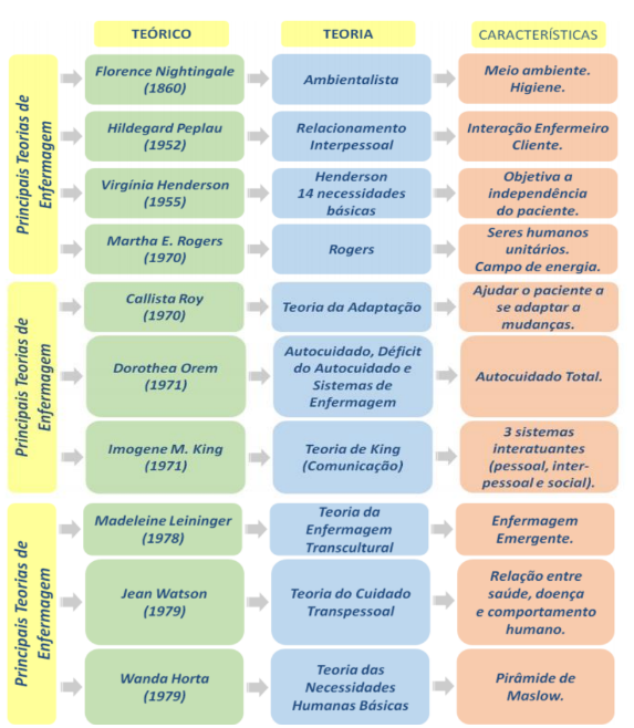 TEÓRICO TEORIA CARACTERÍSTICAS Florence Nightingale Meio ambiente. Ambientalista (1860) Higiene. de Hildegard Peplau Relacionamento Interação Enfermeiro (1952) Interpessoal Cliente. Henderson Objetiva a Henderson 14 necessidades independência (1955) básicas do paciente. Seres humanos Martha E. Rogers Rogers unitários. (1970) Campo de energia. Ajudar paciente a Callista Roy Teoria da Adaptação se adaptar a (1970) de mudanças. Autocuidado, Déficit Dorothea Orem do Autocuidado e Autocuidado Total. (1971) Sistemas de Enfermagem 3 sistemas Imogene M. King Teoria de King interatuantes (1971) (Comunicação) (pessoal, inter- pessoal e social). Teoria da Madeleine Leininger Enfermagem Enfermagem (1978) Emergente. de Transcultural Relação entre Jean Watson Teoria do Cuidado saúde, doença (1979) Transpessoal e comportamento humano. Teoria das Wanda Horta Pirâmide de Necessidades (1979) Maslow. Humanas Básicas