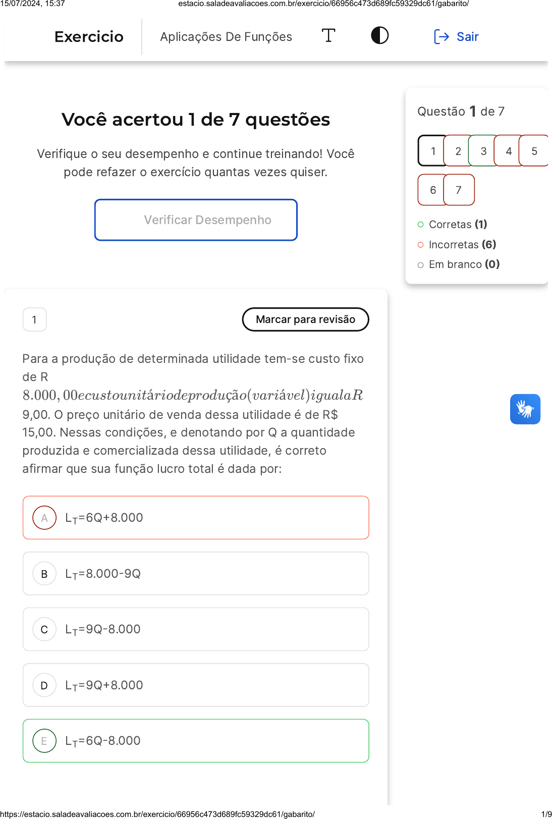 Você acertou 1 de 7 questões Verifique o seu desempenho e continue treinando! Você pode refazer o exercício quantas vezes quiser. Verificar Desempenho A B C D E 1 Marcar para revisão Para a produção de determinada utilidade tem-se custo fixo de R 9,00. O preço unitário de venda dessa utilidade é de R$ 15,00. Nessas condições, e denotando por Q a quantidade produzida e comercializada dessa utilidade, é correto afirmar que sua função lucro total é dada por: 8.000, 00ecustounitáriodeprodução(variável)igualaR L �6Q�8.000T L �8.000�9QT L �9Q�8.000T L �9Q�8.000T L �6Q�8.000T Questão 1 de 7 Corretas �1� Incorretas �6� Em branco �0� 1 2 3 4 5 6 7 Exercicio Aplicações De Funções Sair 15/07/2024, 15:37 estacio.saladeavaliacoes.com.br/exercicio/66956c473d689fc59329dc61/gabarito/ https://estacio.saladeavaliacoes.com.br/exercicio/66956c473d689fc59329dc61/gabarito/ 1/9 Resposta incorreta Opa! A alternativa correta é a letra E. Confira o gabarito comentado! Gabarito Comentado Para resolver essa questão, precisamos entender como calcular a função lucro total. Primeiramente, temos o custo fixo de R 9,00. Portanto, a função custo total é C �9Q�8.000. Em seguida, sabemos que o preço unitário de venda é de R$ 15,00, então a função receita total é R �15Q. A função lucro total é obtida subtraindo a função custo total da função receita total, ou seja, L �R �C . Substituindo as funções receita total e custo total na função lucro total, temos: L �15Q��9Q�8.000�. Simplificando a expressão, obtemos: L �6Q�8.000, que é a alternativa correta. 8.000, 00eocustounitáriodeprodução(variável)deR T T T T T T T 2 Marcar para revisão Em uma fábrica de caixas, o preço p por caixa de um determinado lote varia de acordo com a quantidade de pedidos em uma venda, pois é oferecido ao cliente um determinado desconto que é proporcional à quantidade q de caixas compradas. O preço unitário com desconto é então calculado de acordo com a função: p � 16.000 � 2q Um cliente solicitou à fábrica uma compra de 20.000 de caixas. Assumindo que o preço da unidade é dado pela função acima, a fábrica apresentará: 15/07/2024, 15:37 estacio.saladeavaliacoes.com.br/exercicio/66956c473d689fc59329dc61/gabarito/ https://estacio.saladeavaliacoes.com.br/exercicio/66956c473d689fc59329dc61/gabarito/ 2/9 A B C D E Uma receita positiva de R$ 480 milhões. Uma receita negativa de R$ 480 milhões. Uma receita nula. Uma receita positiva de R$ 24 milhões. Uma receita negativa de R$ 24 milhões. Resposta incorreta Opa! A alternativa correta é a letra B. Confira o gabarito comentado! Gabarito Comentado Para calcular a receita total em função da quantidade q, primeiramente, precisamos escrever a função preço: p � 16.000 � 2q (*) Substituindo essa expressão na função R � p ⋅ q (receita total) e aplicando a propriedade distributiva, obtemos: R(q) = (16.000�2q) ⋅ q R(q) � 16.000q � 2q (**) Para uma quantidade igual a 20.000 caixas, a receita é dada por: R�20.000� � 16.000 ∙ 20.000 � 2 ∙ �20.000� = �480.000.000,00 reais. Portanto, de acordo com essa função, para essa quantidade, a fábrica apresenta prejuízo na sua produção. Isso significa que a fábrica terá uma receita negativa de R$ 480 milhões, o que corresponde à alternativa B. 2 2 15/07/2024, 15:37 estacio.saladeavaliacoes.com.br/exercicio/66956c473d689fc59329dc61/gabarito/ https://estacio.saladeavaliacoes.com.br/exercicio/66956c473d689fc59329dc61/gabarito/ 3/9 A B C D E 3 Marcar para revisão O lucro referente à produção e venda de q unidades de certo produto é dado por L(q)=-4q �1.000q-12.000 reais, para q variando entre 0 e 80 unidades. Segundo tal função, qual é o valor máximo de lucro que pode ser obtido é: 2 R$ 52.000,00 R$ 52.625,00 R$50.775,00 R$ 50.000,00 R$ 50.500,00 Resposta correta Parabéns, você selecionou a alternativa correta. Confira o gabarito comentado! Gabarito Comentado Como o lucro é expresso por uma função quadrática com a � 0, ou seja, seu gráfico é uma parábola com concavidade voltada para baixo ( ), seu valor máximo é a coordenada y do vértice (y ). Portanto, o lucro máximo pode ser obtido da forma a seguir: y = = - �50.500reais. ⋂ v v −Δ 4a −(b2−4ac) 4a −[(1.000)2−4∙(−4)∙(−12.000)] 4∙(−4) 15/07/2024, 15:37 estacio.saladeavaliacoes.com.br/exercicio/66956c473d689fc59329dc61/gabarito/ https://estacio.saladeavaliacoes.com.br/exercicio/66956c473d689fc59329dc61/gabarito/ 4/9 A B C D E 4 Marcar para revisão O lucro L obtido com a comercialização de Q unidades de um modelo de ventilador fabricado pela empresa Vent-lar pode ser estimado pela função L�Q���0,002Q �9Q�4.950 com L em reais. O lucro máximo que pode ser obtido é 2 2.250 reais. 6.750 reais. 4.950 reais. 5.175 reais. 1.788 reais. Resposta incorreta Opa! A alternativa correta é a letra D. Confira o gabarito comentado! Gabarito Comentado Para encontrar o lucro máximo, precisamos encontrar o vértice da parábola representada pela função do lucro. O vértice de uma parábola dada pela equação quadrática ax² + bx + c é dado por x = -b/2a. Substituindo os valores, temos: x = �2.250 unidades. Este valor representa a quantidade de unidades que maximiza o lucro. Para encontrar o valor do lucro máximo, substituímos este valor na função L�Q�� v v − 9 2⋅(−0,002) 15/07/2024, 15:37 estacio.saladeavaliacoes.com.br/exercicio/66956c473d689fc59329dc61/gabarito/ https://estacio.saladeavaliacoes.com.br/exercicio/66956c473d689fc59329dc61/gabarito/ 5/9 A B C D E L�2.250���0,002�2.250� �9�2.250��4.950�5.175 reais Portanto, o lucro máximo que pode ser obtido é de 5.175 reais. 2 5 Marcar para revisão Nas operações comerciais e industriais, a gestão de custos, receitas e lucros desempenha um papel fundamental no planejamento e na tomada de decisões da