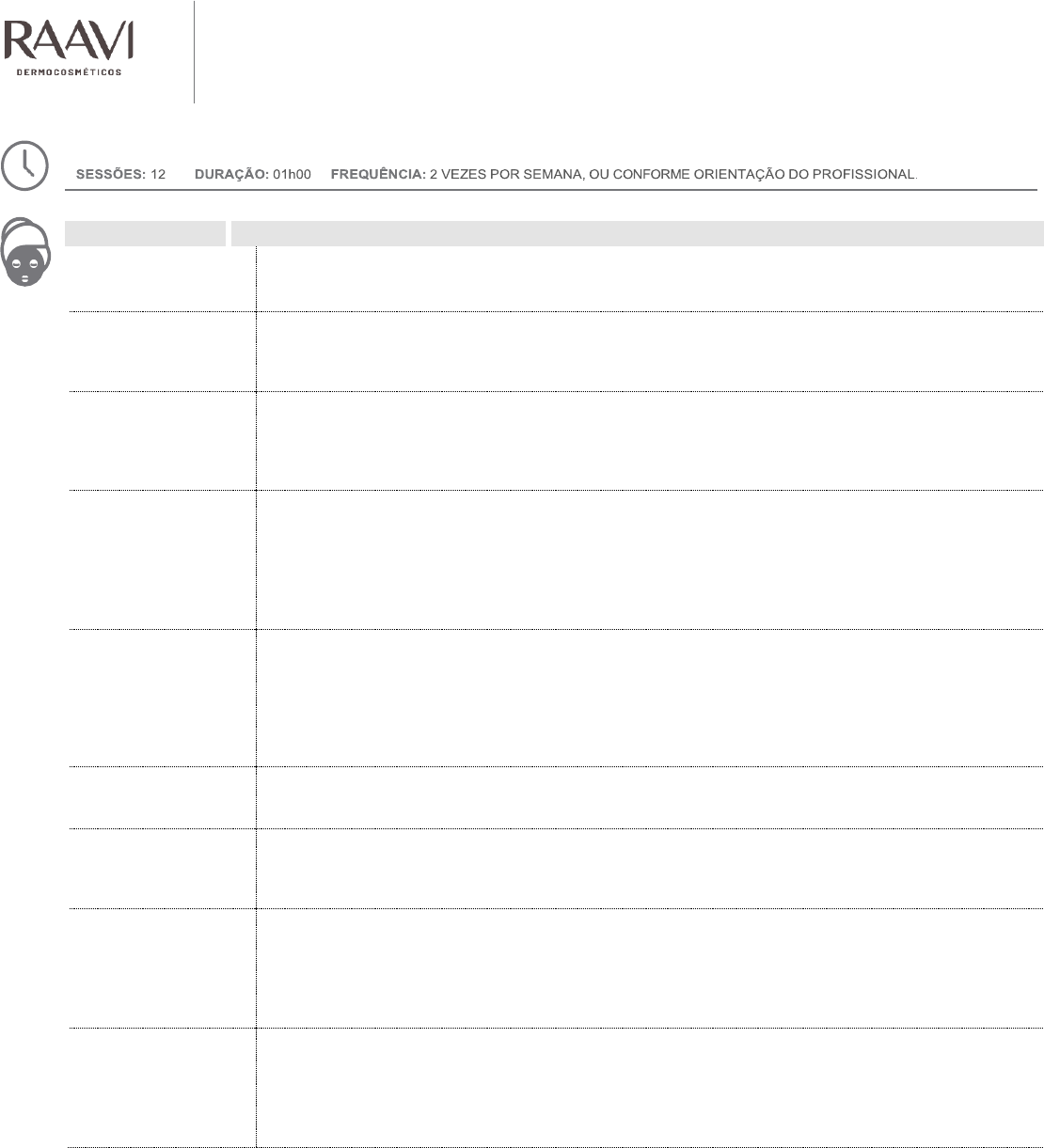 FACE LIFTING LIFTING FACIAL Revitalização e lifting de face, pescoço e colo através dos benefícios da massofilaxia facial e nano ativos. AVALIAR Realize a ficha de avaliação para registrar as informações necessárias e evolução do tratamento. ASSEPSIA Após lavar as mãos com sabão e água corrente, borrife a Loção Higienizante Natuativo em suas mãos e nas mãos do cliente, em seguida seque com o auxílio do lenço de papel, não é necessário enxaguar. HIGIENIZAR Aplique diretamente sobre a pele, pequena quantidade do Sabonete Suavizante Facial Clean Skin por toda a região da face, pescoço e colo. Espalhe o produto com os dedos umedecidos em água filtrada e massageie suavemente com movimentos circulares por todas as regiões a serem tratadas. Após o término limpe com o auxílio de algodão e gaze umedecidos em água filtrada. ELETROTERAPIA OPCIONAL Aplique a técnica de radiofrequência bipolar, ou criofrequência bipolar, ou microcorrentes, ou ultrassom microfocado, ou até mesmo alta-frequência com a técnica de faíscamento indireto.com o eletrodo saturador. Observação: Seguir as normas de aplicação e contraindicações orientado pelo fabricante do equipamento. ESFOLIAR Aplicar diretamente sobre a pele seca pequena quantidade do Creme Esfoliante Facial Clean Skin por toda a região da face, pescoço e colo, realize movimentos circulares, com leve pressão promovendo esfoliação física. Remova os resíduos com o auxílio de algodão e gaze umedecidos em água filtrada. Observação I: A esfoliação física poderá ser substituída pela técnica de peeling mecânico. TONIFICAR Borrife diretamente sobre a pele a Loção Tônica Adstringente Facial Clean Skin, após realize manobras de tamborilamento até a total permeação do produto. Não remover. MASSOFILAXIA Aplique pequena quantidade da Máscara Calmante Facial Clean Skin por toda a região a ser tratada, após aplique a técnica de Massofilaxia facial ou vacuoterpia/endermologia facial. Após, remova com o auxílio de algodão e gaze umedecidos em água filtrada. TRATAR Aplique pequena quantidade do Sérum Concentrado Facial Nano Retinol, por toda a região de face, pescoço e colo, realize movimentos de tamborilamento até sua total permeação. Não remover. Observação: Conheça a linha de séruns faciais da Raavi Dermocosméticos e personalize o seu tratamento de acordo com a necessidade de cada pele. FOTOPROTEÇÃO Aplique uma quantidade condizente do Hidratante Facial Multifuncional FPS 30 por toda a face, pescoço e colo. Não remover. Após o término orientar a utilização dos produtos Home Care e a importância da reaplicação do Hidratante Facial Multifuncional FPS 30, três vezes ao dia. ETAPA PROCEDIMENTO SABONETE LÍQUIDO REVITALIZANTE FACIAL Aplicar diretamente sobre a pele pequena quantidade do Sabonete Líquido Revitalizante Facial por toda a região da face, pescoço e colo. Espalhe o produto e massageie suavemente em movimentos circulares. Remova os resíduos lavando a face em água corrente, após o término secar bem a pele. ÁGUA TONIFICANTE REEQUILIBRANTE FACIAL Aplicar diretamente sobre a pele a Água Tonificante Reequilibrante Facial, após realize manobras de tamborilamento até a total permeação do produto. Não remover. SÉRUM PREENCHEDOR FACIAL ÁCIDO HIALURÔNICO Aplicar pequena quantidade do Sérum Preenchedor Facial Ácido Hialurônico, por toda a região a ser tratada até sua total permeação. Não remover. Observação: Conheça a linha de séruns faciais da Raavi Dermocosméticos e personalize a indicação do tratamento skincare de acordo com a necessidade de cada pele. HIDRATANTE FACIAL MULTIFUNCIONAL FPS 30 No período diurno é indispensável a aplicação de uma quantidade condizente do Hidratante Facial Multifuncional FPS 30 por toda a face, pescoço e colo. Não remover. OBS: reaplicar o Hidratante Facial Multifuncional FPS 30, três vezes ao dia. SABONETE LÍQUIDO REVITALIZANTE FACIAL Aplicar diretamente sobre a pele pequena quantidade do Sabonete Líquido Revitalizante Facial por toda a região da face, pescoço e colo. Espalhe o produto e massageie suavemente em movimentos circulares. Remova os resíduos lavando a face em água corrente, após o término secar bem a pele. ÁGUA TONIFICANTE REEQUILIBRANTE FACIAL Aplicar diretamente sobre a pele a Água Tonificante Reequilibrante Facial, após realize manobras de tamborilamento até a total permeação do produto. Não remover. SÉRUM CONCENTRADO FACIAL NANO RETINOL Aplicar pequena quantidade do Sérum Concentrado Facial Nano Retinol, por toda a região a ser tratada até sua total permeação. Não remover. Observação: Conheça a linha de séruns faciais da Raavi Dermocosméticos e personalize a indicação do tratamento skincare de acordo com a necessidade de cada pele. INDICAÇÃO HOME CARE USO NOTURNO PELE SECA E DESVITALIZADA USO DIURNO PELE SECA E DESVITALIZADA LOÇÃO HIGIENIZANTE NATUATIVO Extrato de Calêndula e Hortelã Pimenta. SABONETE LÍQUIDO FACIAL CLEAN SKIN Prebiótico e Extrato de Camomila. CREME ESFOLIANTE FACIAL CLEAN SKIN Prebiótico e Extrato de Camomila. LOÇÃO TÔNICA ADSTRINGENTE FACIAL CLEAN SKIN Prebiótico, Extrato de Camomila e Zinco PCA. MÁSCARA CALMANTE FACIAL CLEAN SKIN Prebiótico, Extrato de Camomila, D-Pantenol e Calmaline. SÉRUM CONCENTRADO FACIAL NANO RETINOL Nano Retinol. HIDRATANTE FACIAL MULTIFUNCIONAL FPS 30 Pantenol e Vitamina E.