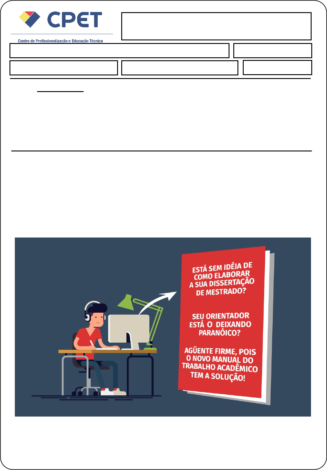 Atividade Prática A acentuação gráfica serve para nos ajudar a identificar a sílaba tônica das palavras, assim como para evitar ambiguidades e permitir uma maior fluidez na leitura do texto, auxiliando na sua compreensão. A ausência ou o uso inadequado da acentuação pode dificultar o entendimento do conteúdo do texto e o ritmo de leitura. Suponha que você é consultor de português em uma editora de livros didáticos. Uma das profissionais com as quais você trabalha está com dúvidas acerca da acentuação em um trecho que vai para uma campanha publicitária de uma obra que será lançada: De que maneira você corrigiria a acentuação gráfica nesse trecho utilizando as regras do Novo Acordo Ortográfico? Reescreva o trecho e justifique a sua resposta. Desenvolvimento e Interpretação de textos Aluno (a): Marcus Vinicius Barbosa de Oliveira Data: 15/03/2024 Atividade Prática I NOTA: INSTRUÇÕES: Esta Avaliação contém 1 (uma) questão, totalizando 10 (dez) pontos. Você deve preencher dos dados no Cabeçalho para sua identificação o Nome / Data de entrega As respostas devem ser digitadas abaixo de cada pergunta. Ao terminar, grave o arquivo com o nome Avaliação Pesquisa/Prática. Envio o arquivo pelo sistema. Atividade Prática Para corrigir a acentuação gráfica nesse trecho utilizando as regras do Novo Acordo Ortográfico, precisamos verificar se as palavras estão de acordo com as novas normas de acentuação. No Novo Acordo Ortográfico, muitas palavras perderam o acento gráfico em determinadas situações. Vou reescrever o trecho corrigido: "Está sem ideia de como elaborar a sua dissertação de mestrado? Seu orientador está o deixando paranoico? Aguenta firme, pois o novo manual do trabalho acadêmico tem a solução!" Ajustei a acentuação conforme as novas regras do Acordo Ortográfico da Língua Portuguesa: 1."ideia": Perdeu o acento agudo no "i", já que é uma palavra paroxítona terminada em "e". 2."paranoico": Perdeu o acento agudo no "i", pois é uma palavra paroxítona terminada em ditongo crescente. 3."aguente": Perdeu o trema no "u" , deixou de existir.
