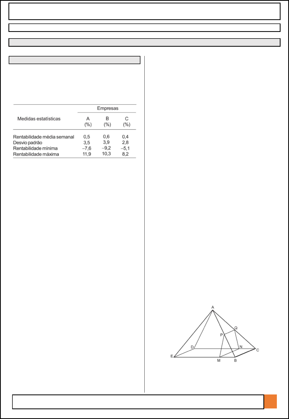 Curso Preparatório – Professor Frydman PROFESSORFRYDMAN.COM.BR 1 PETROBRAS - Engenheiro de Petróleo (2022) MATEMÁTICA – ENSINO MÉDIO CESGRANRIO 2008 a 2018 1. CESGRANRIO (2008) Estatística A tabela a seguir apresenta algumas estatísticas das ações de três empresas dos setores de petróleo e química. Os dados referem-se às últimas 80 semanas. Considere as afirmações derivadas das estatísticas acima. I - O coeficiente de variação das ações da empresa A é o mesmo que o das ações da empresa C. II - A rentabilidade média das ações da empresa B é maior do que das demais e apresenta menor dispersão relativa, ou seja, menor risco. III - A rentabilidade média das ações da empresa C é menor do que das demais e apresenta menor dispersão relativa, ou seja, menor risco. Estão corretas as afirmações (A) I, apenas. (B) I e II, apenas. (C) I e III, apenas. (D) II e III, apenas. (E) I, II e III. 2. CESGRANRIO (2008) Conjuntos Uma pesquisa foi feita com alguns moradores de uma cidade brasileira sobre a confiança em três redes de postos de gasolina (A, B e C) e gerou as seguintes informações: • 400 pessoas confiam na rede A, das quais 150 confiam somente na rede A; • 400 pessoas confiam na rede B, mas 450, não; • 430 pessoas não confiam na rede C; • 500 pessoas confiam em apenas uma das três redes; • 300 pessoas confiam em exatamente duas das três redes, das quais 110 não confiam na rede B; • 40 pessoas confiam nas três redes. Com base nestas informações, analise as afirmativas a seguir. I - Foram entrevistadas 850 pessoas e a quantidade de pessoas que não confiam na rede A é maior do que a quantidade de pessoas que confiam. II - A quantidade de pessoas que confia na rede C é maior do que a quantidade de pessoas que confia na rede B que é maior do que a quantidade de pessoas que confia na rede A. III - Apenas 20 pessoas não confiam em nenhuma das três redes ou 150 pessoas confiam simultaneamente nas redes A e C. IV - A quantidade de pessoas que confia exclusivamente na rede A é igual à quantidade de pessoas que confia exclusivamente na rede B. É(São) correta(s) APENAS a(s) afirmativa(s) (A) I (B) I e II (C) I e III (D) II e III (E) II e IV 3. CESGRANRIO (2008) Função Considere que f é uma função definida do conjunto D em IR por f(x) = x2 - 4x + 8. Sendo Im a imagem de f, é correto afirmar que, se (A) D = [-2;0] então Im(f) = IR+ (B) D = [2; ꝏ[ então Im(f) = [0 ; 4] (C) D = [2; ꝏ[ então Im(f) = IR+ (D) D = [0; 2] então Im(f) = [0 ; 8] (E) D = [0; 2] então Im(f) = [4 ; 8] 4. CESGRANRIO (2008) Geometria Espacial Uma pirâmide reta de base quadrada tem todas as suas arestas iguais a k. Um plano α, perpendicular à base BCDE, corta as arestas laterais AB e AC em Curso Preparatório – Professor Frydman PROFESSORFRYDMAN.COM.BR 2 seus respectivos pontos médios, P e Q. Determine o volume do sólido BMPQNC. (A) 5𝑘3√2 192 (B) 5𝑘3√2 96 (C) 𝑘3√2 24 (D) 𝑘3√2 96 (E) 𝑘3√2 192 5. CESGRANRIO (2008) Trigonometria O conjunto de valores para x que resolvem 2cos2x = 1 - senx é: (A) {𝑥 𝜖 ℝ/𝑥 = 𝜋 2 + 2𝑘𝜋 𝑜𝑢 𝑥 = − 𝜋 6 + 2𝑘𝜋} (B) {𝑥 𝜖 ℝ/𝑥 = 𝜋 2 + 2𝑘𝜋 𝑜𝑢 𝑥 = − 𝜋 6 + 2𝑘𝜋 𝑜𝑢 𝑥 = 7𝜋 6 + 2𝑘𝜋} (C) {𝑥𝜖ℝ/𝑥 = − 𝜋 6 + 2𝑘𝜋 𝑜𝑢 𝑥 = 7𝜋 6 + 2𝑘𝜋} (D) {𝑥𝜖ℝ/𝑥 = − 𝜋 6 + 𝑘𝜋 𝑜𝑢 𝑥 = 7𝜋 6 + 𝑘𝜋} (E) {𝑥𝜖ℝ/𝑥 = 𝜋 2 + 2𝑘𝜋} 6. CESGRANRIO (2008) Matrizes Resolvendo o sistema AX=B, onde temos que b2 - 4ac é igual a (A) - 1 (B) 0 (C) 1 (D) 2 (E) 3 7. CESGRANRIO (2008) P.A. A soma dos n primeiros termos da progressão aritmética (4,7,10,13...) é 1.425. É correto afirmar que n é (A) primo. (B) múltiplo de 4. (C) múltiplo de 6. (D) múltiplo de 7. (E) múltiplo de 8. 8. CESGRANRIO (2008) Análise Combinatória Em um supermercado são vendidas 5 marcas diferentes de refrigerante. Uma pessoa que deseje comprar 3 latas de refrigerante, sem que haja preferência por uma determinada marca, pode escolhê-las de N formas. O valor de N é (A) 3 (B) 10 (C) 15 (D) 35 (E) 125 9. CESGRANRIO (2008) Geometria Espacial Uma reta perpendicular a uma das faces de um diedro forma um ângulo de 40º com o semiplano bissetor. Assim, é correto afirmar que a medida do diedro é (A) 20º (B) 40º (C) 80º (D) 100º (E) 120º 10. CESGRANRIO (2008) Geometria Analítica Qual região geométrica é definida pela expressão ? (A) Ponto (B) Parábola (C) Hipérbole (D) Elipse (E) Circunferência 11. CESGRANRIO (2008) Financeira Um investimento de R$1.000,00 foi feito sob taxa de juros compostos de 3% ao mês. Após um período t, em meses, o montante foi de R$1.159,27. Qual o valor de t? (Dados: ln(1.000) = 6,91; ln(1.159,27) = 7,06 ; ln(1,03) = 0,03). (A) 5 (B) 7 (C) 10 (D) 12 (E) 15 12. CESGRANRIO (2008) Financeira João tomou um empréstimo de R$150,00 junto a uma financeira, e se comprometeu a quitá-lo em dois meses, pelo valor de R$200,00, o que inclui uma taxa de abertura de crédito no valor de R$18,50 mais os juros (compostos). No momento do vencimento da dívida, João negociou um novo empréstimo no valor de R$200,00 que pudesse ser pago dois meses depois – uma prorrogação do prazo. A financeira aceitou, mas acordou uma taxa de juros igual ao dobro da inicial. Sabendo que a taxa de abertura de crédito só incidiu sobre o empréstimo inicial, quanto João deverá pagar, no fim do segundo empréstimo, em reais? (A) 216,00 (B) 218,50 Curso Preparatório – Professor Frydman PROFESSORFRYDMAN.COM.BR 3 (C) 220,00 (D) 242,00 (E) 288,00 13. CESGRANRIO (2008) Logaritmos A escala proposta por Charles Francis Richter (1900 – 1985) para medir a magnitude de terremotos é definida por M = log10A + 3.log10(8.∆t) – 2,92, em que: - M é a magnitude do terremoto na Escala Richter; - A é a amplitude máxima registrada no papel do sismógrafo, em milímetros; - ∆t é o t