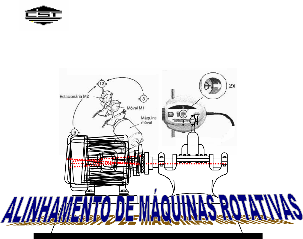 COMPANHIA SIDERÚRGICA DE TUBARÃO IDU – DEPARTAMENTO DE MANUTENÇÃO MECÂNICA IUN – DIVISÃO DE ENGENHARIA MECÂNICA ELABORAÇÃO: JORGE DE CARVALHO PIRES REVISÃO – 5 Set. / 2004 IUN - DIVISÃO DE ENGENHARIA MECÂNICA ALINHAMENTO DE MÁQUINAS ROTATIVAS Jorge Pires –27 3348-2218 e-mail: jpires@cst.com.br G:\ENGENHARIA\Preditiva\Documentos_Diversos\Jorge\diversos\TREINAM\alinhamento\apost ali_copleta.doc 2 APRESENTAÇÃO: Este curso é dirigido a todos os profissionais envolvidos em montagem, manutenção, inspeção e fiscalização de serviços em máquinas rotativas de modo geral, e tem como objetivo a apresentação das principais técnicas para correção de desalinhamento através de métodos aritméticos, gráficos, escolha do instrumental mais adequado, critérios para se ter um alinhamento de qualidade e apresentação dos problemas causados por desalinhamento. O desalinhamento entre máquinas rotativas é considerado uma das principais causas de avarias prematuras de rolamentos e/ou quebras de máquinas. Também na CST através da Manutenção Preditiva (Análises de vibrações) pôde comprovar este fato. Devido o desalinhamento na maioria das vezes não causar problemas de imediato nas máquinas, muitas avarias atribuídas a componentes da mesma, na realidade são conseqüência de um desalinhamento, porém na maior parte das vezes fica difícil comprovar este fato com a máquina já avariada. Cada vez mais as empresas vêm se preocupando com este fato e têm procurado treinar e reciclar o pessoal envolvido, adquirindo equipamentos mais sofisticados com o objetivo de trazer maior confiabilidade, precisão e melhorar a qualidade do alinhamento. Quando não é dada a devida importância ao alinhamento das máquinas todo o cuidado tido durante a montagem ou manutenção de um equipamento pode estar seriamente comprometido, com a quebra ou avaria prematura dos componentes. Hoje, para atingir a qualidade total na manutenção, é imprescindível que se tenha um alinhamento de boa qualidade, e neste curso será mostrado que se forem seguidos alguns procedimentos básicos será fácil alcançar este objetivo. A importância do alinhamento para a saúde das máquinas. Os equipamentos rotativos normalmente são conectados por acoplamentos flexíveis que têm a função de absorver possíveis desalinhamentos provocados durante a operação das máquinas. Todos acoplamentos possuem limites de desalinhamento dentro dos quais eles operam sem falhar ou provocar folgas indesejáveis, mas mesmo quando operam dentro destes limites estes acoplamentos oferecem uma resistência a flexão que normalmente aumentam proporcionalmente ao desalinhamento e influenciando, desta forma, a flutuação de carga no mancal com a rotação do eixo, ou seja, mesmo que a acoplamento absorva o desalinhamento o mesmo pode causar danos a máquina, dependendo da rotação e da quantidade de desalinhamento. Principais problemas que podem ser ocasionados por desalinhamento: - vibrações excessivas - desgaste anormal em mancais de deslizamento. - avaria ou desgaste prematuro de rolamentos - avaria de selos mecânicos e labirintos - desgaste prematuro ou quebra de acoplamentos ou eixos - desgaste anormal de engrenagens. IUN - DIVISÃO DE ENGENHARIA MECÂNICA ALINHAMENTO DE MÁQUINAS ROTATIVAS Jorge Pires –27 3348-2218 e-mail: jpires@cst.com.br G:\ENGENHARIA\Preditiva\Documentos_Diversos\Jorge\diversos\TREINAM\alinhamento\apost ali_copleta.doc 3 ÍNDICE 1. FORMAS DE APRESENTAÇÃO DO ALINHAMENTO / DESALINHAMENTO ................................... 4 1.1. ALINHAMENTO COLINEAR...........................................................................................................4 1.2. DESALINHAMENTO PARALELO OU RADIAL............................................................................ 4 1.3. DESALINHAMENTO ANGULAR OU FACIAL ( AXIAL )........................................................... 4 1.4. DESALINHAMENTO COMBINADO - RADIAL E ANGULAR..................................................... 5 1.5. AFASTAMENTO AXIAL OU "GAP" ............................................................................................... 5 2. FERRAMENTAS E DISPOSITIVOS............................................................................................................ 6 3. FATORES QUE PODEM DIFICULTAR OU INSERIR ERRO NO ALINHAMENTO. ............................. 8 5.1. PÉ MANCO ........................................................................................................................................ 8 5.2. FLEXIBILIDADE DO CONJUNTO DE LEITURA. ......................................................................... 9 4. REVISÃO MATEMÁTICA........................................................................................................................ 11 4.1. REGRA DE TRÊS SIMPLES ........................................................................................................... 11 4.2. SEMELHANÇA DE TRIÂNGULO ................................................................................................. 11 4.3. OPERAÇÕES COM SINAIS............................................................................................................ 12 5. MÉTODOS E EXECUÇÃO DO ALINHAMENTO.................................................................................... 13 5.1. MÉTODO RADIAL E FACE ........................................................................................................... 13 5.2. ALINHAMENTO PELO MÉTODO DE LEITURAS REVERSAS. ................................................ 20 5.3. ALINHAMENTO PELO MÉTODO FACE A FACE....................................................................... 25 5.4. ALINHAMENTO COM INSTRUMENTOS A LASER. ................................................................. 29 6. TOLERÂNCIAS NO ALINHAMENTO ..................................................................................................... 30 7. ALINHAMENT