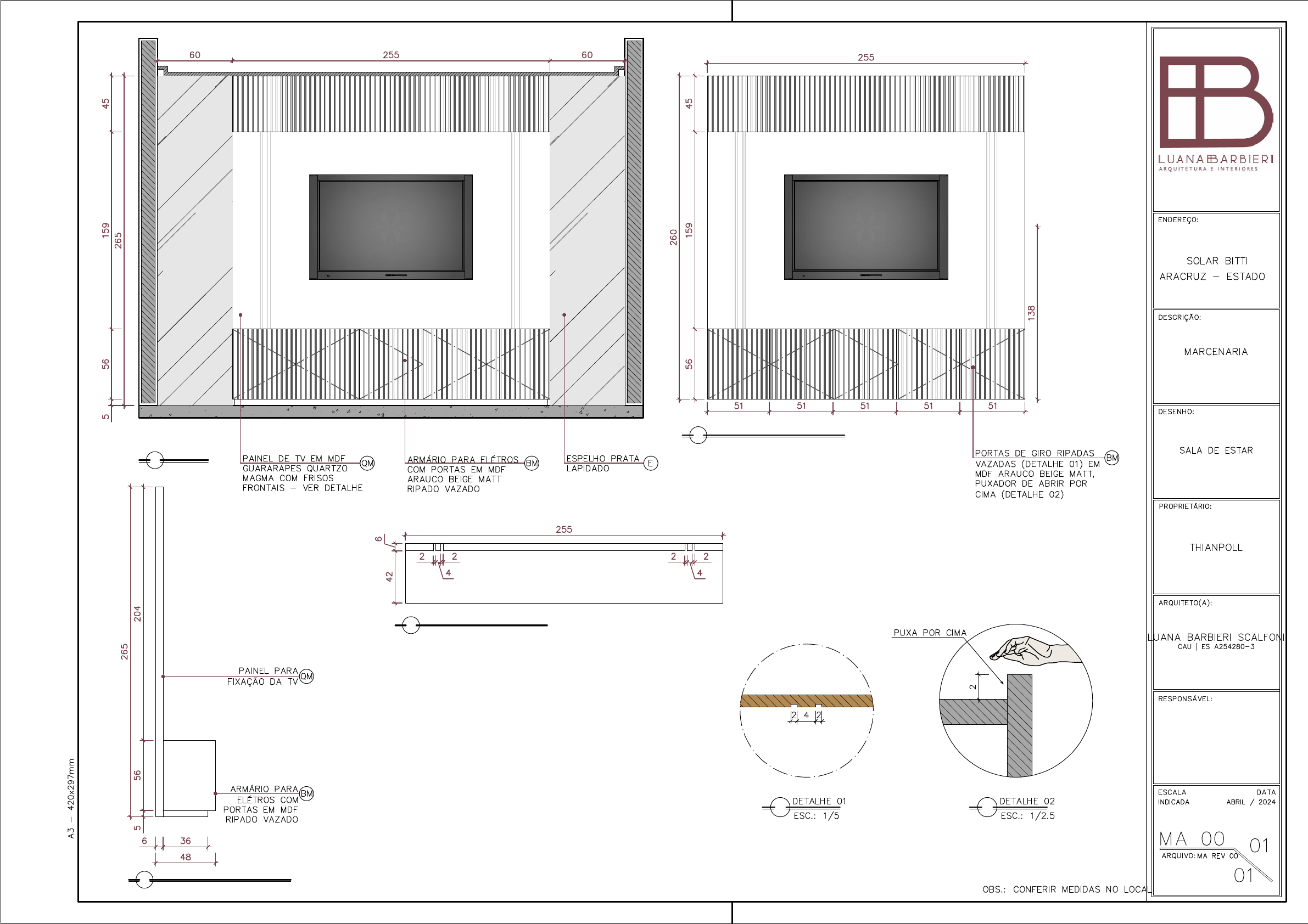 VISTA 01 ESC.: 1/25 VISTA FRONTAL PAINEL DE TV ESC.: 1/25 VISTA LATERAL PAINEL DE TV ESC.: 1/25 PLANTA BAIXA PAINEL DE TV ESC.: 1/10 AutoCAD SHX Text OBS.: CONFERIR MEDIDAS NO LOCAL AutoCAD SHX Text A3 - 420x297mm AutoCAD SHX Text PROPRIETÁRIO: AutoCAD SHX Text ESCALA AutoCAD SHX Text INDICADA AutoCAD SHX Text DATA AutoCAD SHX Text ARQUITETO(A): AutoCAD SHX Text DESCRIÇÃO: AutoCAD SHX Text ENDEREÇO: AutoCAD SHX Text DESENHO: AutoCAD SHX Text RESPONSÁVEL: AutoCAD SHX Text ARQUIVO: AutoCAD SHX Text ARACRUZ - ESTADO AutoCAD SHX Text SOLAR BITTI AutoCAD SHX Text MARCENARIA AutoCAD SHX Text SALA DE ESTAR AutoCAD SHX Text THIANPOLL AutoCAD SHX Text CAU | ES A254280-3 AutoCAD SHX Text LUANA BARBIERI SCALFONI AutoCAD SHX Text MA 00 AutoCAD SHX Text MA REV 00 AutoCAD SHX Text 01 AutoCAD SHX Text 01 AutoCAD SHX Text ABRIL / 2024 AutoCAD SHX Text ARMÁRIO PARA ELÉTROS COM PORTAS EM MDF ARAUCO BEIGE MATT RIPADO VAZADO AutoCAD SHX Text BM AutoCAD SHX Text PAINEL DE TV EM MDF GUARARAPES QUARTZO MAGMA COM FRISOS FRONTAIS - VER DETALHE AutoCAD SHX Text QM AutoCAD SHX Text ESPELHO PRATA LAPIDADO AutoCAD SHX Text E AutoCAD SHX Text PORTAS DE GIRO RIPADAS VAZADAS (DETALHE 01) EM MDF ARAUCO BEIGE MATT, PUXADOR DE ABRIR POR CIMA (DETALHE 02) AutoCAD SHX Text BM AutoCAD SHX Text ARMÁRIO PARA ELÉTROS COM PORTAS EM MDF RIPADO VAZADO AutoCAD SHX Text BM AutoCAD SHX Text PAINEL PARA FIXAÇÃO DA TV AutoCAD SHX Text QM AutoCAD SHX Text DETALHE 02 AutoCAD SHX Text ESC.: 1/2.5 AutoCAD SHX Text PUXA POR CIMA AutoCAD SHX Text DETALHE 01 AutoCAD SHX Text ESC.: 1/5 Sheets and Views Model
