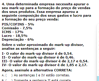 4. Uma determinada empresa necessita apurar o seu mark-up para a formação do preço de vendas dos seus produtos. Essa empresa apurou a seguinte composição dos seus gastos e lucro para a formação do seu preço venda: PIS/COFINS - 5% Comissão - 7,5% ICMS - 17% Lucro - 18,5% Depreciação - 6% Sobre valor aproximado do mark-up divisor, analise as sentenças a seguir: I- valor do mark-up divisor é de 0,54. II- o valor do mark-up divisor é de 0,46. III- o valor do mark-up divisor é de 2,17 e 0,54. IV- o valor do mark-up divisor é de 1,85 e 2,17. Agora, assinale a alternativa CORRETA: A. ( ) As sentenças I e IV estão corretas. B Somente a sentenca II está correta