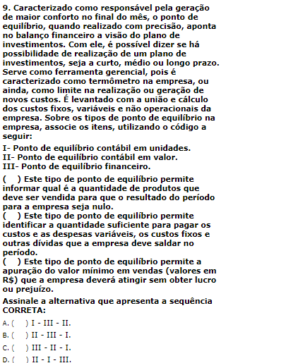 9. Caracterizado como responsável pela geração de maior conforto no final do mês, o ponto de equilíbrio, quando realizado com precisão, aponta no balanço financeiro a visão do plano de investimentos. Com ele, é possível dizer se há possibilidade de realização de um plano de investimentos, seja a curto, médio ou longo prazo. Serve como ferramenta gerencial, pois é caracterizado como termômetro na empresa, ou ainda, como limite na realização ou geração de novos custos. É levantado com a união e cálculo dos custos fixos, variáveis e não operacionais da empresa. Sobre os tipos de ponto de equilíbrio na empresa, associe os itens, utilizando o código a seguir: I- Ponto de equilíbrio contábil em unidades. II- Ponto de equilíbrio contábil em valor. III- Ponto de equilíbrio financeiro. ( ) Este tipo de ponto de equilíbrio permite informar qual é a quantidade de produtos que deve ser vendida para que resultado do período para a empresa seja nulo. ( ) Este tipo de ponto de equilíbrio permite identificar a quantidade suficiente para pagar os custos e as despesas variáveis, os custos fixos e outras dívidas que a empresa deve saldar no ( ) Este tipo de ponto de equilíbrio permite a apuração do valor mínimo em vendas (valores em R$) que a empresa deverá atingir sem obter lucro ou Assinale a alternativa que apresenta a sequência CORRETA: A. ( ) I III - II. B. ( ) II III - I. ( ) III II - I. D. ( ) II I - III.