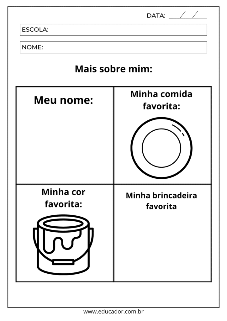 DATA: / / ESCOLA: NOME: Mais sobre mim: Minha comida Meu nome: favorita: Minha cor Minha brincadeira favorita: favorita www.educador.com.br
