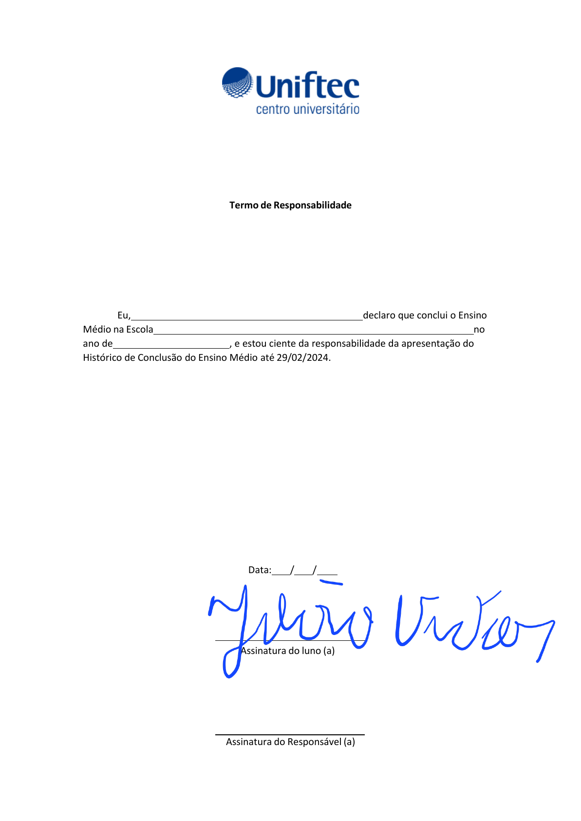 Termo de Responsabilidade Eu, declaro que conclui o Ensino Médio na Escola no ano de , e estou ciente da responsabilidade da apresentação do Histórico de Conclusão do Ensino Médio até 29/02/2024. Data: / / Assinatura do Responsável (a) Assinatura do luno (a)