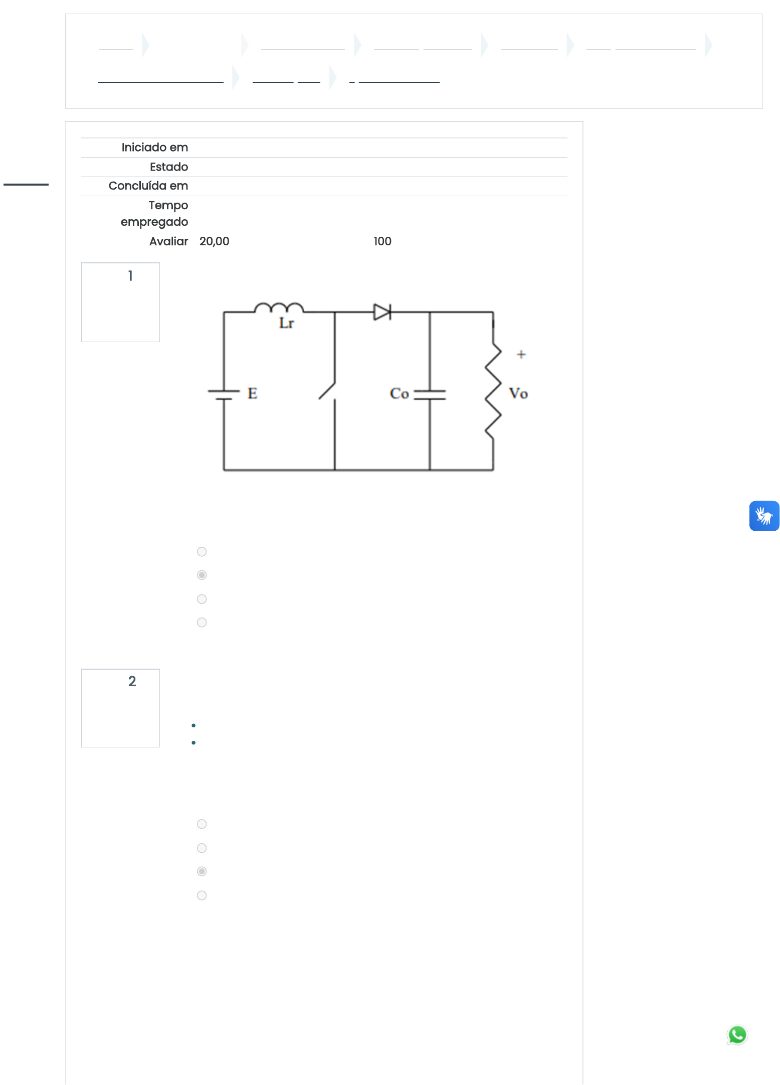 Painel Meus cursos CURSOS FUNEC Graduação - EAD Aluno EAD JUNÇÕES DE TURMA Eletrônica de Potência AVALIAÇÕES QUESTIONÁRIO 2 Questão 1 Completo Atingiu 2,00 de 2,00 Questão 2 Completo Atingiu 2,00 de 2,00 Iniciado em Thursday, 22 Feb 2024, 15:14 Estado Finalizada Concluída em Thursday, 22 Feb 2024, 15:19 Tempo empregado 5 minutos 1 segundo Avaliar 20,00 de um máximo de 20,00(100%) Analise o circuito mostrado na figura: O circuito é: Escolha uma opção: a. Um conversor Buck ZVS b. Um conversor semi - ressonante Boost c. Um conversor semi -ressonante Buck d. Um conversor pseudo - ressonante Um conversor ponte completa PWM senoidal que operada segundo os parâmetros: razão cíclica de 90%; tensão de entrada de 300 V. Para essa configuração a tensão eficaz de saída será: Escolha uma opção: a. V = 120 V b. V = 180 V c. V = 191 V d. V = 270 V out out out out https://ava.funec.br/my/ https://ava.funec.br/course/index.php?categoryid=10 https://ava.funec.br/course/index.php?categoryid=17 https://ava.funec.br/course/index.php?categoryid=19 https://ava.funec.br/course/index.php?categoryid=77 https://ava.funec.br/course/view.php?id=1711 https://ava.funec.br/course/view.php?id=1711#section-6 https://ava.funec.br/mod/quiz/view.php?id=27117 javascript:void(0); https://ava.funec.br/user/index.php?id=1711 https://ava.funec.br/badges/view.php?type=2&id=1711 https://ava.funec.br/admin/tool/lp/coursecompetencies.php?courseid=1711 https://ava.funec.br/grade/report/index.php?id=1711 https://ava.funec.br/my/ https://ava.funec.br/?redirect=0 https://ava.funec.br/calendar/view.php?view=month&course=1711 javascript:void(0); https://ava.funec.br/user/files.php https://ava.funec.br/course/view.php?id=2011 https://ava.funec.br/course/view.php?id=2012 https://ava.funec.br/course/view.php?id=757 https://ava.funec.br/course/view.php?id=1328 https://ava.funec.br/course/view.php?id=957 https://ava.funec.br/course/view.php?id=1711 https://ava.funec.br/course/view.php?id=692 https://ava.funec.br/course/view.php?id=1263 https://ava.funec.br/course/view.php?id=1609 https://ava.funec.br/course/view.php?id=1261 https://ava.funec.br/my/ Questão 3 Completo Atingiu 2,00 de 2,00 Questão 4 Completo Atingiu 2,00 de 2,00 Questão 5 Completo Atingiu 2,00 de 2,00 Considere um conversor meia ponte PWM senoidal está operando com uma razão cíclica de 90% e tensão de entrada de 120V em cada fonte de alimentação. Para esse conversor a tensão de pico será: Escolha uma opção: a. V = 104 V b. V = 120 V c. V = 96 V d. V = 90 V P P P P Considere um conversor Buck quase-ressonante, ZCS como apresentado na figura. Considere: E = V = 12V; C = 0,1μF; L = 10μH; I = 1A e f = 100kHz. Se a corrente de comutação do circuito for zero, a tensão de saída do circuito será: Escolha uma opção: a. V = 12,4 V b. V = 10,55 V c. V = 9,72 V d. V = 7,69 V s r r 0 s out out out out Um conversor ponte completa PWM senoidal que operada segundo os parâmetros: razão cíclica de 80%; tensão de entrada de 400 V. Para essa configuração a tensão eficaz de saída será: Escolha uma opção: a. V = 180 V b. V = 191 V c. V =226,3 V d. V = 270 V out out out out javascript:void(0); https://ava.funec.br/user/index.php?id=1711 https://ava.funec.br/badges/view.php?type=2&id=1711 https://ava.funec.br/admin/tool/lp/coursecompetencies.php?courseid=1711 https://ava.funec.br/grade/report/index.php?id=1711 https://ava.funec.br/my/ https://ava.funec.br/?redirect=0 https://ava.funec.br/calendar/view.php?view=month&course=1711 javascript:void(0); https://ava.funec.br/user/files.php https://ava.funec.br/course/view.php?id=2011 https://ava.funec.br/course/view.php?id=2012 https://ava.funec.br/course/view.php?id=757 https://ava.funec.br/course/view.php?id=1328 https://ava.funec.br/course/view.php?id=957 https://ava.funec.br/course/view.php?id=1711 https://ava.funec.br/course/view.php?id=692 https://ava.funec.br/course/view.php?id=1263 https://ava.funec.br/course/view.php?id=1609 https://ava.funec.br/course/view.php?id=1261 https://ava.funec.br/my/ Questão 6 Completo Atingiu 2,00 de 2,00 Questão 7 Completo Atingiu 2,00 de 2,00 Questão 8 Completo Atingiu 2,00 de 2,00 Questão 9 Completo Atingiu 2,00 de 2,00 Considere um conversor de meia ponte onda quadrada que está operando à uma razão cíclica de 30%, quando uma tensão de entra de 10V está sendo aplicada por cada fonte de alimentação. Nesse caso a tensão de saída será: Escolha uma opção: a. V = - 4 V b. V = 4 V c. V = 8 V d. V = 0 V out out out out Considere um conversor meia ponte PWM senoidal está operando com uma razão cíclica de 80% e tensão de entrada de 150V em cada fonte de alimentação. Para esse conversor a tensão de pico será: Escolha uma opção: a. V = 45 V b. V = 180 V c. V = 120 V d. V = 90 V P P P P Um conversor ponte completa PWM senoidal está sendo alimentado por uma tensão de entrada de 400V. Se a razão cíclica desse conversor for de 70%, a tensão de pico na saída será: Escolha uma opção: a. V = 200 V b. V = 320 V c. V = 198 V d. V = 280 V P P P P Um conversor ponte completa PWM senoidal está sendo alimentado por uma tensão de entrada de 400V. Se a razão cíclica desse conversor for de 90%, a tensão eficaz na saída será: Escolha uma opção: a. V = 254,6 V b. V = 200 V c. V = 320 V d. V = 360 V javascript:void(0); https://ava.funec.br/user/index.php?id=1711 https://ava.funec.br/badges/view.php?type=2&id=1711 https://ava.funec.br/admin/tool/lp/coursecompetencies.php?courseid=1711 https://ava.funec.br/grade/report/index.php?id=1711 https://ava.funec.br/my/ https://ava.funec.br/?redirect=0 https://ava.funec.br/calendar/view.php?view=month&course=1711 javascript:void(0); https://ava.funec.br/user/files.php https://ava.funec.br/course/view.php?id=2011 https://ava.funec.br/course/view.php?id=2012 https://ava.funec.br/course/view.php?id=757 https://ava.funec.br/course/view.php?id=1328 https://ava.funec.br/course/view.php?id=957 https://ava.funec.br