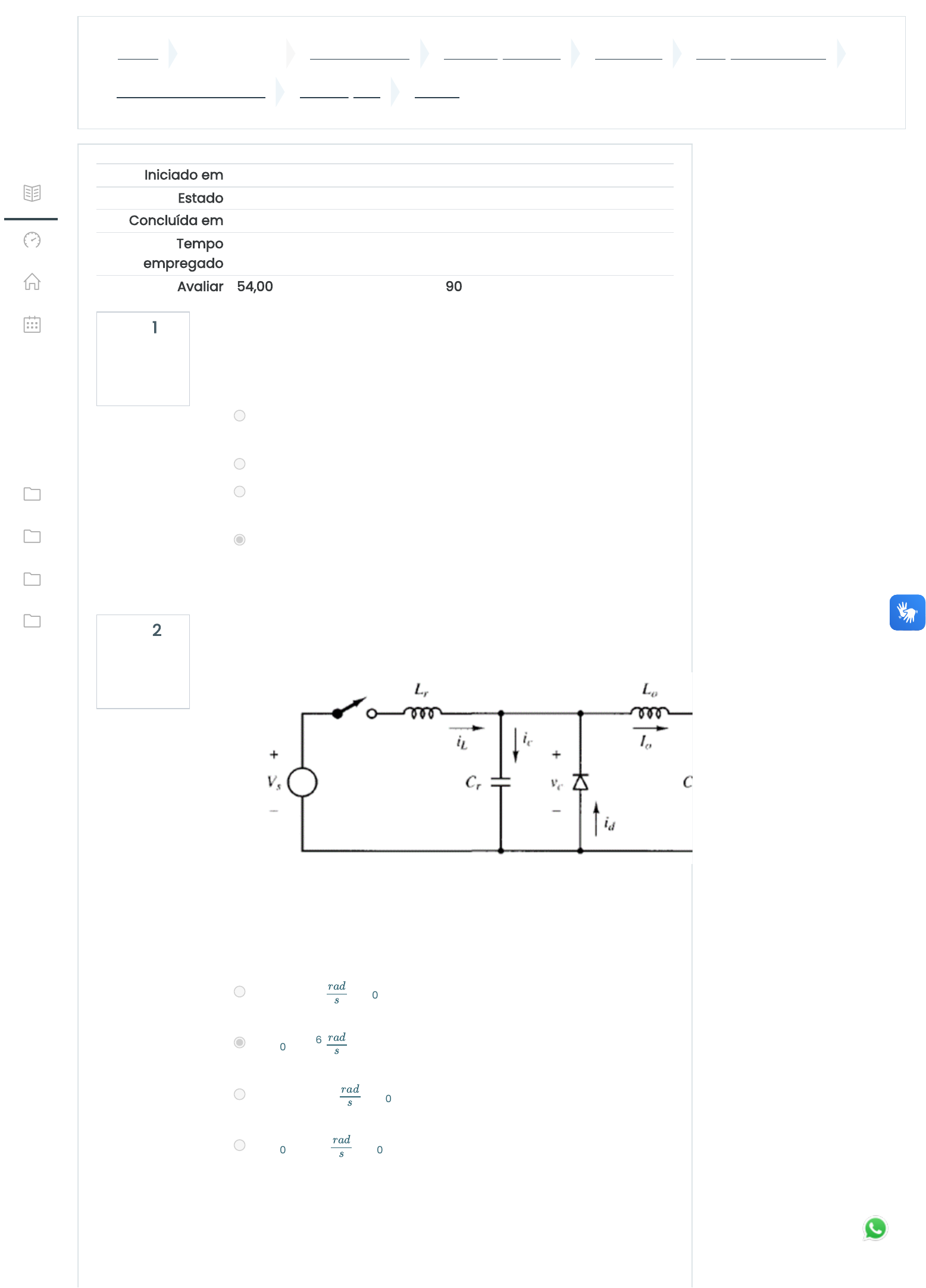 Painel Meus cursos CURSOS FUNEC Graduação - EAD Aluno EAD JUNÇÕES DE TURMA Eletrônica de Potência AVALIAÇÕES PROVA Questão 1 Completo Atingiu 3,00 de 3,00 Questão 2 Completo Atingiu 3,00 de 3,00 Iniciado em Wednesday, 20 Mar 2024, 13:26 Estado Finalizada Concluída em Wednesday, 20 Mar 2024, 14:00 Tempo empregado 34 minutos 2 segundos Avaliar 54,00 de um máximo de 60,00(90%) Marque a alternativa correta, sabendo que, um tiristor do tipo SCR, ou seja, retificador controlado de silício: Escolha uma opção: a. em condição normal de operação, pode ser atravessado por correntes de mesma magnitude nos dois sentidos. b. normalmente possui quatro terminais. c. é utilizado com mais frequência em circuitos de baixas correntes. d. não pode ter sua corrente bloqueada por ação própria após ser polarizado diretamente e disparado. Considere um conversor Buck quase-ressonante, ZCS como apresentado na figura. Considere: E = V = 12V; C = 0,1μF; L = 10μH; I = 1A e f = 100kHz. Se a corrente de comutação do circuito for zero. Os valores para ω e Z são, respectivamente: Escolha uma opção: a. ω = 10 e Z = 4,61Ω b. ω = 10 e Z = 10Ω c. ω = 1x 10 e Z = 6Ω d. ω = 4,61 e Z = 10Ω s r r 0 s 0 0 0 6 rad s 0 0 6 rad s 0 0 6 rad s 0 0 rad s 0 https://ava.funec.br/my/ https://ava.funec.br/course/index.php?categoryid=10 https://ava.funec.br/course/index.php?categoryid=17 https://ava.funec.br/course/index.php?categoryid=19 https://ava.funec.br/course/index.php?categoryid=77 https://ava.funec.br/course/view.php?id=1711 https://ava.funec.br/course/view.php?id=1711#section-6 https://ava.funec.br/mod/quiz/view.php?id=27118 javascript:void(0); https://ava.funec.br/user/index.php?id=1711 https://ava.funec.br/badges/view.php?type=2&id=1711 https://ava.funec.br/admin/tool/lp/coursecompetencies.php?courseid=1711 https://ava.funec.br/grade/report/index.php?id=1711 https://ava.funec.br/my/ https://ava.funec.br/?redirect=0 https://ava.funec.br/calendar/view.php?view=month&course=1711 javascript:void(0); https://ava.funec.br/user/files.php https://ava.funec.br/course/view.php?id=2011 https://ava.funec.br/course/view.php?id=2012 https://ava.funec.br/course/view.php?id=757 https://ava.funec.br/course/view.php?id=1328 https://ava.funec.br/course/view.php?id=957 https://ava.funec.br/course/view.php?id=1711 https://ava.funec.br/course/view.php?id=692 https://ava.funec.br/course/view.php?id=1263 https://ava.funec.br/course/view.php?id=1609 https://ava.funec.br/course/view.php?id=1261 https://ava.funec.br/my/ Questão 3 Completo Atingiu 3,00 de 3,00 Questão 4 Completo Atingiu 3,00 de 3,00 Um conversor Buck – Boost, está operando a uma razão cíclica de 70%, quando uma tensão de entrada de 5 V está sendo aplicada. Para essa configuração é correto dizer que a tensão de saída será: Escolha uma opção: a. V = 3,5 V b. V = 11,7 V c. V = 14,4 V d. V = 10,8 V out out out out Enumere a coluna , relacionando os dispositivos semicondutores de potência com as respectivas características indicadas a seguir: 1. Dispositivo de três terminais que apresenta entrada em condução controlada por gatilho e bloqueio não controlado. 2. Tiristor bidirecional. 3. Transistor de potência que conjuga vantagens dos transistores de junção e de efeito de campo. 4. Tiristor com bloqueio controlado por gatilho. ( ) TRIAC. ( ) SCR. ( ) GTO. ( ) IGBT. Assinale a alternativa que apresenta a numeração correta na coluna anterior, de cima para baixo. Escolha uma opção: a. 1 – 4 – 2 – 3 b. 2 – 1 – 3 – 4 c. 2 – 1 – 4 – 3 d. 1 – 2 – 3 – 4 javascript:void(0); https://ava.funec.br/user/index.php?id=1711 https://ava.funec.br/badges/view.php?type=2&id=1711 https://ava.funec.br/admin/tool/lp/coursecompetencies.php?courseid=1711 https://ava.funec.br/grade/report/index.php?id=1711 https://ava.funec.br/my/ https://ava.funec.br/?redirect=0 https://ava.funec.br/calendar/view.php?view=month&course=1711 javascript:void(0); https://ava.funec.br/user/files.php https://ava.funec.br/course/view.php?id=2011 https://ava.funec.br/course/view.php?id=2012 https://ava.funec.br/course/view.php?id=757 https://ava.funec.br/course/view.php?id=1328 https://ava.funec.br/course/view.php?id=957 https://ava.funec.br/course/view.php?id=1711 https://ava.funec.br/course/view.php?id=692 https://ava.funec.br/course/view.php?id=1263 https://ava.funec.br/course/view.php?id=1609 https://ava.funec.br/course/view.php?id=1261 https://ava.funec.br/my/ Questão 5 Completo Atingiu 3,00 de 3,00 Questão 6 Completo Atingiu 3,00 de 3,00 Segundo as definições dos circuitos de disparo de tiristores e circuitos de controle de potência, qual das opções abaixo está correta? Escolha uma opção: a. Na sincronização do retificador monofásico de onda completa, a cada semiciclo um pulso de comando é levado aos quatro tiristores, sendo que somente aquele que estiver inversamente polarizado entrará em condução. b. A ponte trifásica completa é empregada quando se deseja a atuação em dois quadrantes, sendo que esta opera como retificador para ângulos de disparo compreendidos entre 0 e 90° e opera como inversor entre os ângulos de 90° e 180°. c. O objetivo do estágio de ataque de um circuito de disparo de tiristores é atacar o tiristor com características de fonte de tensão e impedir que uma tensão positiva atinja a junção gatilho-catodo. d. A ponte trifásica completa é empregada quando se deseja a atuação em quatro quadrantes, em que a emissão de distorção harmônica depende da relação direta entre o torque resistente e o entreferro da máquina elétrica acionada. Um conversor ponte completa PWM senoidal está sendo alimentado por uma tensão de entrada de 100V. Se a razão cíclica desse conversor for de 80%, a tensão de pico na saída será: Escolha uma opção: a. V =190 V b. V = 100 V c. V = 10 V d. V = 80 V P P P P javascript:void(0); https://ava.funec.br/user/index.php?id=1711 https://ava.funec.br/badges/view.