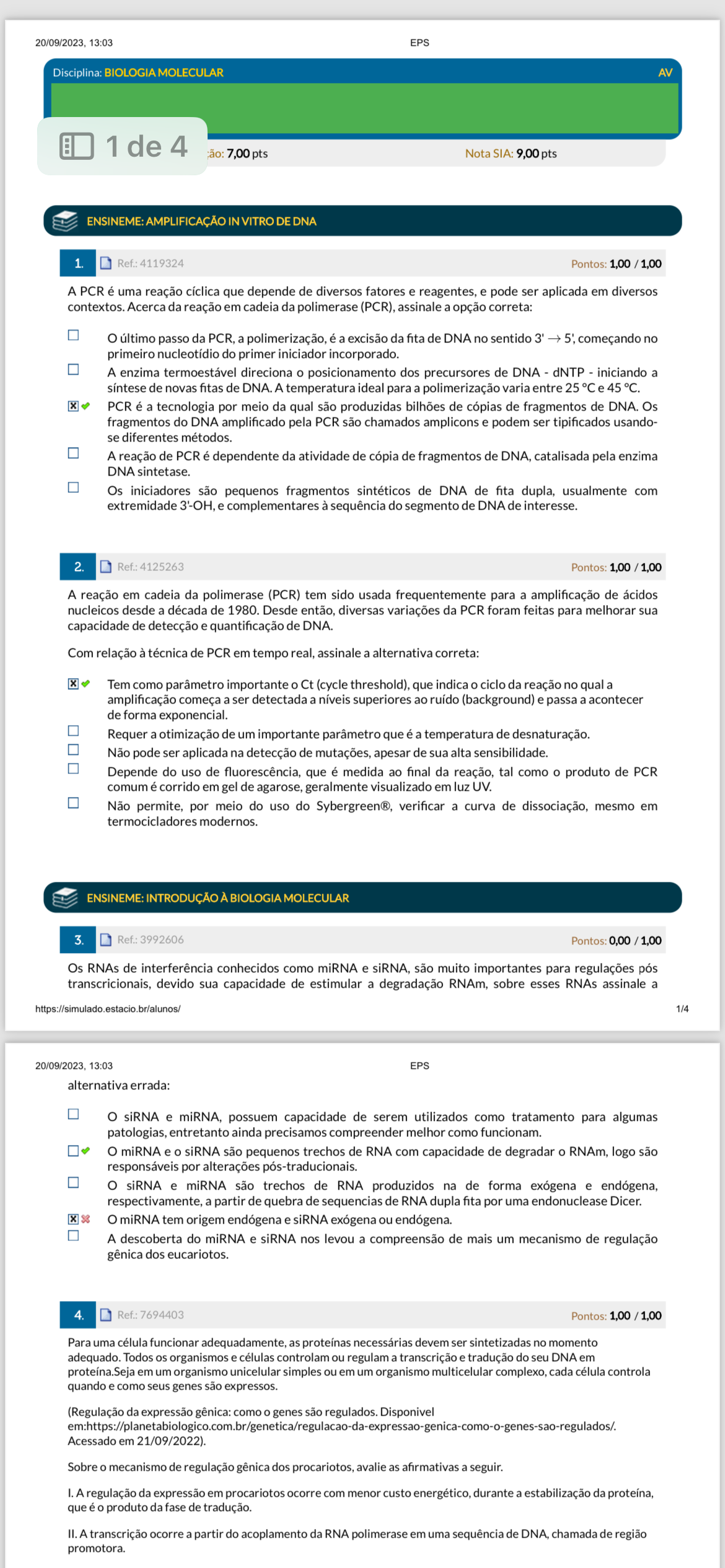 20/09/2023, 13:03 EPS Disciplina: BIOLOGIA MOLECULAR AV 1 de 4 7,00 pts Nota SIA: 9,00 pts ENSINEME: AMPLIFICAÇÃO IN VITRO DE DNA 1 Ref. 4119324 Pontos: A PCR é uma reação cíclica que depende de diversos fatores e reagentes, e pode ser aplicada em diversos contextos. Acerca da reação em cadeia da polimerase (PCR), assinale a opção correta: último passo da a polimerização, é a excisão da fita de DNA no sentido começando no primeiro nucleotídio do primer iniciador incorporado. A enzima termoestável direciona o posicionamento dos precursores de DNA dNTP iniciando a síntese de novas fitas de DNA. A temperatura ideal para a polimerização varia entre 25 °C e 45 °C. PCR é a tecnologia por meio da qual são produzidas bilhões de cópias de fragmentos de DNA. Os fragmentos do DNA amplificado pela PCR são chamados amplicons e podem ser tipificados usando- se diferentes métodos. A reação de PCR é dependente da atividade de cópia de fragmentos de DNA, catalisada pela enzima DNA sintetase. Os iniciadores são pequenos fragmentos sintéticos de DNA de fita dupla, usualmente com extremidade e complementares à sequência do segmento de DNA de interesse. 2. Ref.: 4125263 Pontos: A reação em cadeia da polimerase (PCR) tem sido usada frequentemente para a amplificação de ácidos nucleicos desde a década de 1980. Desde então, diversas variações da PCR foram feitas para melhorar sua capacidade de detecção e quantificação de DNA. Com relação à técnica de PCR em tempo real, assinale a alternativa correta: Tem como parâmetro importante o Ct (cycle que indica o ciclo da reação no qual a amplificação começa a ser detectada a níveis superiores ao ruído (background) e passa a acontecer de forma exponencial. Requer a otimização de um importante parâmetro que é a temperatura de desnaturação. Não pode ser aplicada na detecção de mutações, apesar de sua alta sensibilidade. Depende do uso de fluorescência, que é medida ao final da reação, tal como o produto de PCR comum é corrido em gel de agarose, geralmente visualizado em luz UV. Não permite, por meio do uso do verificar a curva de dissociação, mesmo em termocicladores modernos. ENSINEME: INTRODUÇÃO À BIOLOGIA MOLECULAR 3. 3992606 Pontos: Os RNAs de interferência conhecidos como miRNA e siRNA, são muito importantes para regulações pós transcricionais, devido sua capacidade de estimular a degradação RNAm, sobre esses RNAs assinale a https://simulado.estacio.br/alunos/ 1/4 13:03 EPS alternativa errada: siRNA e miRNA, possuem capacidade de serem utilizados como tratamento para algumas patologias, entretanto ainda precisamos compreender melhor como funcionam. miRNA e o siRNA são pequenos trechos de RNA com capacidade de degradar o RNAm, logo são responsáveis por alterações pós-traducionais. siRNA e miRNA são trechos de RNA produzidos na de forma exógena e endógena, respectivamente, a partir de quebra de sequencias de RNA dupla fita por uma endonuclease Dicer. miRNA tem origem endógena e siRNA exógena ou endógena. A descoberta do miRNA e siRNA nos levou a compreensão de mais um mecanismo de regulação gênica dos eucariotos. 4. Ref.: 7694403 Pontos: Para uma célula funcionar adequadamente, as proteínas necessárias devem ser sintetizadas no momento adequado. Todos os organismos e células controlam ou regulam a transcrição e tradução do seu DNA em em um organismo unicelular simples ou em um organismo multicelular complexo, cada célula controla quando e como seus genes são expressos. (Regulação da expressão gênica: como o genes são regulados. Acessado em 21/09/2022). Sobre o mecanismo de regulação gênica dos procariotos, avalie as afirmativas a I. A regulação da expressão em procariotos ocorre com menor custo energético, durante a estabilização da proteína, que é o produto da fase de tradução. II. A transcrição ocorre a partir do acoplamento da RNA polimerase em uma sequência de chamada de região promotora.