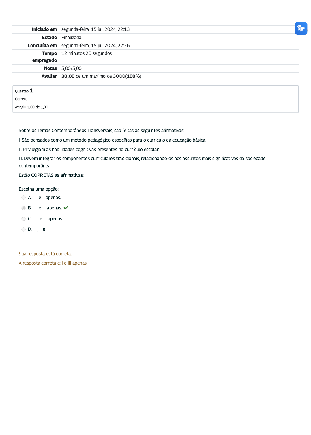 Iniciado em segunda-feira, 15 jul. 2024, 22:13 Estado Finalizada Concluída em segunda-feira, 15 jul. 2024, 22:26 Tempo empregado 12 minutos 20 segundos Notas 5,00/5,00 Avaliar 30,00 de um máximo de 30,00(100%) Questão 1 Correto Atingiu 1,00 de 1,00 Sobre os Temas Contemporâneos Transversais, são feitas as seguintes a�rmativas: I. São pensados como um método pedagógico especí�co para o currículo da educação básica. II. Privilegiam as habilidades cognitivas presentes no currículo escolar. III. Devem integrar os componentes curriculares tradicionais, relacionando-os aos assuntos mais signi�cativos da sociedade contemporânea. Estão CORRETAS as a�rmativas: Escolha uma opção: A. I e II apenas. B. I e III apenas. C. II e III apenas. D. I, II e III. Sua resposta está correta. A resposta correta é: I e III apenas. Questão 2 Correto Atingiu 1,00 de 1,00 Questão 3 Correto Atingiu 1,00 de 1,00 Por meio do programa Aprender Valor, a inclusão da Educação Financeira no currículo escolar busca orientar os estudantes, professores e gestores sobre práticas mais responsáveis e conscientes na vida �nanceira de cada um. Pensando nas ações que o gestor escolar pode promover para o sucesso do programa, marque como verdadeiras (V) ou falsas (F) as a�rmativas a seguir: ( ) Garantir espaço na escola para o debate de projetos transversais que favoreçam o desenvolvimento de competências e habilidades. ( ) Criar as condições e orientar o debate coletivo dos planos de ensino dos professores. ( ) Organizar reuniões para o compartilhamento de ideias e experiências sobre a execução dos projetos escolares com Educação Financeira. ( ) Discutir a organização do trabalho colaborativo para alcançar os objetivos estabelecidos no programa Aprender Valor. A sequência CORRETA de classi�cação é: Escolha uma opção: A. V, V, V, V. B. V, V, V, F. C. F, V, F, V. D. F, F, F, V. Sua resposta está correta. A resposta correta é: V, V, V, V. A Educação Financeira é um dos Temas Contemporâneos Transversais (TCT) propostos pela Base Nacional Comum Curricular (BNCC), que pode ser trabalhado de forma transversal e integrada aos componentes curriculares das escolas brasileiras. Sobre os Temas Contemporâneos Transversais, são feitas as seguintes a�rmações: I. Desde a sua inserção nas referências curriculares brasileiras, os Temas Contemporâneos Transversais se caracterizam por envolver diversos aspectos e fenômenos da vida humana, mas sem extrapolar os conteúdos dos componentes curriculares tradicionais. II. Os TCT oferecem uma possibilidade para que as escolas possam diminuir a distância existente entre o caráter cientí�co do currículo e os diversos assuntos que fazem parte do cotidiano e das características da sociedade brasileira. III. Os TCT privilegiam outros aspectos do desenvolvimento humano, como aqueles relacionados à cidadania, aos valores, às emoções e ao comportamento. Estão CORRETAS as a�rmativas: Escolha uma opção: A. I e II apenas. B. I e III apenas. C. II e III apenas. D. I, II e III. Sua resposta está correta. A resposta correta é: II e III apenas. Questão 4 Correto Atingiu 1,00 de 1,00 Questão 5 Correto Atingiu 1,00 de 1,00 Sobre a relação entre a Educação Financeira e o currículo escolar, marque como verdadeiras (V) ou falsas (F) as assertivas abaixo: ( ) Quando trabalhado na perspectiva da “transversalidade”, o currículo escolar pode promover o desenvolvimento de diversas competências e habilidades previstas na BNCC e na matriz de Educação Financeira. ( ) De acordo com o texto da BNCC, o trabalho com a Educação Financeira pode incorporar diversos outros temas que fazem parte do cotidiano dos estudantes e envolvem conceitos básicos de economia e �nanças, além de trabalhar aspectos do currículo escolar como consumo, trabalho e dinheiro. ( ) Na BNCC, as competências relacionadas ao exercício da cidadania, ao projeto de vida e ao consumo responsável dos estudantes estão em sintonia com as habilidades que fazem parte do escopo da Educação Financeira. ( ) A implementação de competências e habilidades da BNCC por meio inserção da Educação Financeira no currículo escolar deve ser liderada pelos professores de Matemática da escola. A sequência CORRETA de classi�cação é: Escolha uma opção: A. V, F, V, F. B. F, V, V, V. C. V, V, V, F. D. F, V, F, F. Sua resposta está correta. A resposta correta é: V, V, V, F. Em relação ao tema da Educação Financeira e aos componentes curriculares da BNCC, é possível a�rmar que: I. a Educação Financeira pode ser inserida junto aos componentes curriculares das diferentes áreas de conhecimento na escola. II. a Matemática é um dos componentes curriculares que envolvem o tema da Educação Financeira, mas não é o único. III. o tema da Educação Financeira aparece nos demais componentes da BNCC de maneira explícita. Estão CORRETAS as a�rmativas: Escolha uma opção: A. I e II apenas. B. I e III apenas. C. II e III apenas. D. I, II e III. Sua resposta está correta. A resposta correta é: I e II apenas.