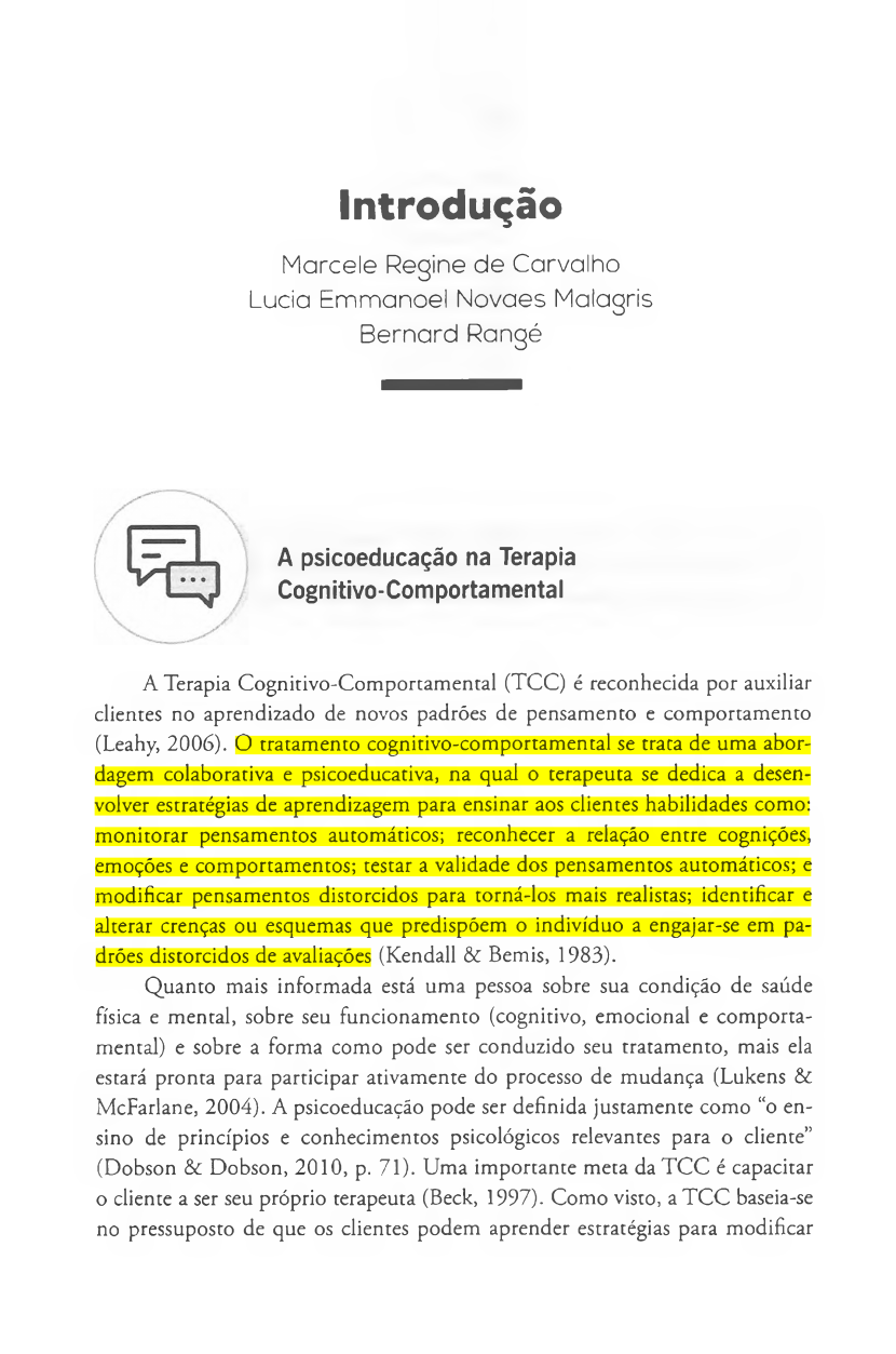 Introdução Marcele Regine de Carvalho Lucia Emmanoel Novaes Malagris Bernard Rangé A psicoeducação na Terapia Cognitivo-Comportamental A Terapia Cognitivo-Comportamental (TCC) é reconhecida por auxiliar clientes no aprendizado de novos padrões de pensamento e comportamento (Leahy, 2006). O tratamento cognitivo-comportamental se trata de uma abor dagem colaborativa e psicoeducativa, na qual o terapeuta se dedica a desen volver estratégias de aprendizagem para ensinar aos clientes habilidades como: monitorar pensamentos automáticos; reconhecer a relação entre cognições, emoções e comportamentos; testar a validade dos pensamentos automáticos; e modificar pensamentos distorcidos para torná-los mais realistas; identificar e alterar crenças ou esquemas que predispõem o indivíduo a engajar-se em pa drões distorcidos de avaliações (Kendall & Bemis, 1983). Quanto mais informada está uma pessoa sobre sua condição de saúde física e mental, sobre seu funcionamento (cognitivo, emocional e comporta- mental) e sobre a forma como pode ser conduzido seu tratamento, mais ela estará pronta para participar ativamente do processo de mudança (Lukens & McFarlane, 2004). A psicoeducação pode ser definida justamente como “o en sino de princípios e conhecimentos psicológicos relevantes para o cliente” (Dobson & Dobson, 2010, p. 71). Uma importante meta da TCC é capacitar o cliente a ser seu próprio terapeuta (Beck, 1997). Como visto, a TCC baseia-se no pressuposto de que os clientes podem aprender estratégias para modificar Gostou? Adquira a versão impressa da obra pelo site da editora: www.sinopsyseditora.com.br INDEX BOOKS GROUPS 16 Introdução pensamentos e crenças, manejar estados emocionais e modificar de forma produtiva seu comportamento (Wright et al., 2008). Os clientes melhoram por meio do tratamento porque eles começam a entender seu funcionamento, a aprender a resolver problemas e a desenvolver um repertório de estratégias que eles mesmos podem aplicar (Beck, 1997). A orientação terapêutica não é especificamente uma intervenção, mas pode interferir no sucesso do trata mento, aumentar a confiança do cliente na abordagem terapêutica e ampliar sua motivação para o tratamento. Esta orientação pode variar quanto ao for mato e método, dependendo das necessidades e metas do cliente na terapia (Dobson & Dobson, 2010). Na psicoeducaçâo em TCC, é essencial que o terapeuta esclareça ao cliente o modelo cognitivo e o processo terapêutico como um todo. O terapeuta tam bém deve ensinar ao cliente as peculiaridades sobre um possível diagnóstico que este possui, ou um problema ou dificuldade que ele apresente (Beck, 1997). Além disso, precisa orientar os clientes a continuarem utilizando o aprendizado adquirido na terapia, mesmo após o seu término, de forma a reduzir o risco de recaída (Wright et al., 2008). A psicoeducaçâo a respeito dos métodos da TCC, dos transtornos mentais ou outras condições de saúde é realizada durante toda a psicoterapia, e não apenas no momento inicial do tratamento. Ao longo do mes mo, ela costuma acontecer em ocasiões da sessão que se mostram boas oportuni dades para exemplificar ou explicar conceitos (Wright et al., 2010). O processo de psicoterapia se torna transparente através da psicoeducaçâo (O’Donohue et al., 2005). Os clientes têm a oportunidade de se familiarizar com o processo psicoterápico de modo a adquirir confiança no terapeuta e no plano de tratamento antes que se dê início às atividades práticas da psicoterapia (Ledley et al., 2011). O conhecimento pode aumentar a sensação de controle sobre os problemas e também auxiliar na mudança cognitiva e no aprendizado de estratégias eficazes para lidar com as dificuldades (Dobson & Dobson, 2010; Wright et al., 2010). O entendimento sobre as dificuldades e formas de trata mento torna mais provável a aceitação e utilização das recomendações do tera peuta (Wright et al., 2010). Os clientes também podem sentir-se validados e esperançosos ao saber que seus problemas são estudados por profissionais, que podem não ser tão incomuns quanto imaginavam e que são passíveis de melhora (Dobson & Dobson, 2010). A psicoeducaçâo pode ainda fortalecer a relação terapêutica por meio da comunicação cuidadosa do terapeuta e de sua demons tração de compreensão, quando o mesmo se mostra familiarizado e confortável Gostou? Adquira a versão impressa da obra pelo site da editora: www.sinopsyseditora.com.br INDEX BOOKS GROUPS Psicoeducação em Terapia Cognitivo-Comportamental 17 em falar sobre os problemas trazidos pelos clientes (Ledley et al., 2011). Como consequência, os clientes podem demonstrar uma maior disponibilidade e abertura para discutir suas necessidades relacionadas ao tratamento (como, por exemplo, pensamentos negativos sobre o uso de medicação), já que, durante a psicoeducação, eles são convidados e capacitados a participar das tomadas de decisão no seu processo de mudança (Wright et al., 2010). Wright e colaboradores (2010) apontam alguns princípios gerais que podem nortear a aplicação da psicoeducação em TCC: (1) a adaptação da psicoeducação à capacidade do cliente de compreender e processar informa ções; (2) o fornecimento de explicações claras e breves, com ênfase colabo- rativa; (3) a utilização de materiais escritos facilitadores; (4) o incentivo à par ticipação do cliente; (5) a solicitação de feedback, de forma a verificar o enten dimento do conteúdo apresentado; e (6) a recomendação de leituras especí ficas, pesquisas ou outras atividades educativas como tarefa de casa, além da consideração sobre o uso de um caderno de terapia ou a criação de um arquivo para a terapia no seu celular (no qual o cliente toma nota do que considerou importante no processo de aprendizagem da psicoterapia, além de também poder anotar as dúvidas que gostaria de esclarecer com seu psicoterapeuta