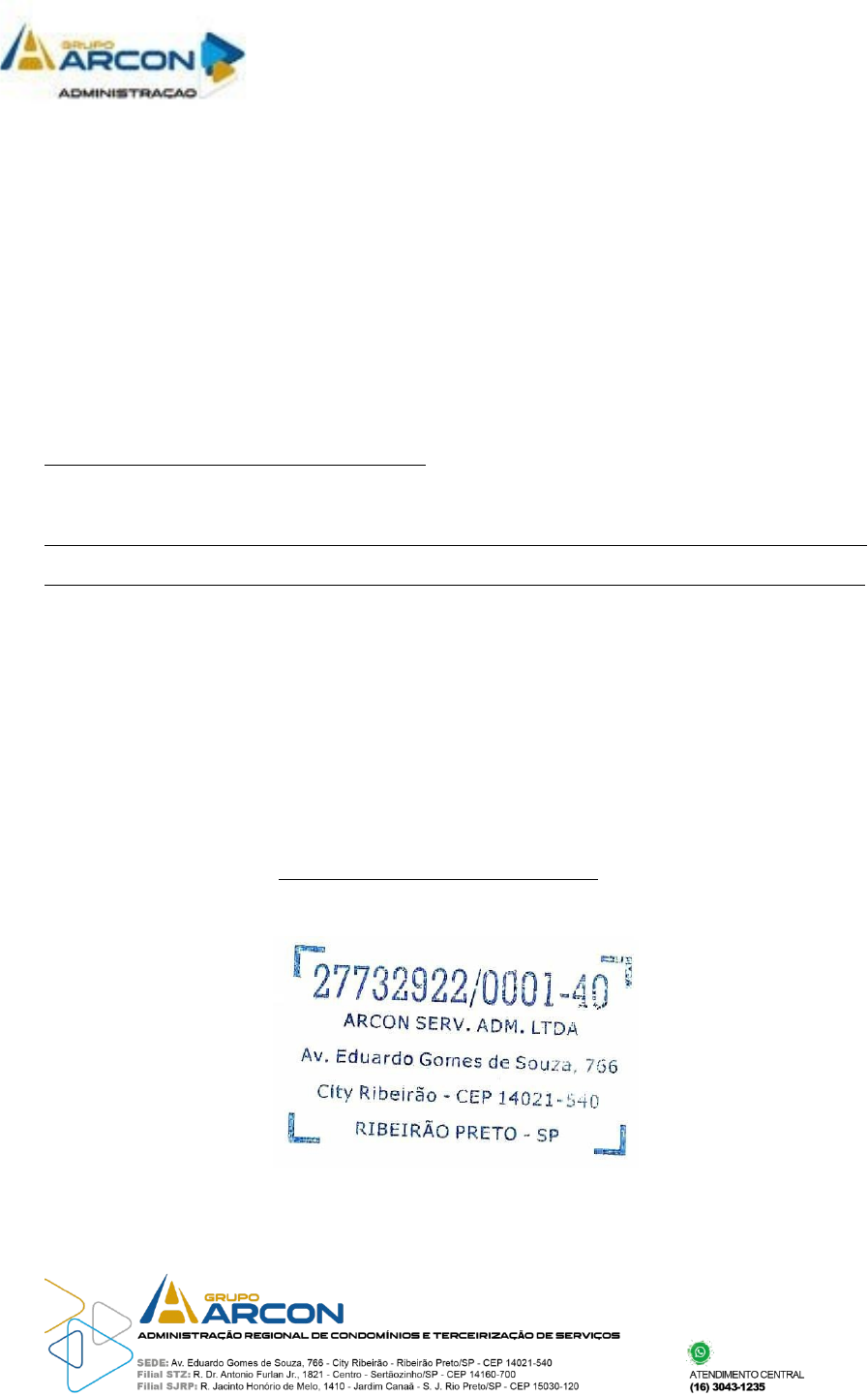 Autorização de visita Autorizamos a entrada de CPF: corretora particular devidamente autorizada pela proprietaria para visita com possiveis clientes para a locação da unidade bloco Apto., do Condomínio Parque Sauipe localizado na Av. José Siena, 645 - Jardim Eldorado, Sertãozinho – SP Essa autorização será válida de até Obs: Devido as normas de segurança do condomínio o corretor(a), deverá orientar o cliente a se identificar na portaria munido de um documento pessoal. Sertãozinho, de de Fernando Santos ARCON - Administração Condominial Ribeirão Preto - (16) 3043-1235 image1.jpeg image2.jpeg image3.png