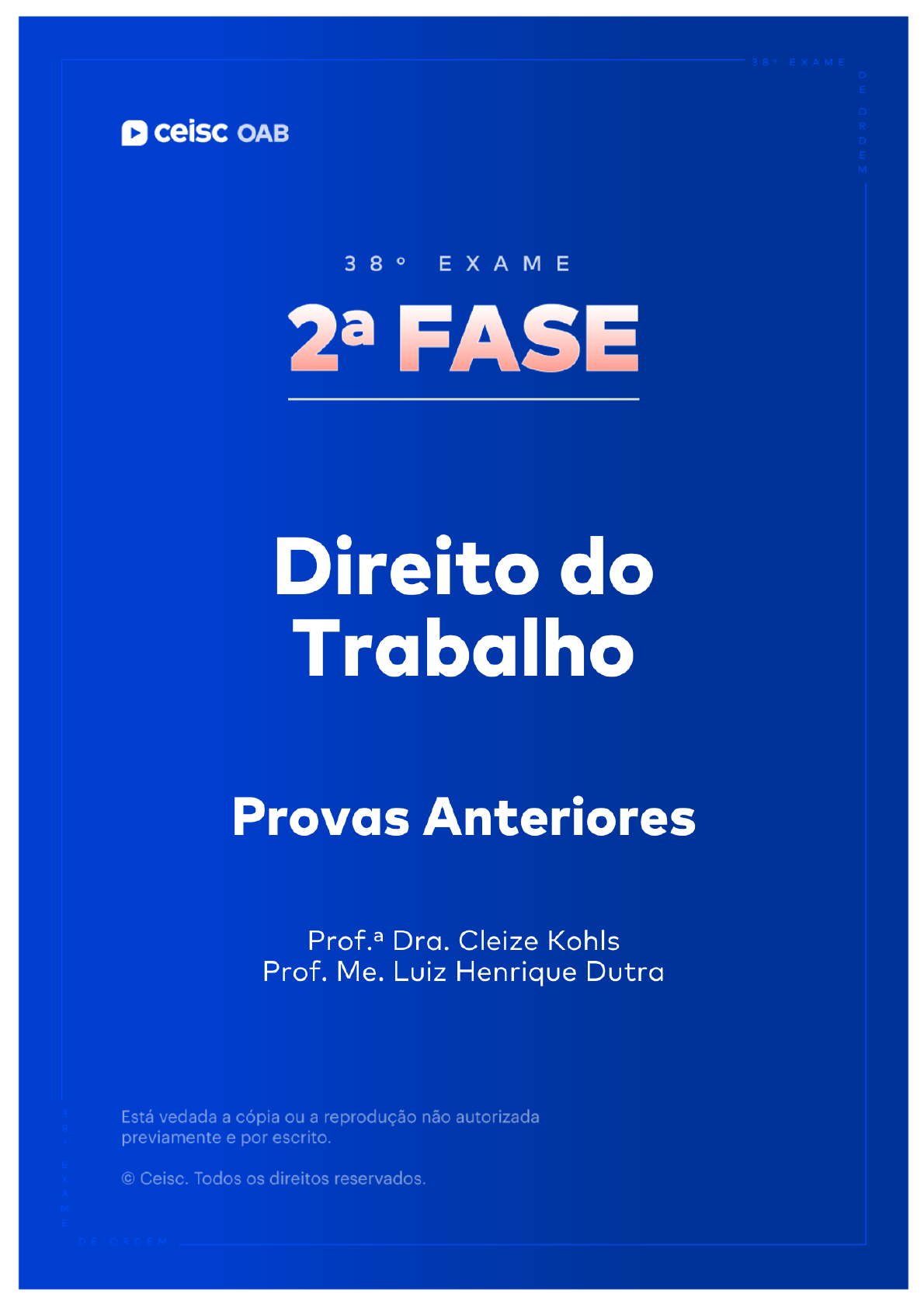1 2 2ª FASE OAB | DIREITO DO TRABALHO | 38º EXAME Provas Anteriores Prof.ª Dra. Cleize Kohls e Prof. Me. Luiz Henrique Dutra SUMÁRIO XVIII EXAME DE ORDEM I Enunciados 4 Resolução da Peça Prática- Profissional 18 Resolução de Questões 22 XX EXAME DE ORDEM I Enunciados 26 Resolução da Peça Prática-Profissional 40 Resolução de Questões 45 XXII EXAME DE ORDEM I Enunciados 49 Resolução da Peça Prática- Profissional 64 Resolução de Questões 71 XXIII EXAME DE ORDEM I Enunciados 75 Resolução da Peça Prática-Profissional 90 Resolução de Questões 96 XXIV EXAME DE ORDEM I Enunciados 100 Resolução da Peça Prática-Profissional 115 Resolução de Questões 121 XXV EXAME DE ORDEM I Enunciados (Reap.) 125 Resolução da Peça Prática-Profisional 139 Resolução das Questões 147 XXVII EXAME DE ORDEM I Enunciados 151 Resolução da Peça Prática-Profisional 165 Resolução das Questões 170 XXVIII EXAME DE ORDEM I Enunciado 174 Resolução da Peça Prática-Profissional 190 Resolução das Questões 196 XXVI EXAME DE ORDEM I Enunciado 200 3 Resolução da Peça Prática-Profissional 215 Resolução de Questões 222 XXX EXAME DE ORDEM I Enunciado 226 Resolução da Peça Prática-Profissional 241 Resolução de Questões 246 Olá, aluno(a). Este material de apoio foi organizado com base nas aulas do curso preparatório para a 2ª Fase OAB e deve ser utilizado como um roteiro para as respectivas aulas. Além disso, recomenda-se que o aluno assista as aulas acompanhado da legislação pertinente. Bons estudos, Equipe Ceisc. Atualizado em junho de 2023. 4 XVIII EXAME DE ORDEM I Enunciados Peça Prática-Profissional (adaptado) Nos autos da reclamação trabalhista 1234, movida por Gilson Reis em face da sociedade empresária Transporte Rápido Ltda., em trâmite perante a 15ª Vara do Trabalho do Recife/PE, a dinâmica dos fatos e os pedidos foram articulados da seguinte maneira: O trabalhador foi admitido em 13/05/2014, recebeu aviso prévio em 09/11/2020, para ser trabalhado, e ajuizou a demanda em 20/04/2021. Exercia a função de auxiliar de serviços gerais. Requereu sua reintegração porque, em 20/11/2020, apresentou candidatura ao cargo de dirigente sindical da sua categoria, informando o fato ao empregador por e-mail, o que lhe garante o emprego na forma do Art. 543, § 3º, da CLT, não respeitada pelo ex-empregador. Que trabalhava de segunda a sexta-feira das 5:00h às 15:00h, com intervalo de duas horas para refeição, jamais recebendo horas extras nem adicional noturno, o que postula na demanda. Que o intervalo interjornada não era observado, daí porque deseja que isso seja remunerado como hora extra. Contratado como advogado (a), você deve apresentar a medida processual adequada à defesa dos interesses da sociedade empresária Transporte Rápido Ltda., sem criar dados ou fatos não informados. (Valor: 5,00) Obs.: a peça deve abranger todos os fundamentos de Direito que possam ser utilizados para dar respaldo à pretensão. A simples menção ou transcrição do dispositivo legal não confere pontuação. Nos casos em que a lei exigir liquidação de valores, não será necessário que o examinando a apresente, admitindo-se que o escritório possui setor próprio ou contratado especificamente para tal fim. 5 6 7 8 9 10 1) Ano: 2016 Banca: FGV Órgão: OAB Prova: XVIII Exame de Ordem Bruno é casado com Amanda, e ambos são empregados da empresa Pequenas Reformas Ltda., como engenheiros – os únicos que a empresa possui para gerenciar as 12 obras de reforma em andamento, sendo que o cronograma de metade delas está em atraso. O casal possui um filho, Rogério, estudante, de 16 anos. Bruno e Amanda foram admitidos na mesma data (10/01/2013), e comunicados por escrito, em 1º de março de 2014, que terão as férias do período 2013/2014 concedidas nos meses de maio (para Bruno) e junho (para Amanda). Cientificados, ambos procuram, no mesmo dia, o setor de Recursos Humanos da empresa alegando que, pela Lei, têm direito ao aproveitamento das férias em conjunto e que desejam transformar 1/3 das férias em dinheiro. O gerente do setor diz que, se saírem juntos, as obras ficarão prejudicadas. Diante do caso apresentado, responda aos itens a seguir. A) Analise se, no caso concreto, é direito de Bruno e Amanda aproveitar as férias em conjunto, uma vez que têm filho estudante menor de 18 anos. Justifique. (0,65) B) Analise, no caso apresentado, se haveria um direito potestativo do casal em impor ao empregador a transformação de 1/3 das férias em dinheiro. Justifique (0,60) 11 12 2) Ano: 2016 Banca: FGV Órgão: OAB Prova: XVIII Exame de Ordem Robson foi contratado para trabalhar na sociedade empresária BCD Ltda. em janeiro de 2005, cumprindo jornada de segunda-feira a sábado, das 7:00h às 18:00h, com pausa alimentar de 30 minutos. Em julho de 2007, Robson foi aposentado por invalidez; em dezembro de 2014, ele ajuizou reclamação trabalhista postulando o pagamento de horas extras de 2005 a 2007. Em defesa, a ré arguiu prescrição parcial, enquanto o autor, que teve vista da defesa, alegou que a prescrição estaria suspensa em razão da concessão do benefício previdenciário. Considerando a situação retratada, e de acordo com a Lei e a jurisprudência consolidada do TST, responda aos itens a seguir. A) Qual das teses prevalecerá em relação à questão da prescrição? Justifique. (0,65) B) Indique a consequência jurídica da aposentadoria por invalidez no contrato de trabalho do autor. Justifique. (0,60) 13 14 3) Ano: 2016 Banca: FGV Órgão: OAB Prova: XVIII Exame de Ordem Plínio foi empregado da sociedade empresária Marca Alimentos S/A. Ele prestou serviços nos estados do Rio de Janeiro, São Paulo e Minas Gerais, residindo hoje neste último. Ao ser dispensado, ajuizou reclamação trabalhista em face da sociedade empresária, a qual foi distribuída a 99ª Vara do Trabalho de Belo Horizonte/MG. Na audiência, a sociedade empresár