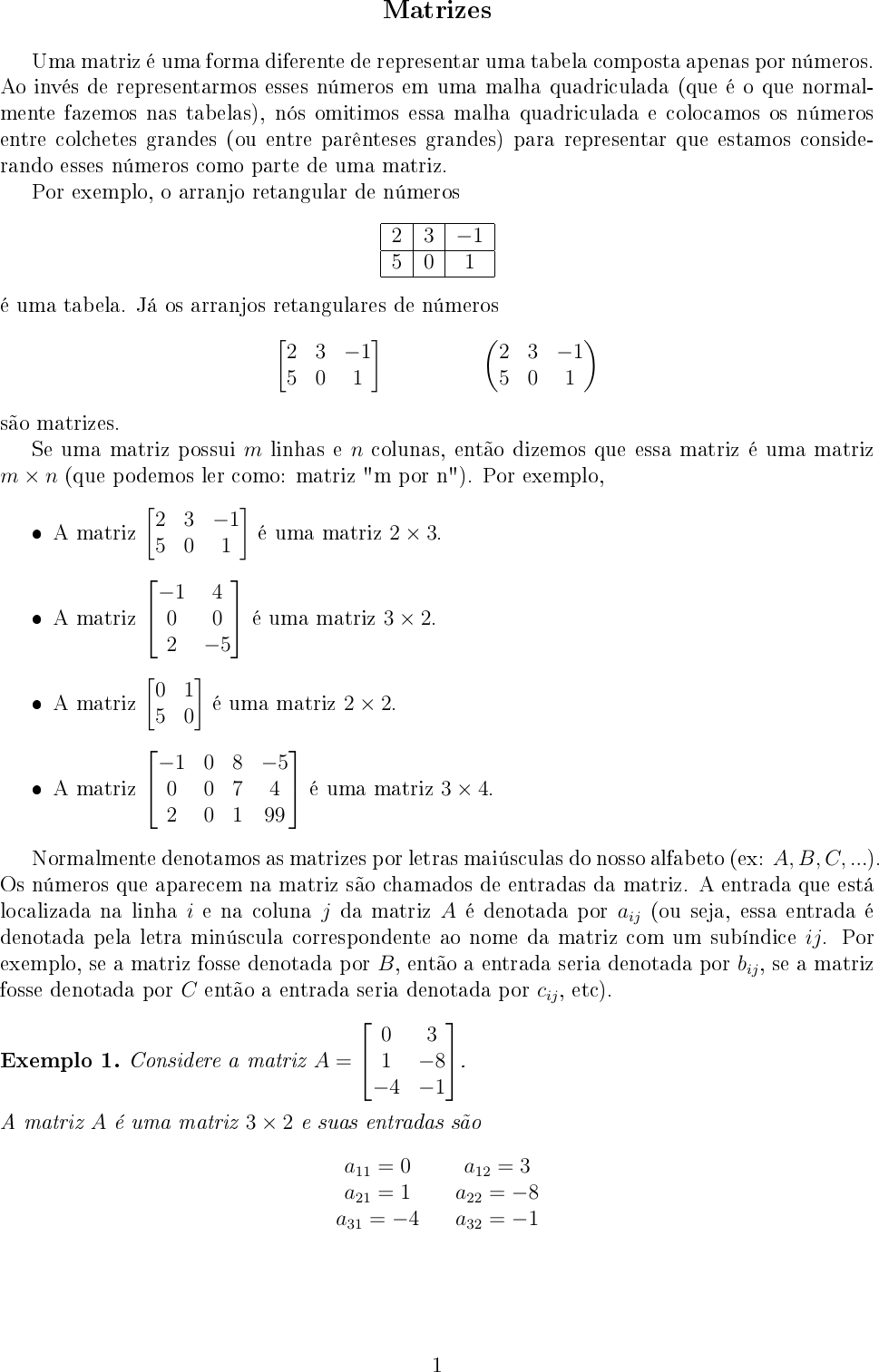 Matrizes Uma matriz é uma forma diferente de representar uma tabela composta apenas por números. Ao invés de representarmos esses números em uma malha quadriculada (que é o que normal- mente fazemos nas tabelas), nós omitimos essa malha quadriculada e colocamos os números entre colchetes grandes (ou entre parênteses grandes) para representar que estamos conside- rando esses números como parte de uma matriz. Por exemplo, o arranjo retangular de números 2 3 −1 5 0 1 é uma tabela. Já os arranjos retangulares de números[ 2 3 −1 5 0 1 ] ( 2 3 −1 5 0 1 ) são matrizes. Se uma matriz possui m linhas e n colunas, então dizemos que essa matriz é uma matriz m× n (que podemos ler como: matriz "m por n"). Por exemplo, � A matriz [ 2 3 −1 5 0 1 ] é uma matriz 2× 3. � A matriz −1 4 0 0 2 −5 é uma matriz 3× 2. � A matriz [ 0 1 5 0 ] é uma matriz 2× 2. � A matriz −1 0 8 −5 0 0 7 4 2 0 1 99 é uma matriz 3× 4. Normalmente denotamos as matrizes por letras maiúsculas do nosso alfabeto (ex: A,B,C, ...). Os números que aparecem na matriz são chamados de entradas da matriz. A entrada que está localizada na linha i e na coluna j da matriz A é denotada por aij (ou seja, essa entrada é denotada pela letra minúscula correspondente ao nome da matriz com um subíndice ij. Por exemplo, se a matriz fosse denotada por B, então a entrada seria denotada por bij, se a matriz fosse denotada por C então a entrada seria denotada por cij, etc). Exemplo 1. Considere a matriz A = 0 3 1 −8 −4 −1 . A matriz A é uma matriz 3× 2 e suas entradas são a11 = 0 a12 = 3 a21 = 1 a22 = −8 a31 = −4 a32 = −1 1 Exemplo 2. Considere a matriz B = 1 −5 5 7 −2 −1 0 0 4 −3 4 7 11 5 0 . A matriz B é uma matriz 3× 5 e suas entradas são b11 = 1 b12 = −5 b13 = 5 b14 = 7 b15 = −2 b21 = −1 b22 = 0 b23 = 0 b24 = 4 b25 = −3 b31 = 4 b32 = 7 b33 = 11 b34 = 5 b35 = 0 Dizemos que duas matrizes A e B são iguais se elas tem o mesmo tamanho e se todas as entradas dessas matrizes são iguais (ou seja, se aij = bij para todo i, j ). Matrizes especiais Matriz quadrada Dizemos que uma matriz A é uma matriz quadrada se a matriz A tiver exatamente a mesma quantidade de linhas e de colunas. Se A for uma matriz m×m, dizemos que A é uma matriz quadrada de ordem m. Se A for uma matriz quadrada, então chamamos a diagonal da matriz constituída dos ele- mentos a11, a22, ..., amm de diagonal principal de A. A outra diagonal é chamada de diagonal secundária de A. Por exemplo, � Se A é uma matriz quadrada de ordem 2, então chamamos a diagonal composta das entradas a11 e a22 de diagonal principal da matriz A e chamamos a diagonal composta das entradas a12 e a21 de diagonal secundária da matriz A. � Se A é uma matriz quadrada de ordem 3, então chamamos a diagonal composta das entradas a11, a22 e a33 de diagonal principal da matriz A e chamamos a diagonal composta das entradas a13, a22 e a31 de diagonal secundária da matriz A. 2 Exemplo 3. Se A é a matriz quadrada de ordem 4 A = 2 3 0 −1 5 7 11 2 25 4 −7 21 0 0 1 8 então a diagonal principal de A e a diagonal secundária de A são Exemplo 4. A matriz A = 1 2 −1 4 1 2 7 2 2 −20 −1 4 −3 2 5 −7 é uma matriz quadrada 4 × 4 cujas entradas da diagonal principal são 1, 2,−1,−7 e cujas entradas da diagonal secundária são 4, 7,−20,−3. Matriz triangular inferior Se A é uma matriz quadrada m×m que satisfaz aij = 0 se i < j (ou seja, se todas as entradas acima da diagonal principal são zero), então dizemos que A é uma matriz triangular inferior. Neste caso, A = a11 0 ... 0 a21 a22 ... 0 ... ... ... ... am1 am2 ... amm Essas matrizes recebem esse nome, porque se nós desenharmos o triângulo retângulo na parte inferior da matriz com a diagonal principal como sendo a hipotenusa, então todas as entradas da matriz que estiverem fora deste triângulo são 0. 3 Exemplo 5. A matriz A = 5 0 0 0 −1 0 0 0 2 −1 8 0 5 4 0 0 é uma matriz triangular inferior 4× 4, pois todas as entradas acima da sua diagonal principal são 0. Matriz triangular superior Se A é uma matriz quadrada m×m que satisfaz aij = 0 se i > j (ou seja, se todas as entradas abaixo da diagonal principal são nulas), então dizemos que A é uma matriz triangular superior. Neste caso, A = a11 a12 ... a1m 0 a22 ... a2m ... ... ... ... 0 0 ... amm Essas matrizes recebem esse nome, porque se nós desenharmos o triângulo retângulo na parte superior da matriz com a diagonal principal como sendo a hipotenusa, então todas as entradas da matriz que estiverem fora deste triângulo são 0. Exemplo 6. A matriz A = 5 1 3 0 9 0 0 0 −7 é uma matriz triangular superior 3× 3, pois todas ss entradas abaixo da sua diagonal principal são 0. 4 Matriz diagonal Se A é uma matriz quadrada m×m que satisfaz aij = 0 se i 6= j (ou seja, se todas as entradas que não fazem parte da diagonal principal forem nulas), então dizemos que A é uma matriz diagonal. Neste caso, A = a11 0 ... 0 0 a22 ... 0 ... ... ... ... 0 0 ... amm Essas matrizes recebem esse nome, porque se nós desenharmos a sua diagonal principal, então todas as entradas da matriz que estiverem fora dessa diagonal são 0. Observe que toda matriz diagonal é tanto triangular inferior quanto triangular superior (pois todas as entradas acima da diagonal principal são 0 e todas as entradas abaixo da diagonal principal também são 0). Exemplo 7. A matriz A = 1 0 0 0 0 0 0 0 −7 é uma matriz diagonal 3 × 3, pois todas as entradas que estão fora da sua diagonal principal são 0. Matriz identidade A matriz diagonal m×m cujas entradas da diagonal principal são todas 1 é chamada de matriz identidade m×m e é denotada por Im. Assim, Im = 1 0 ... 0 0 1 ... 0 ... ... ... ... 0 0 ... 1 Exemplo 8. A matriz I5 = 1 0 0 0 0 0 1 0 0 0 0 0 1 0 0 0 0 0 1 0 0 0 0 0 1 é a matriz identidade 5× 5. 5 Matriz nula Se uma matriz m× n possui todas as entradas 0, então chamamos essa matriz de matriz nula m × n