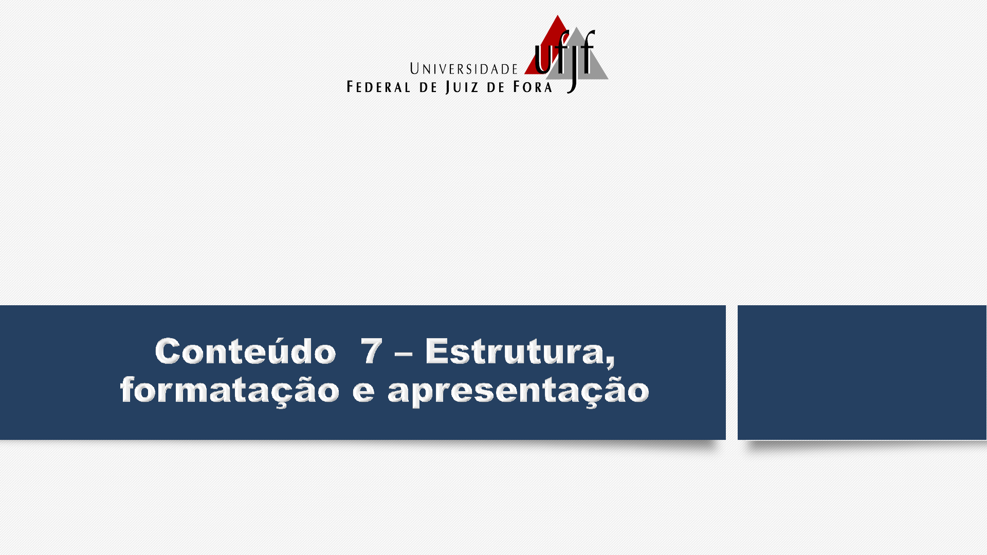 Prof. Dr. Admir Antonio Betarelli Junior Departamento de Ciências Econômicas Disciplina: Técnicas de Pesquisa em Economia – ANE029 Pré-texto Estrutura Texto Pós-Texto Formatação/ Apresentação/dados Trabalhos científicos Monografias Projetos Dissertações Teses Pré-texto Estrutura Texto Pós-Texto Formatação/ Apresentação/dados Elementos do trabalho: NBR 14724 (ABNT, 2011) 1. Parte externa: Capa (obrigatório) Lombada (elemento opcional pela NBR 14724): recomendada para as teses (e.g.). 2. Parte interna Pré-texto: informações de identificação e utilização do trabalho. Texto: introdução, desenvolvimento e conclusão. Pós-texto: complementam o trabalho. Pré-texto Estrutura Texto Pós-Texto Formatação/ Apresentação/dados Pré-texto Estrutura Texto Pós-Texto Formatação/ Apresentação/dados Elementos do trabalho: NBR 14724 (ABNT, 2011) 1.Parte externa: Pré-texto Estrutura Texto Pós-Texto Formatação/ Apresentação/dados Capa (obrigatório) Instituição e curso Título do trabalho Nome do autor Cidade (onde se localiza a instituição) Ano de depósito (data da entrega) A capa das teses, dissertações e dos trabalhos de conclusão de curso deverá ser confeccionada em material rígido, na cor preta e a gravação em dourado. Na capa o espaçamento 1,5 é aplicado somente para o título. Os demais elementos permanece com espaçamento simples. Pré-texto Estrutura Texto Pós-Texto Formatação/ Apresentação/dados Lombada (opcional) Sigla da Instituição, curso e ano Título do trabalho Nome do autor Os elementos da lombada devem ser impressos no sentido vertical, legíveis de cima para baixo. Recomenda-se a reserva de um espaço de 3 cm na borda inferior da lombada, para a colocação de elementos de identificação ou localização do documento E.g.: a etiqueta de localização do documento, recebida na biblioteca. Pré-texto Estrutura Texto Pós-Texto Formatação/ Apresentação/dados Elementos do trabalho: NBR 14724 (ABNT, 2011) 2. Parte interna: Pré-texto Pré-texto Estrutura Texto Pós-Texto Formatação/ Apresentação/dados Ordem das partes do Pré-texto Folha de rosto (obrigatório) Errata (opcional) Folha de aprovação (obrigatório) Dedicatória (opcional) Agradecimentos (opcional) Resumo na língua vernácula (obrigatório) Resumo em língua estrangeira (obrigatório) Lista de ilustrações (opcional) Lista de tabelas (opcional) Lista de abreviatura e siglas (opcional) Lista de símbolos (opcional) Sumário (obrigatório) Pré-texto Estrutura Texto Pós-Texto Formatação/ Apresentação/dados Folha de rosto (obrigatório) Nome do autor, centrado no alto da folha Nota explicativa a 8 cm da margem esquerda. Título do trabalho Cidade e Ano de depósito: centrado na linha Projeto de pesquisa apresentado ao curso de Ciências Econômicas da Universidade Federal de Juiz de Fora, como requisito parcial à obtenção do título de bacharel em Ciências Econômicas. Orientador: Prof. Dr. X e co-orientação do Prof. Dr. Y. Na folha de rosto, a nota explicativa ou descritiva deve ser de espaçamento simples. Pré-texto Estrutura Texto Pós-Texto Formatação/ Apresentação/dados Verso da Folha de rosto: ficha catalográfica Margens são diferentes: Verso: • Superior e direita 3 cm. • Inferior e esquerda 2 cm. 3 cm 2 cm 3 cm 2 cm Deve conter a ficha catalográfica (obrigatório), localizada no terço inferior da página, elaborada conforme o Código de Catalogação Anglo – Americano vigente. A ficha catalográfica é elaborada pelo Setor de Processamento Técnico da Biblioteca. Pré-texto Estrutura Texto Pós-Texto Formatação/ Apresentação/dados Errata (opcional) Enumeração dos erros ocorridos no trabalho com as indicações de páginas e linhas com as devidas correções. Recomenda-se que seja inserida após a folha de rosto. Pré-texto Estrutura Texto Pós-Texto Formatação/ Apresentação/dados Folha de Aprovação (obrigatório) Nota explicativa: natureza (tipo do trabalho, objetivo); nome da instituição a que é submetido; área de concentração. Título do trabalho Data da aprovação Nome do autor, centrado no alto da folha nome completo, titulação e assinatura dos membros da banca examinadora e instituição a que pertencem. A data de aprovação e as assinaturas dos membros da banca examinadora devem ser colocadas após a aprovação do trabalho. A folha de aprovação é, as vezes, fornecida ao aluno pelas secretarias dos cursos de graduação a que estiver vinculado. Pré-texto Estrutura Texto Pós-Texto Formatação/ Apresentação/dados Dedicatória (opcional) Folha na qual o autor presta uma homenagem ou dedica seu trabalho. Não leva título e a dedicatória deve aparecer na parte inferior da página, a 8cm da margem esquerda. Pré-texto Estrutura Texto Pós-Texto Formatação/ Apresentação/dados Agradecimentos (“opcional”) Expressos pelo autor que presta seu reconhecimento às pessoas e instituições que colaboraram na elaboração do seu trabalho. Não leva indicativo numérico e o título deve ser centralizado na folha, utilizando a mesma tipologia das seções primárias do texto. Pré-texto Estrutura Texto Pós-Texto Formatação/ Apresentação/dados Resumo (obrigatório) É a apresentação concisa dos pontos relevantes do texto, fornecendo uma visão rápida e clara do conteúdo do trabalho. Deve ressaltar o objetivo, o método, os resultados e as conclusões do documento. Parágrafo único; verbo na voz ativa e na terceira pessoa do singular. Deve ter uma extensão de 150 a 500 palavras. De 3 a 6 palavras-chave, separadas entre si por ponto. Não leva indicativo numérico e o título é centralizado. RESUMO O presente estudo analisa o relacionamento entre os valores organizacionais e os níveis da síndrome de burnout, em três hospitais universitários do Rio Grande do Norte. Foi desenvolvido com uma amostra de 205 profissionais de saúde, através da aplicação de questionários estruturados. 